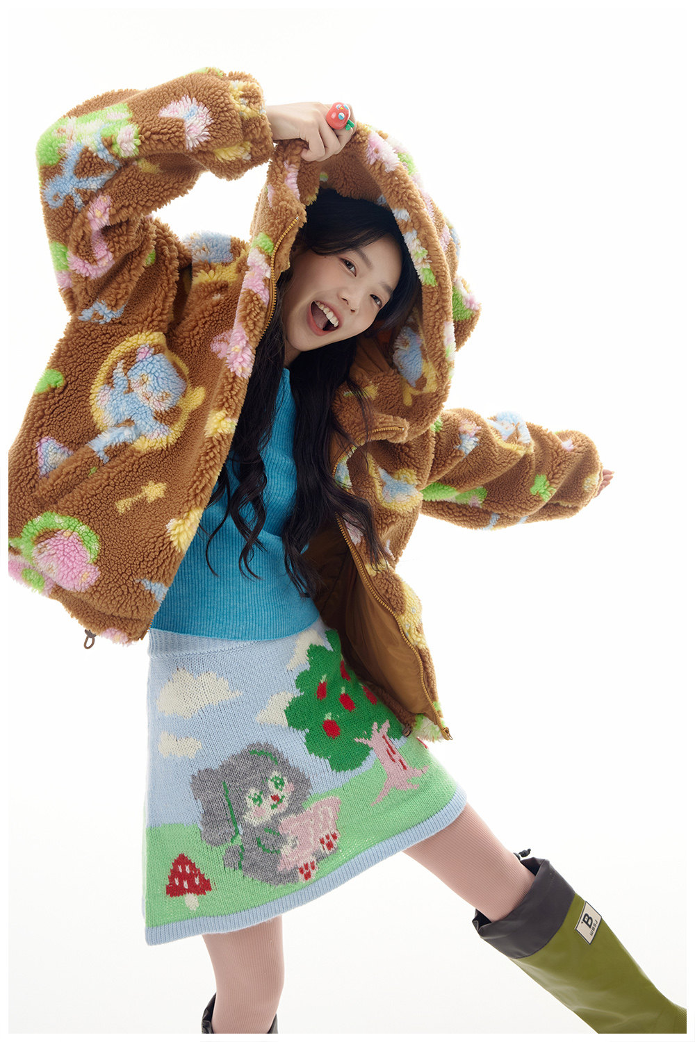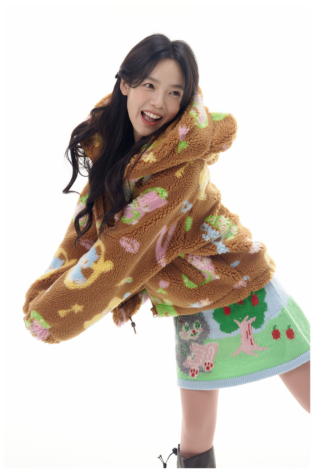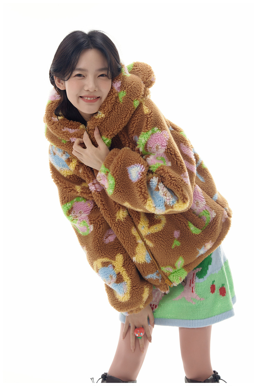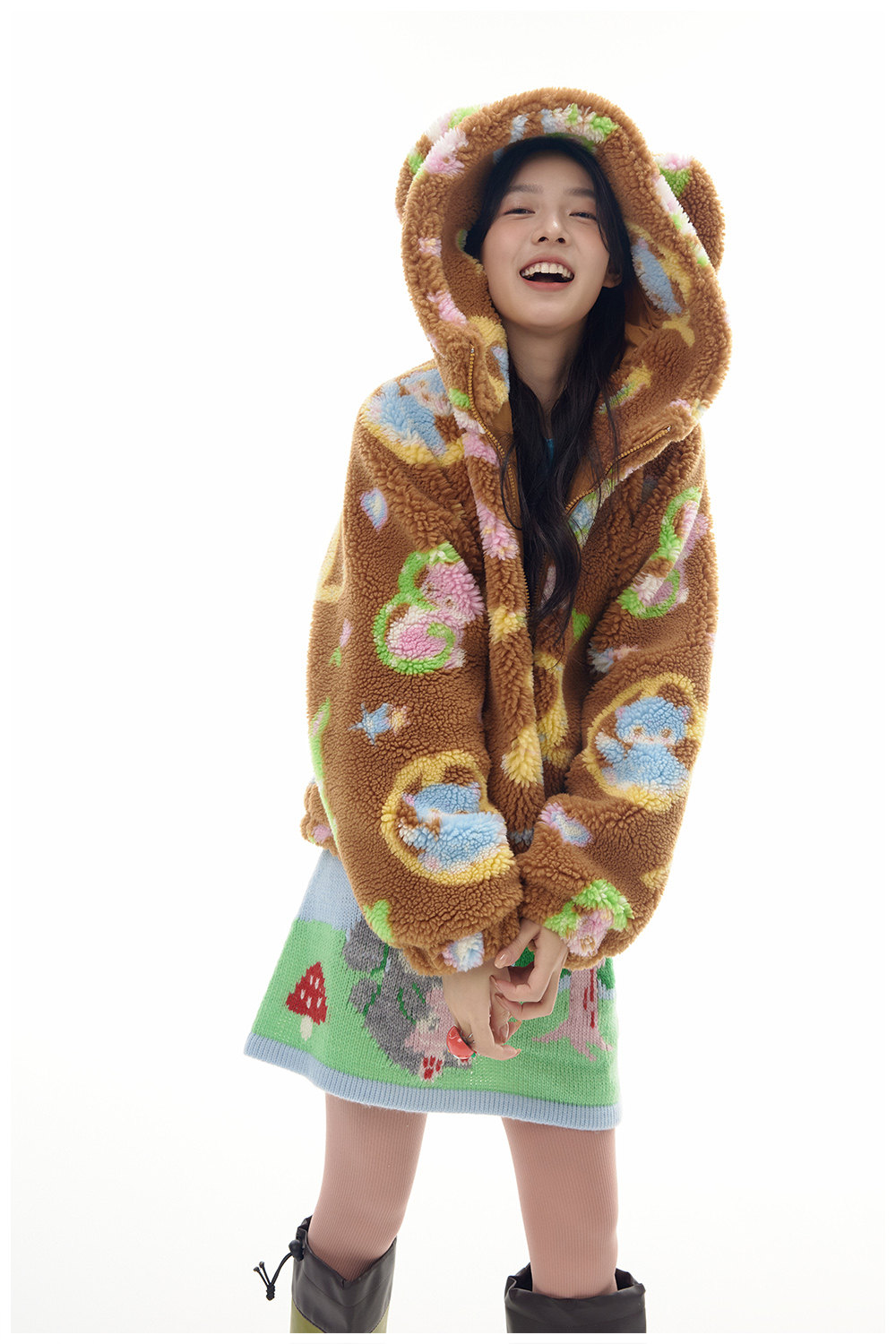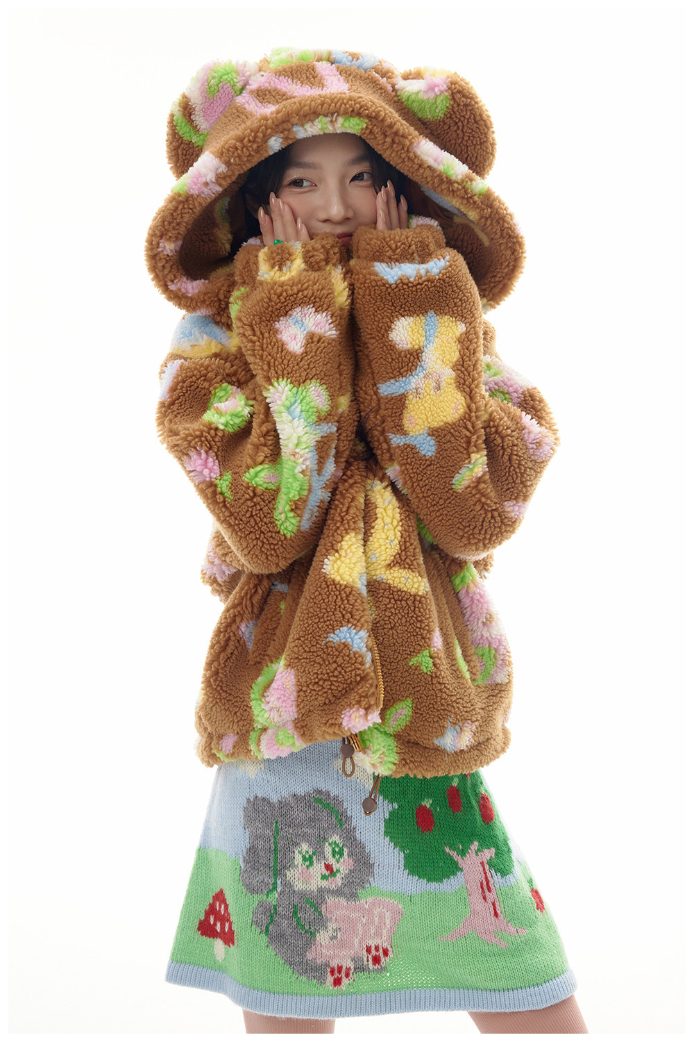 This adorable lamb's wool print coat is custom made to feature a cute brown bear design. Made with high-quality materials, it provides warmth and style for your little one. With a unique and playful touch, this coat is perfect for any occasion.