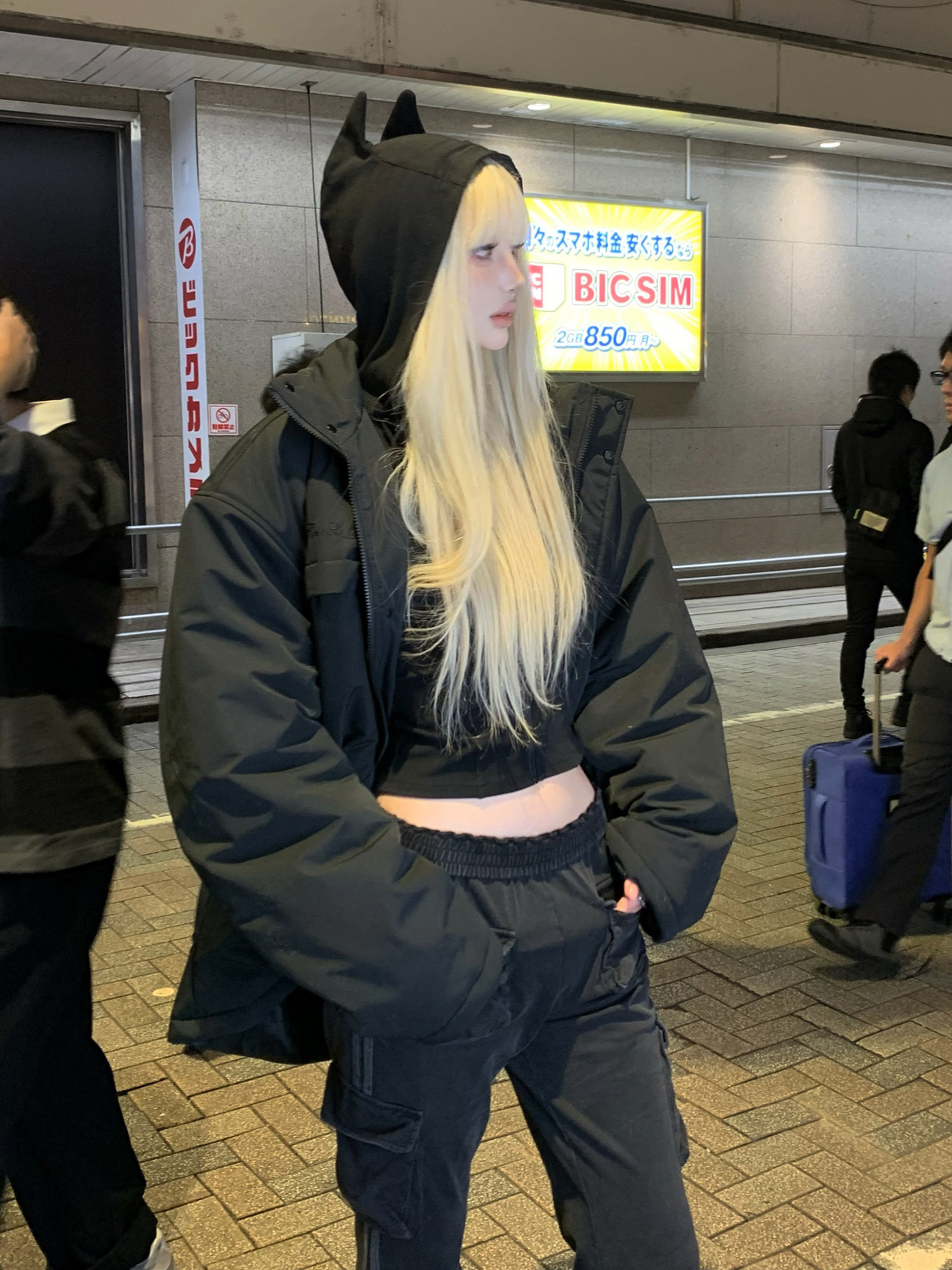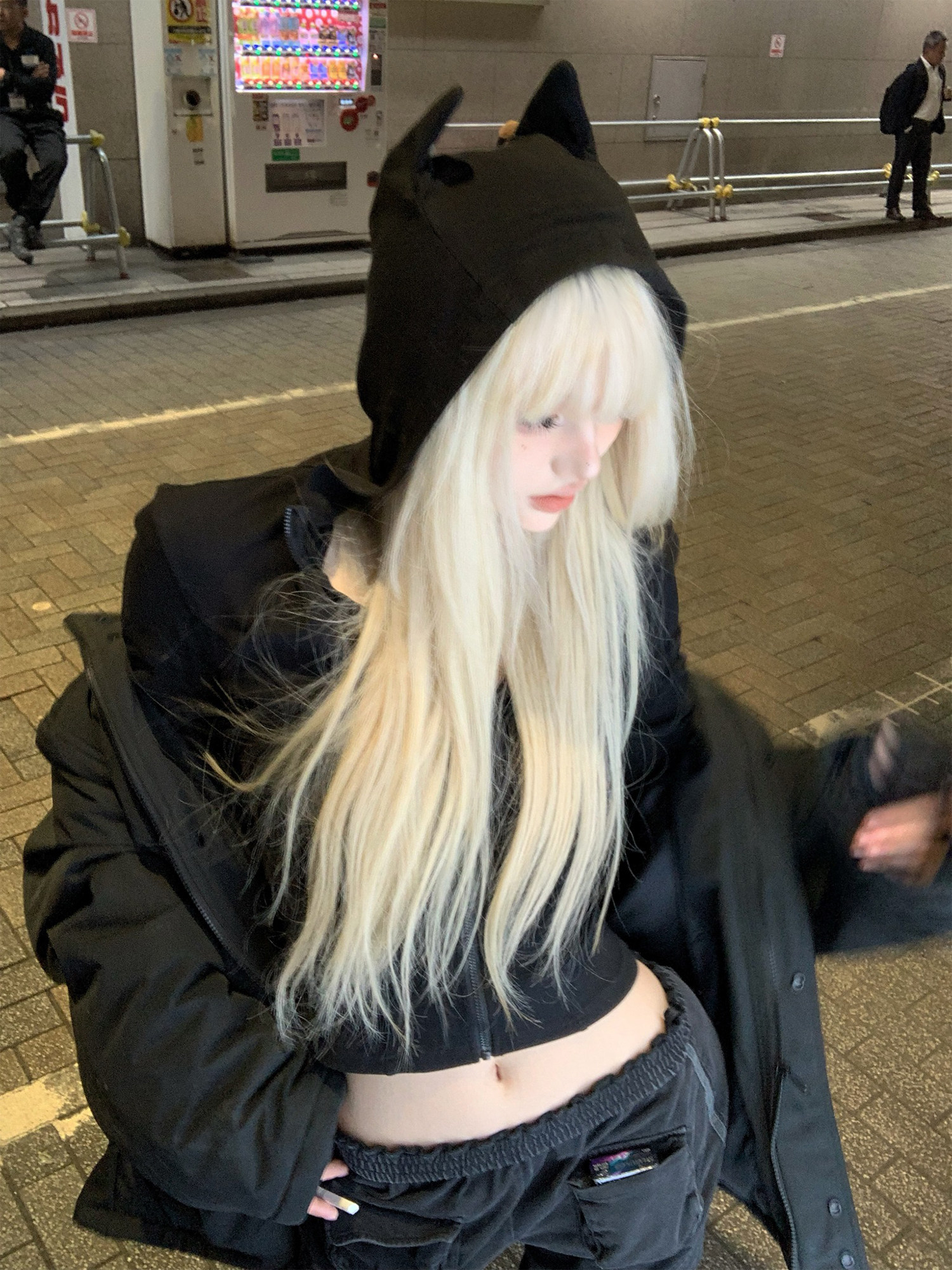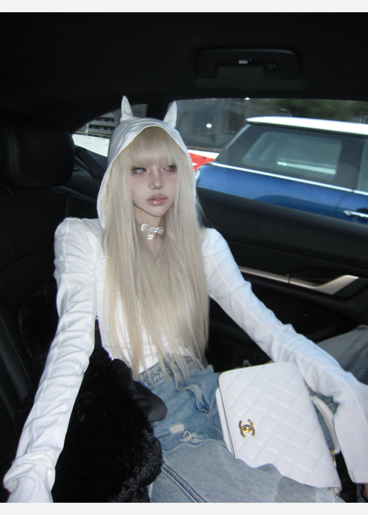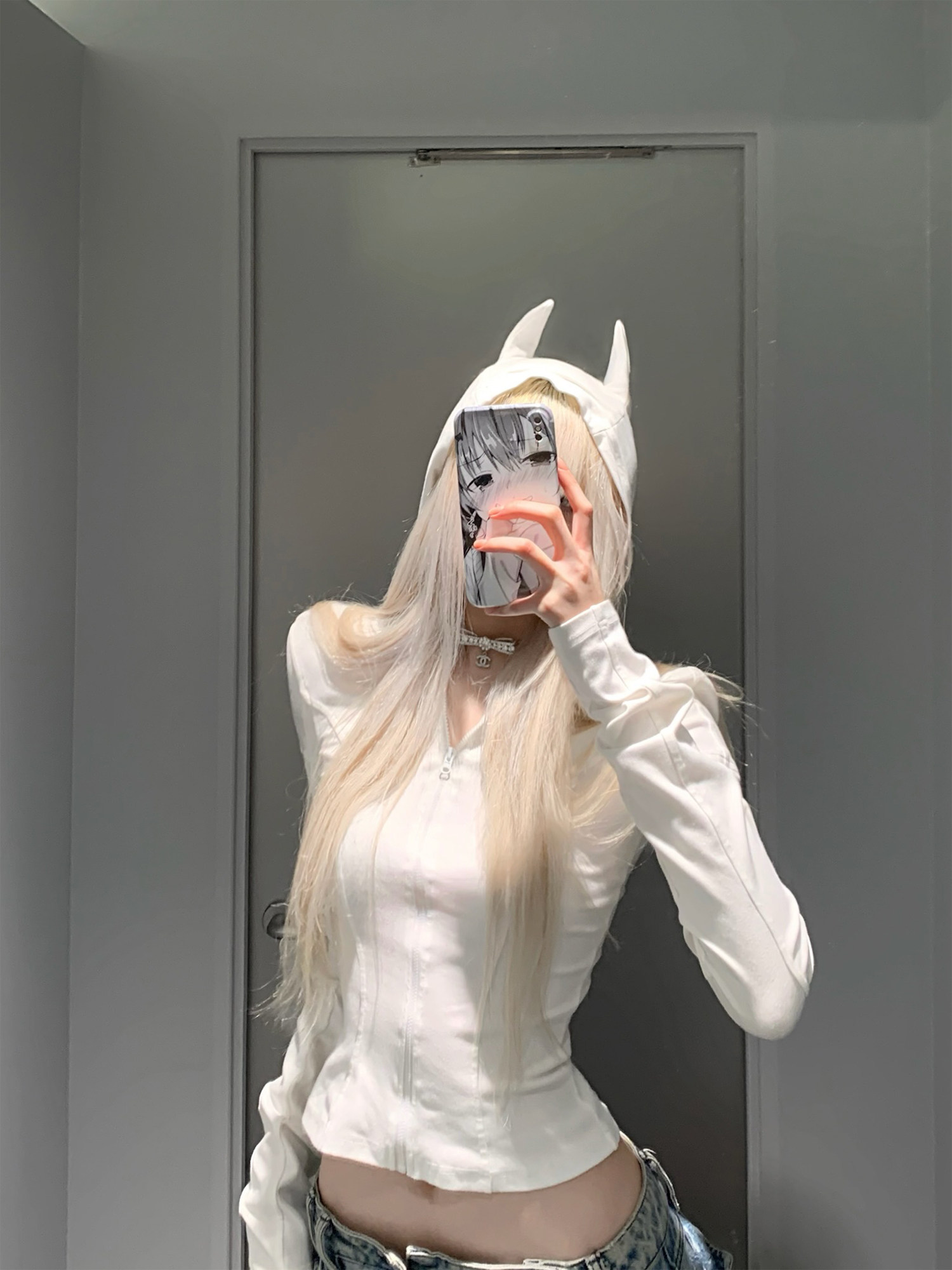 Women's Horned Hooded Base Layer Slim Cropped Long Sleeve T-Shirt