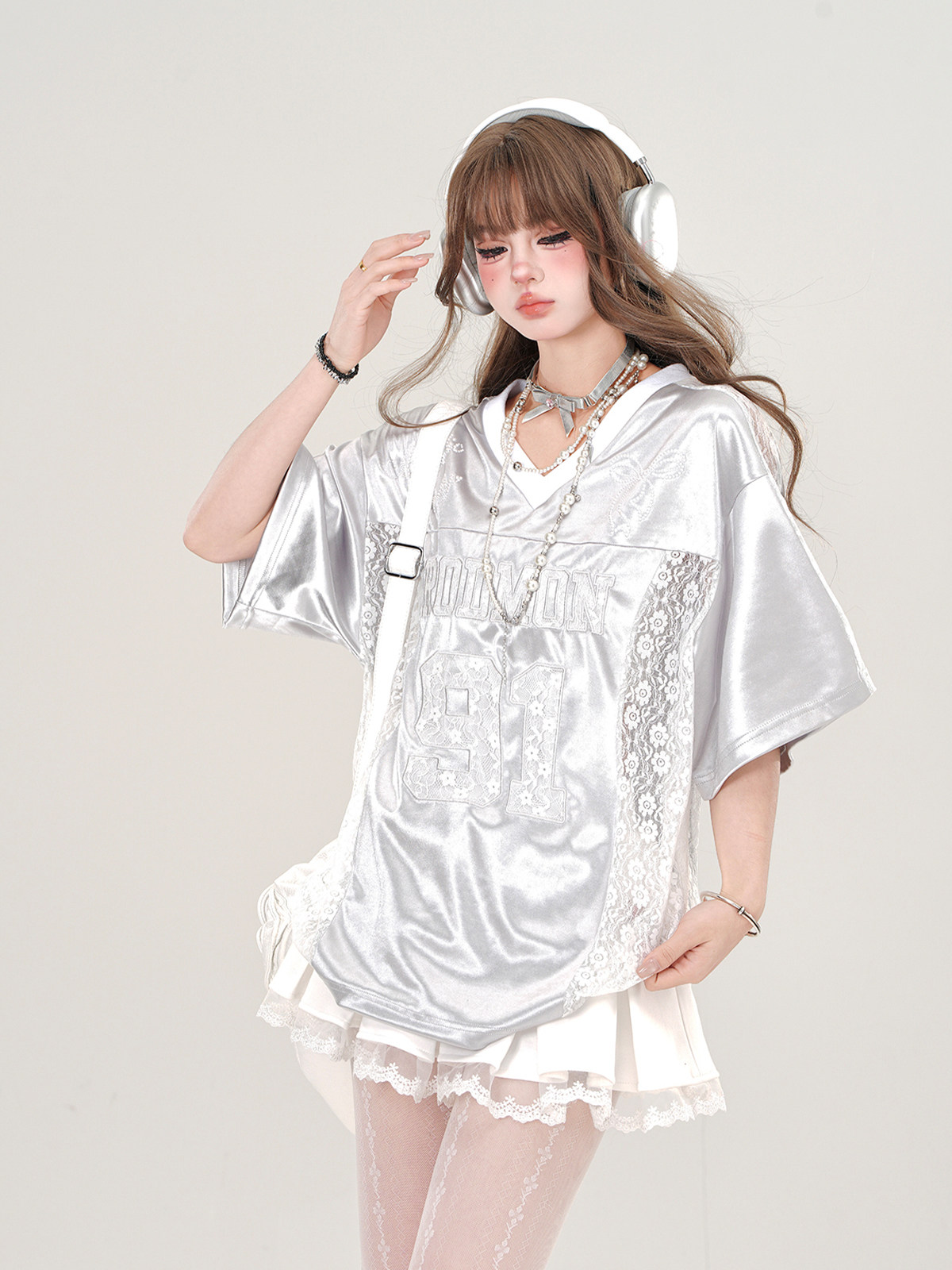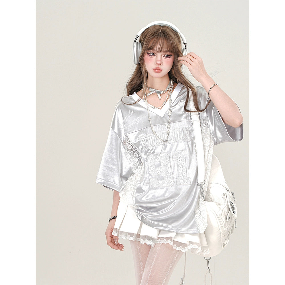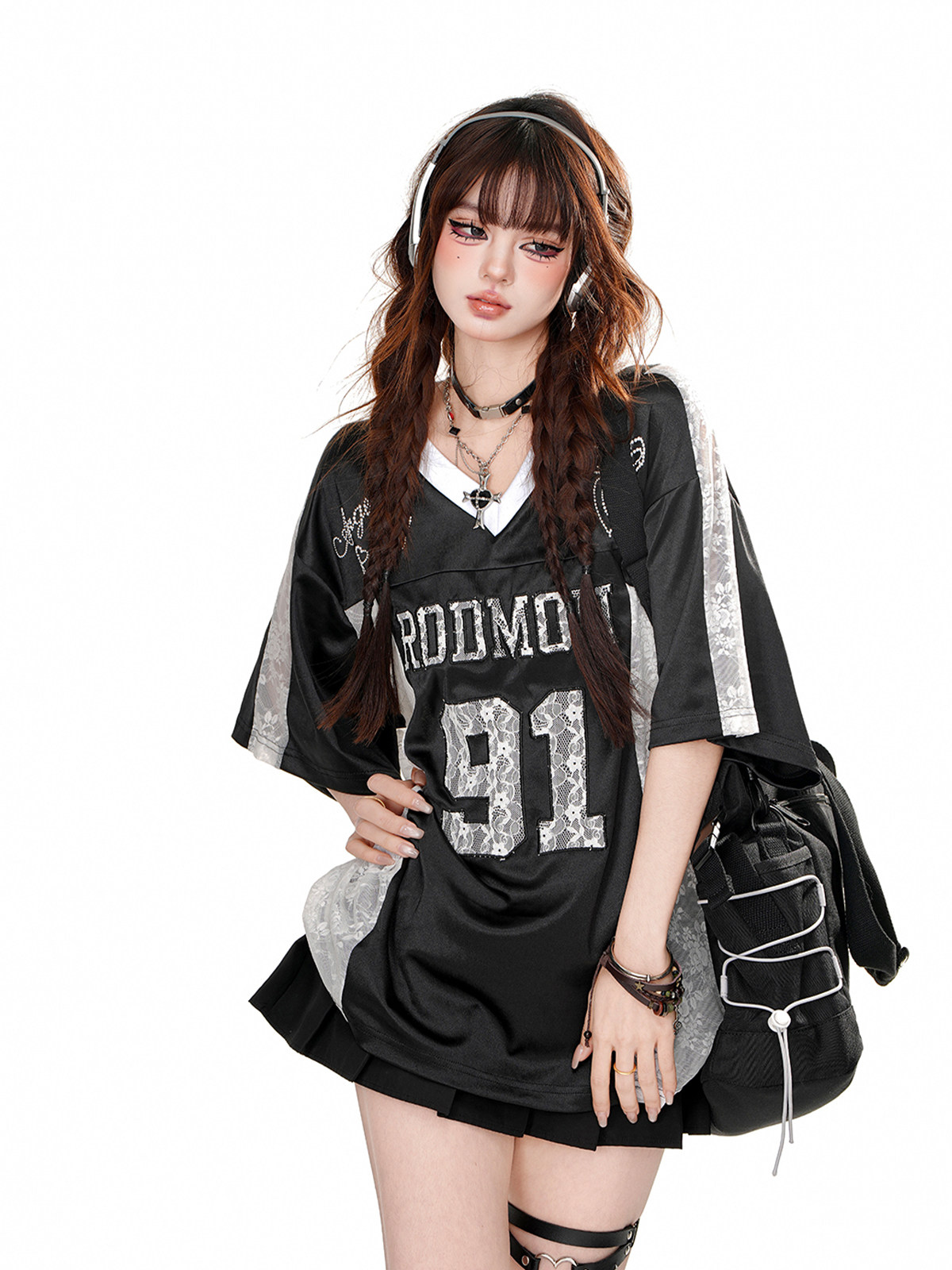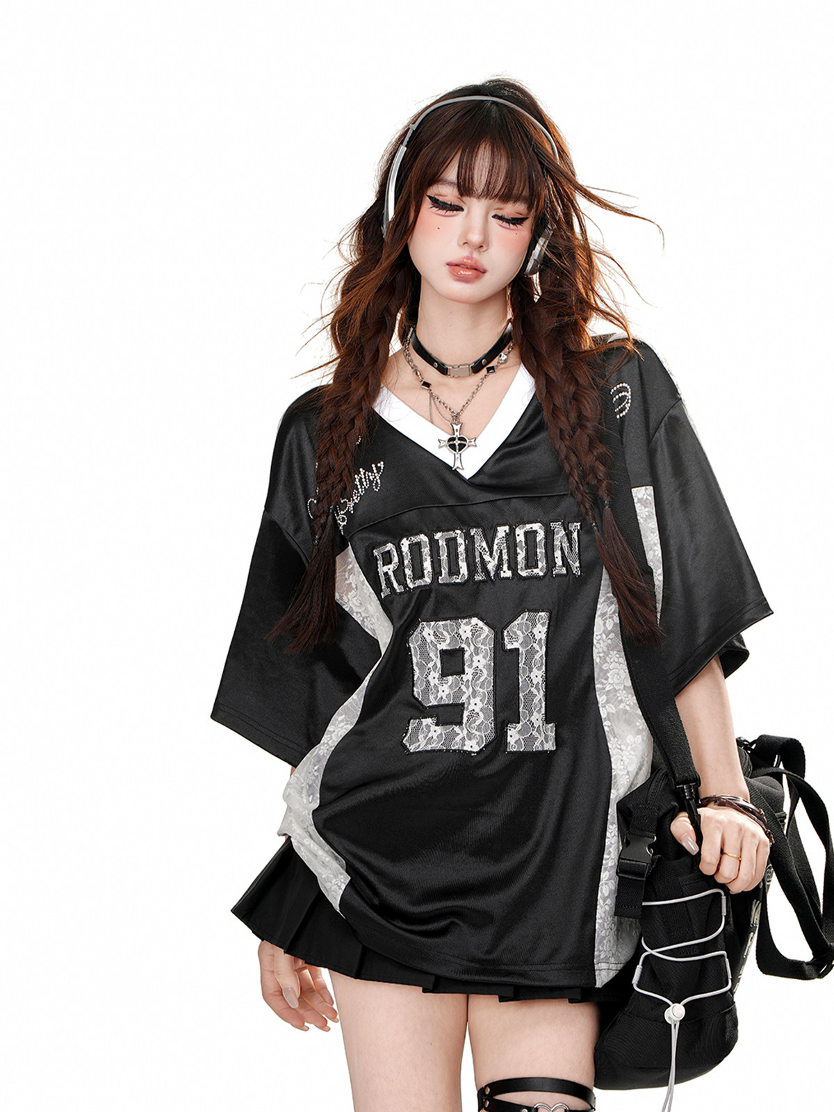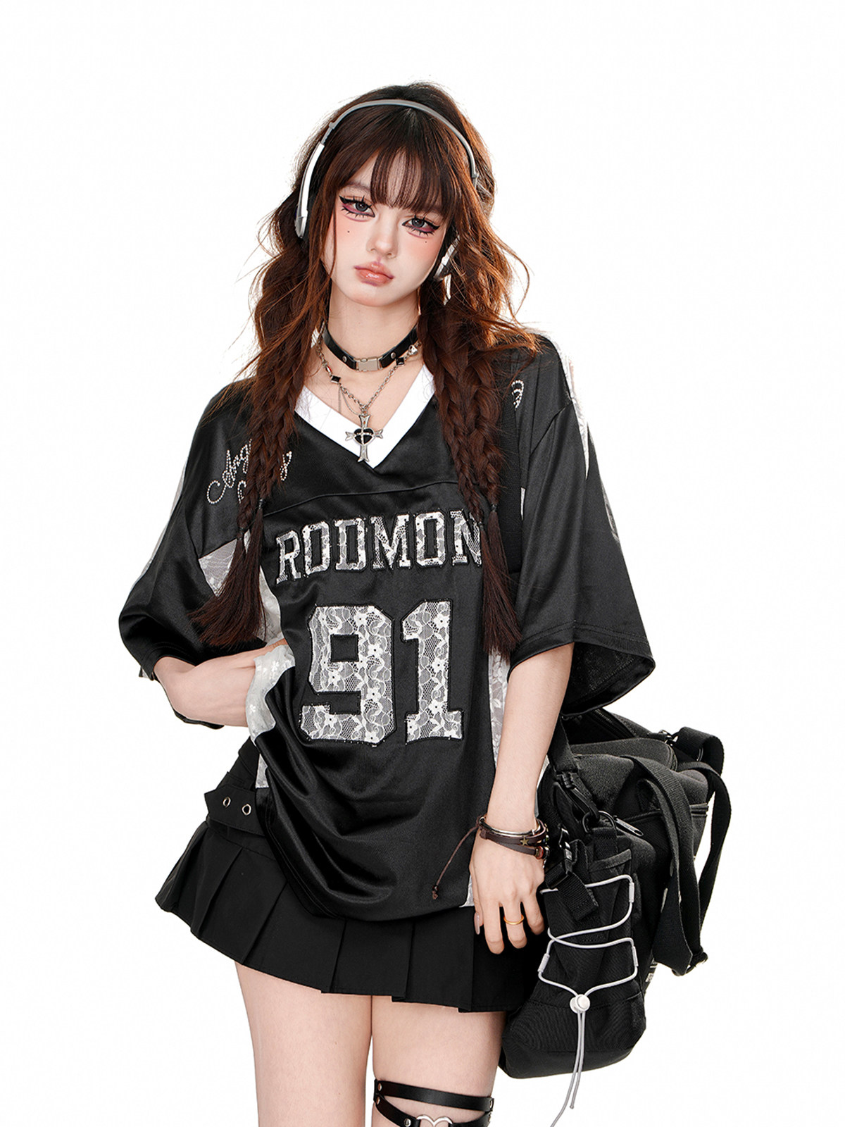 Embroidered V-Neck Shoulder T-Shirt Women's Summer Loose Fit Top