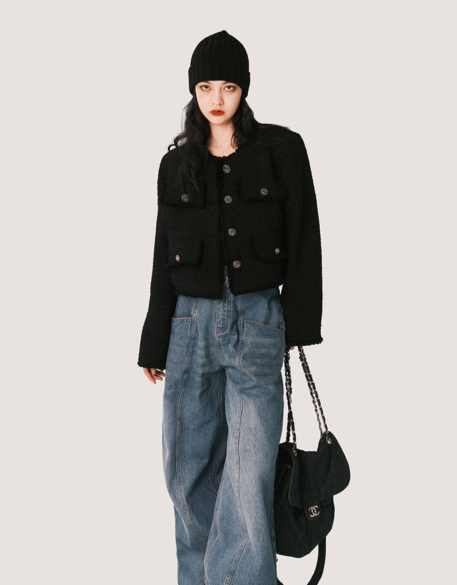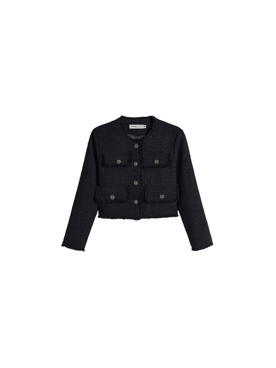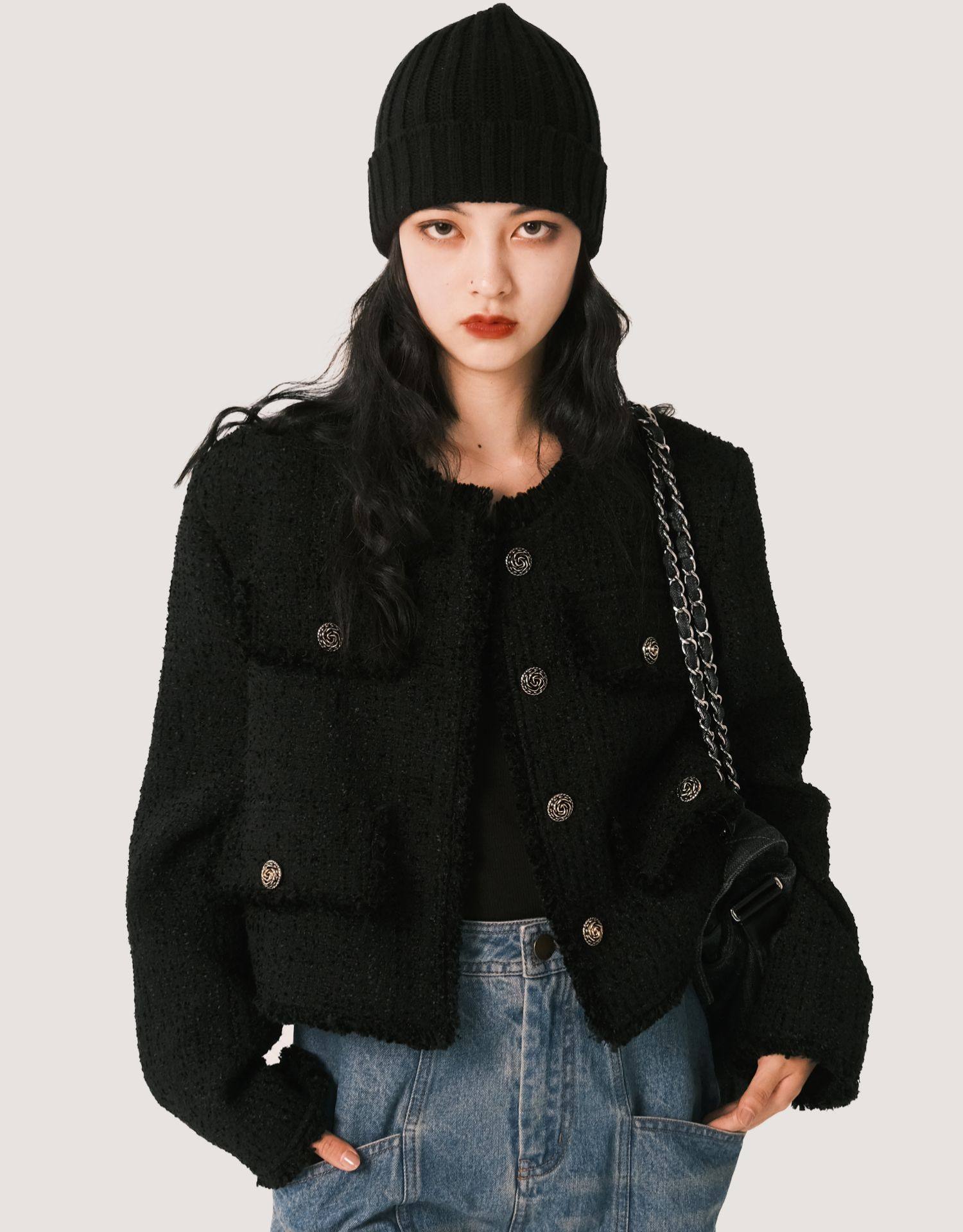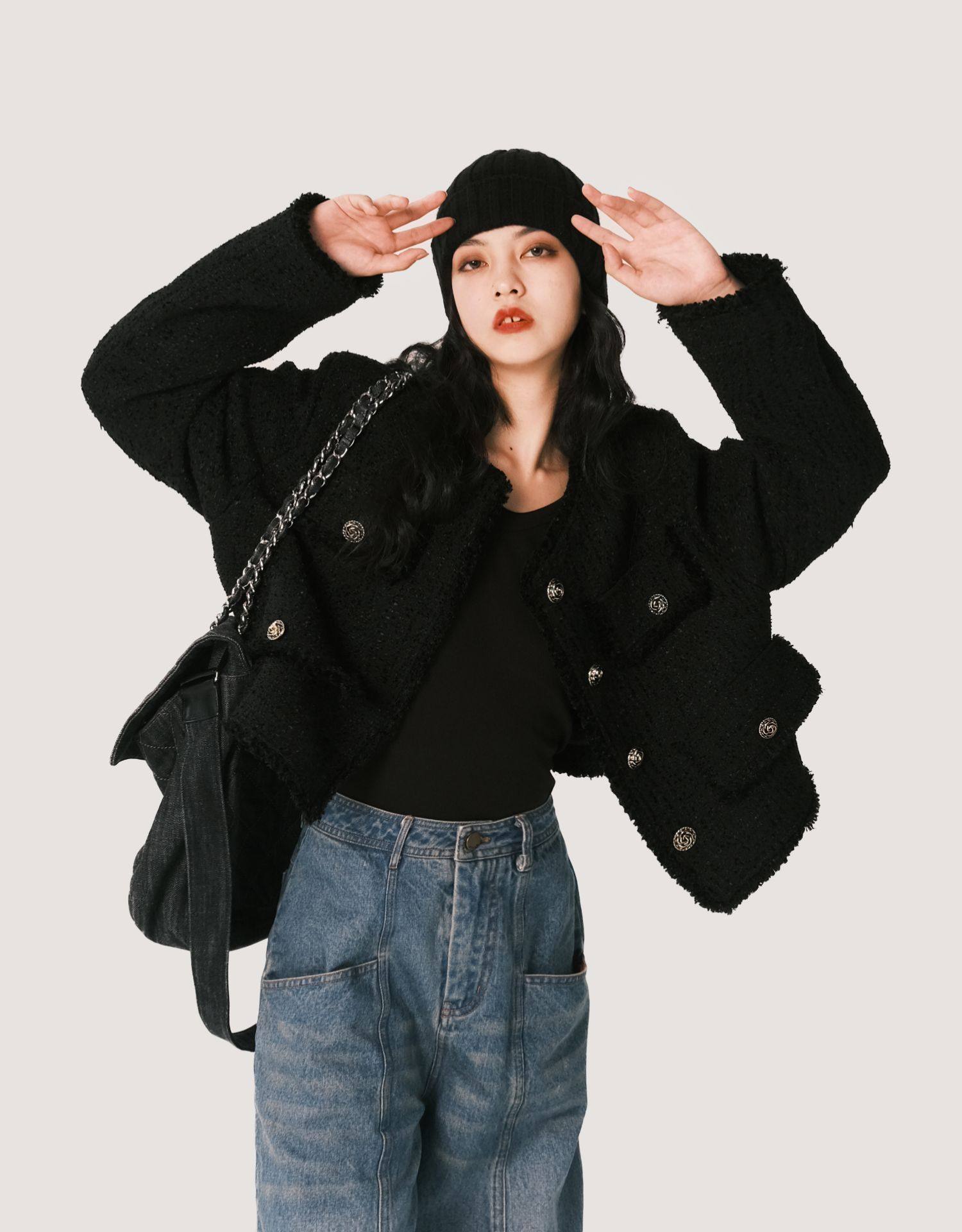 Crafted with high-quality French tweed and a metal buckle, this retro distressed black jacket exudes both elegance and edge. Its small fragrance adds a subtle touch of sophistication. Elevate your wardrobe with this timeless piece.
