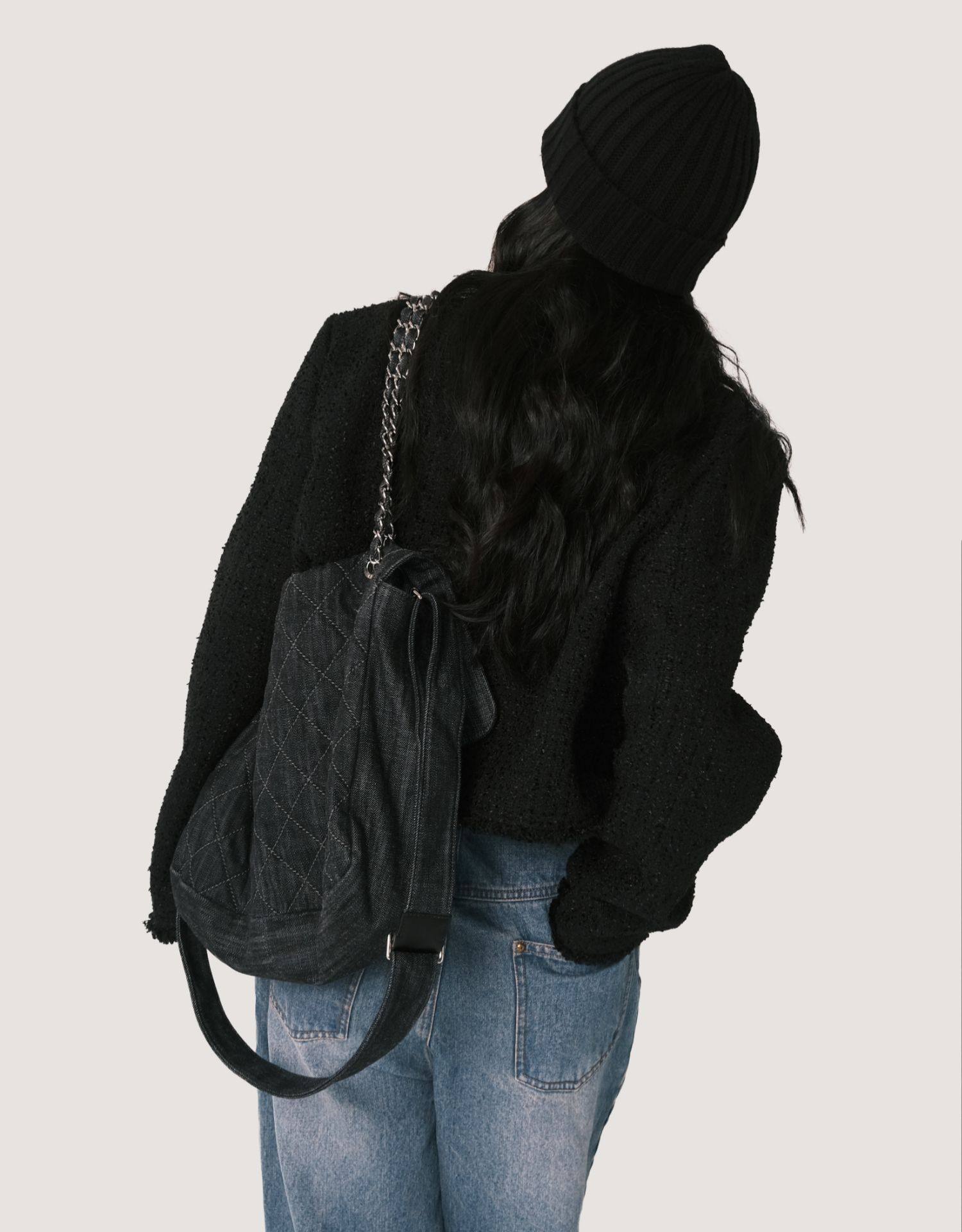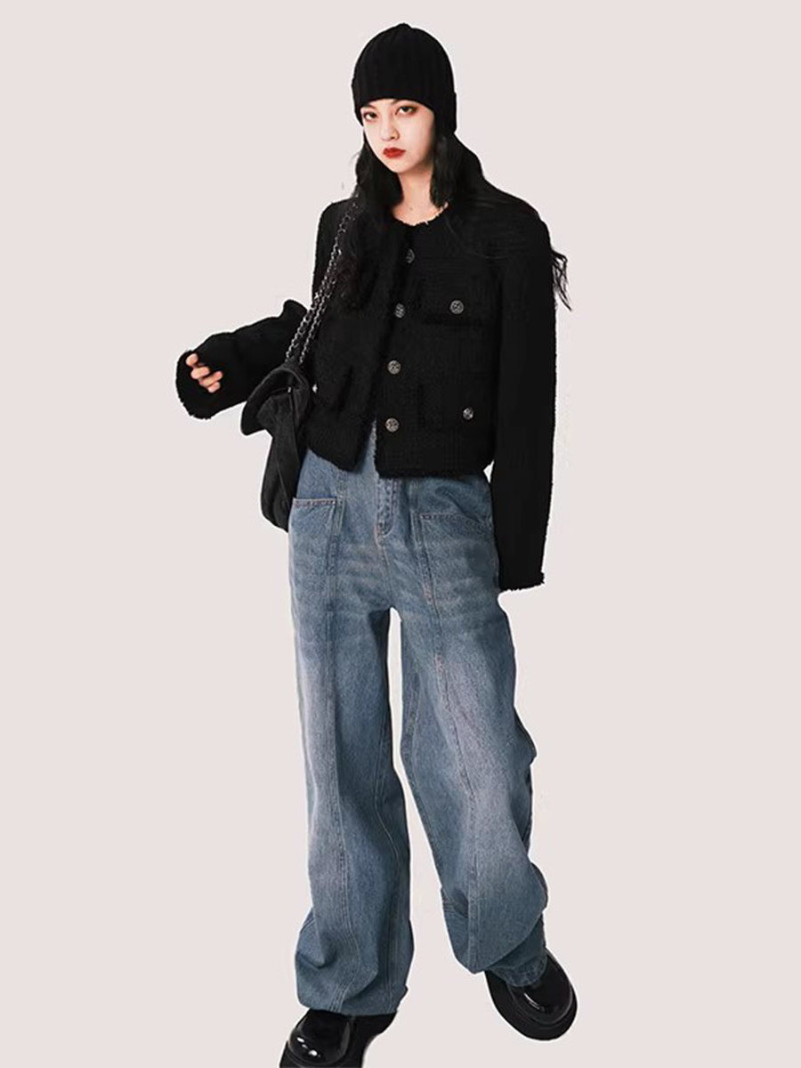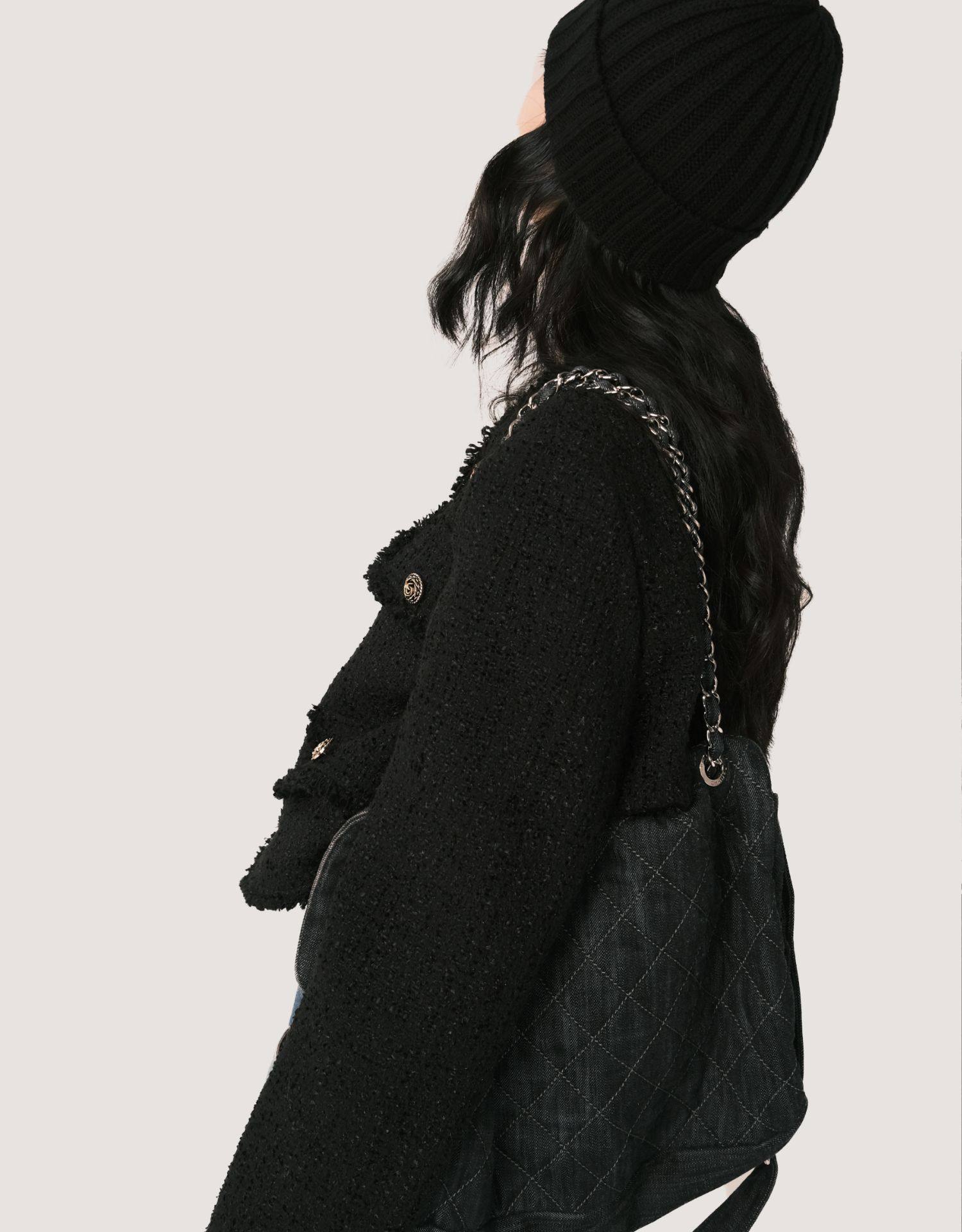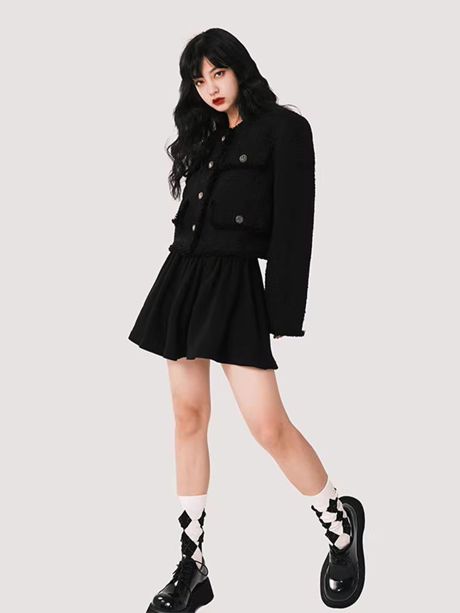 Crafted with high-quality French tweed and a metal buckle, this retro distressed black jacket exudes both elegance and edge. Its small fragrance adds a subtle touch of sophistication. Elevate your wardrobe with this timeless piece.