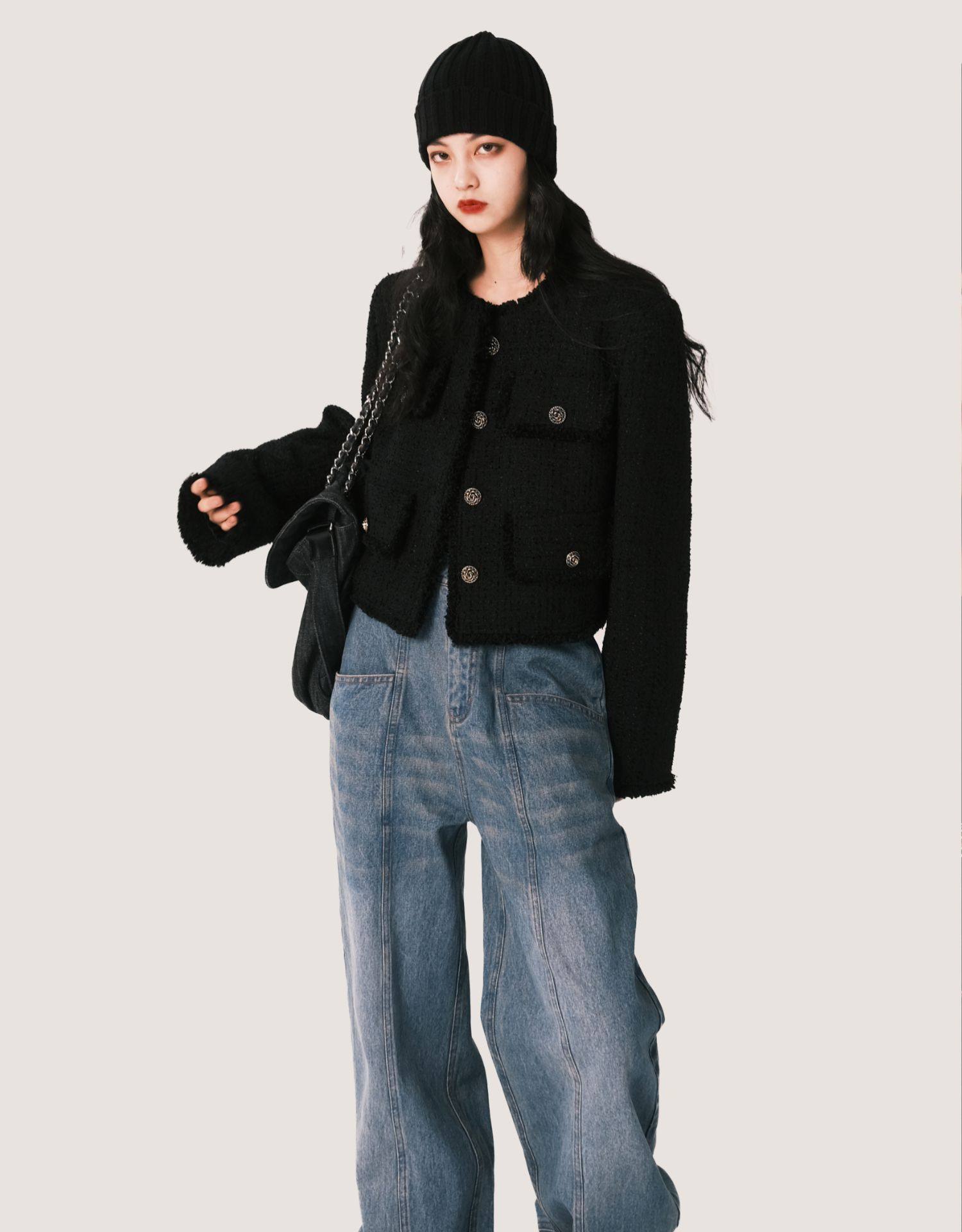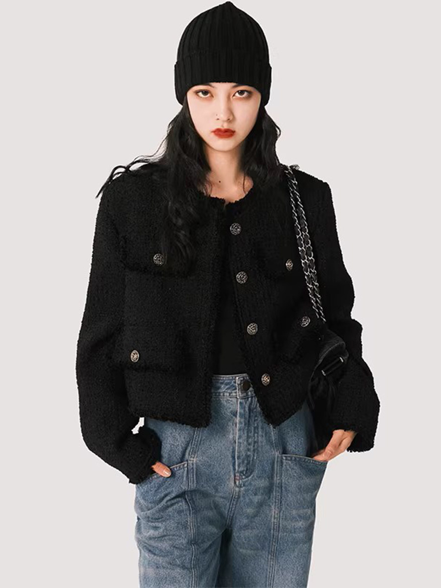 Women's French Retro Distressed Black Tweed Metal Buckle Jacket