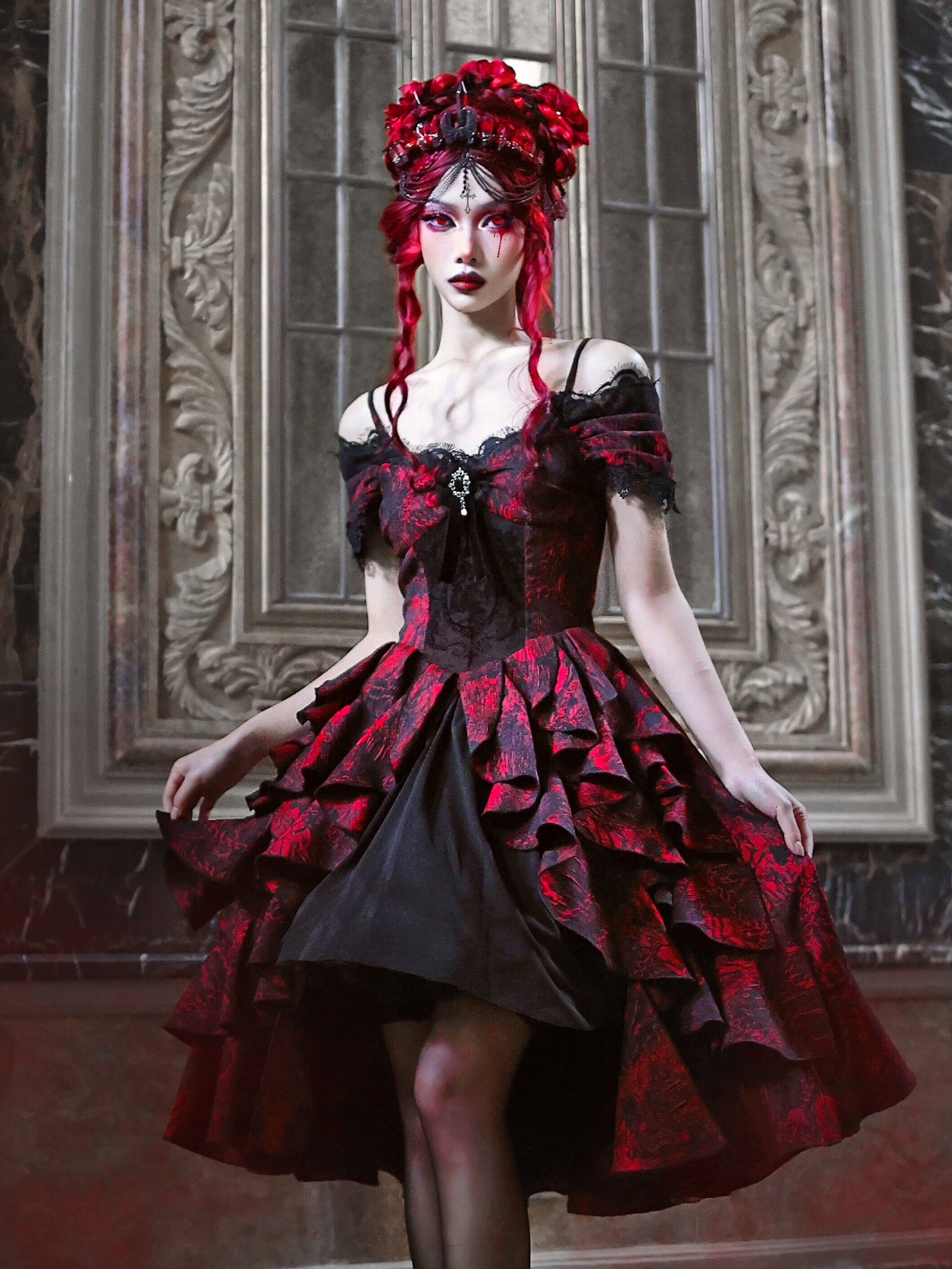 Women's Gothic Black and Red Jacquard One-Shoulder Ruffled Court Dress