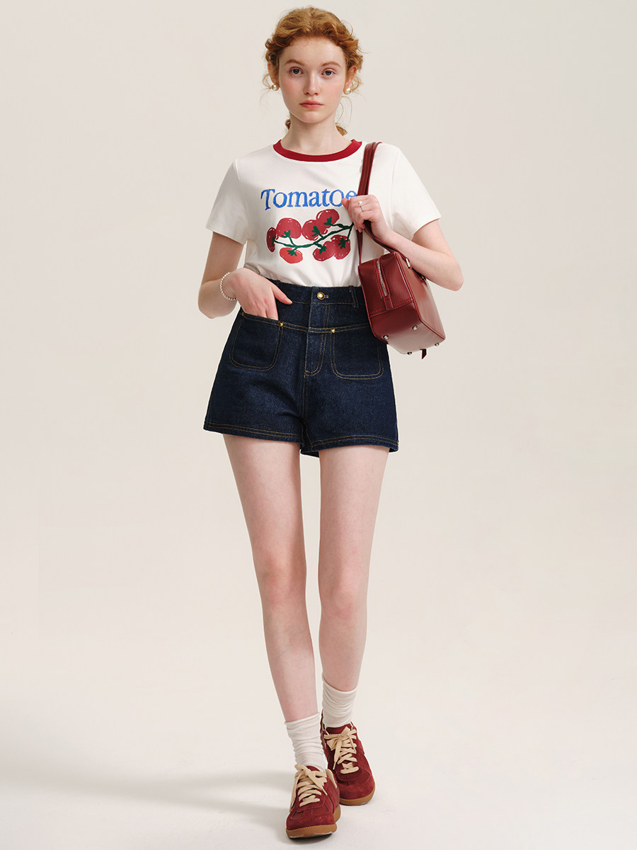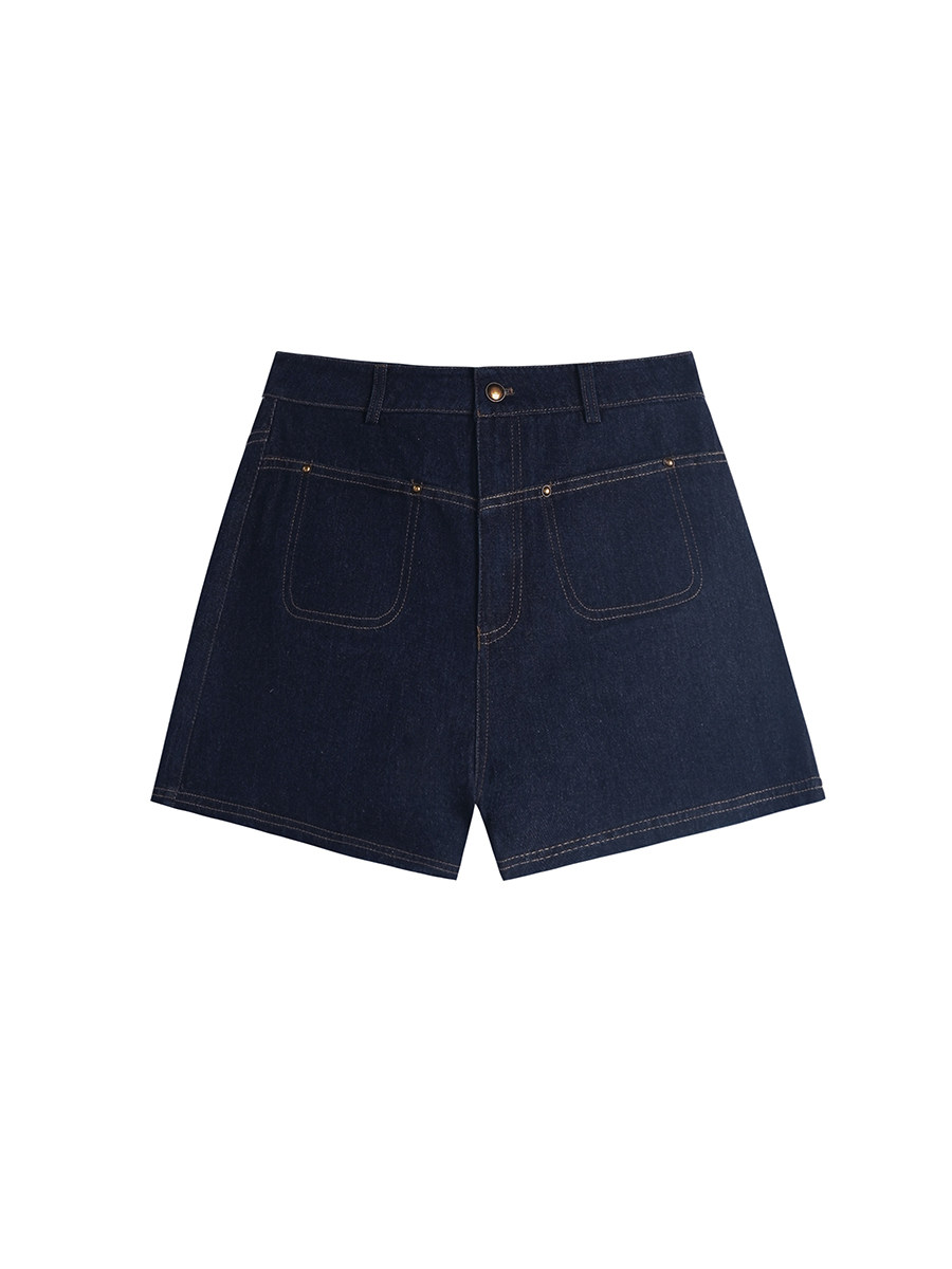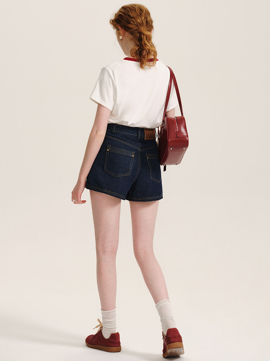 High-Waisted Retro Denim Hot Pants Contrast Stitch & Patch Pocket