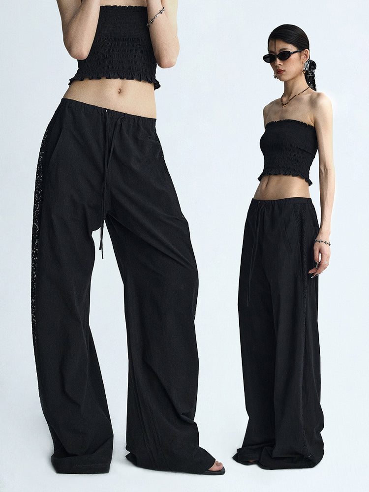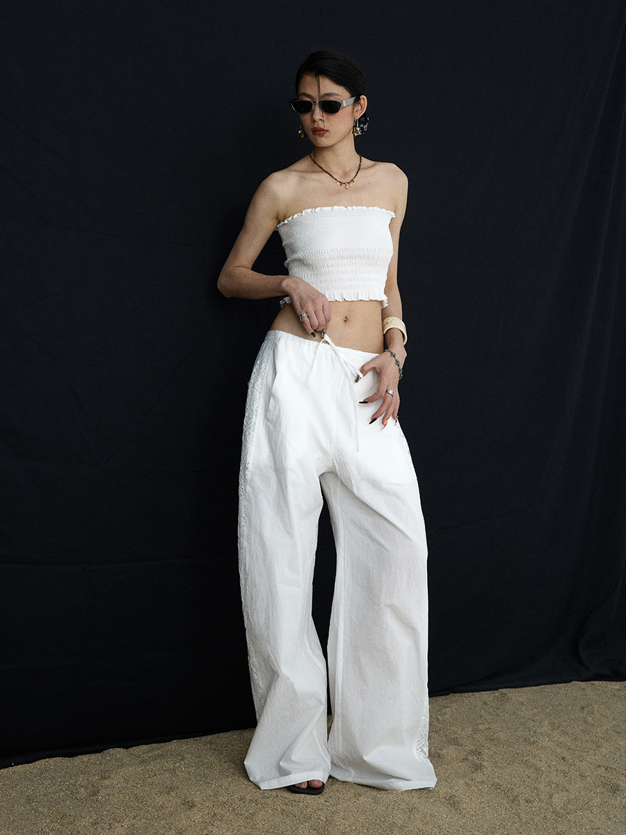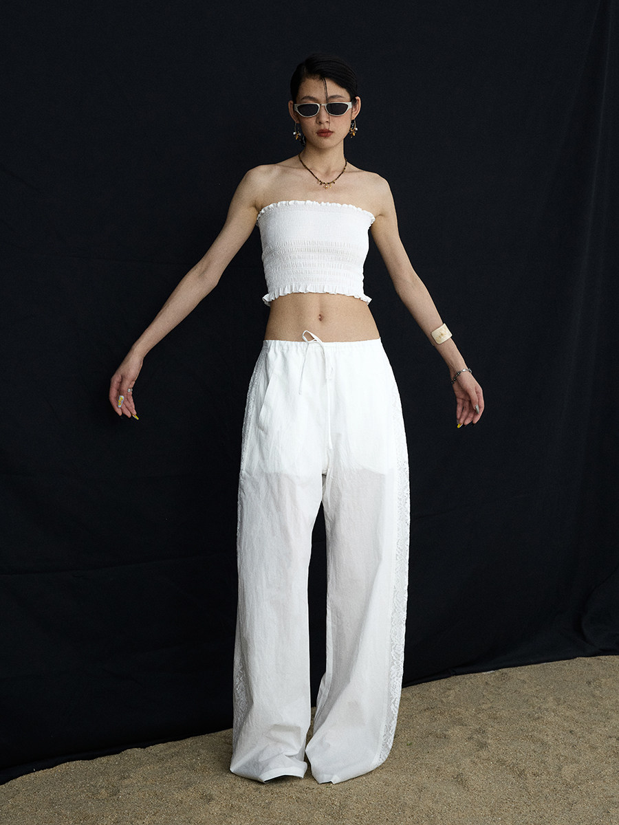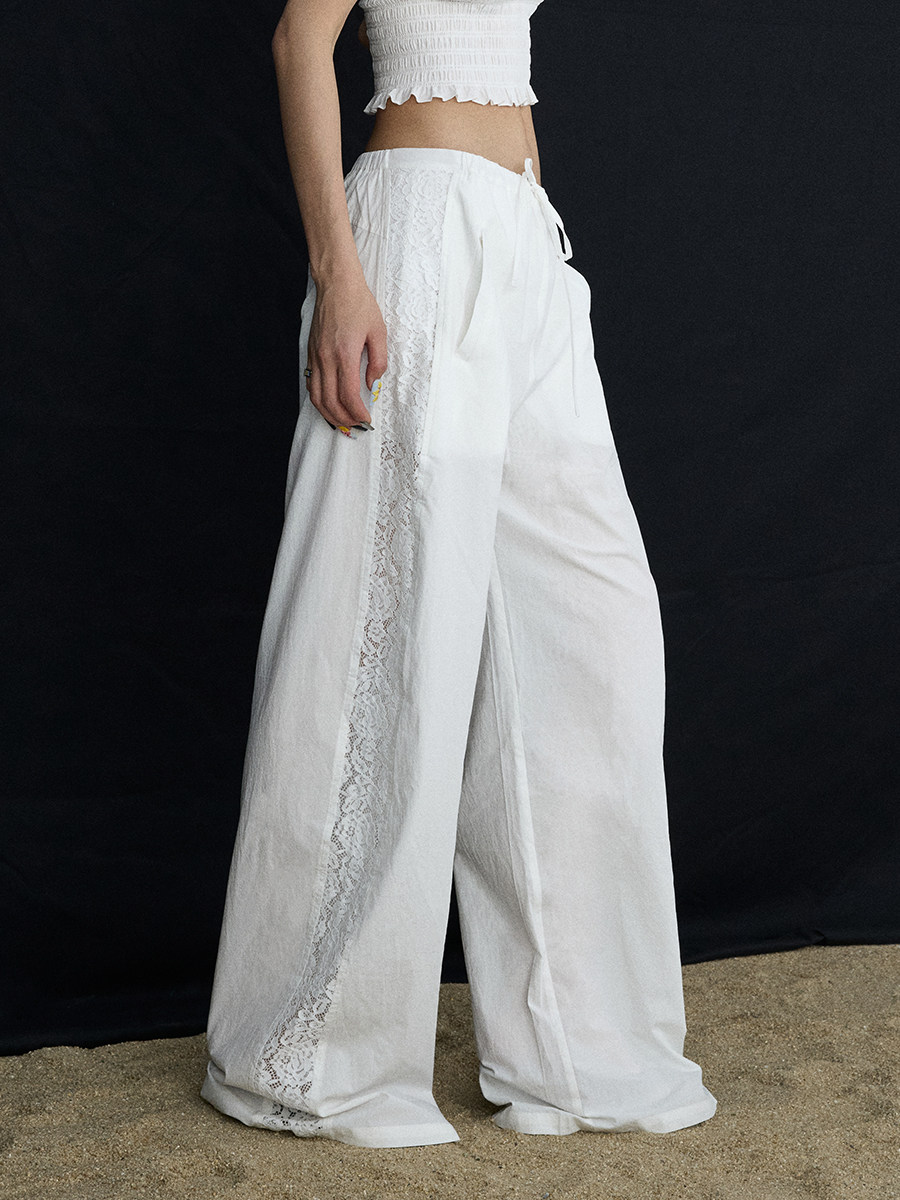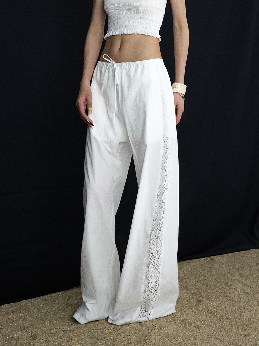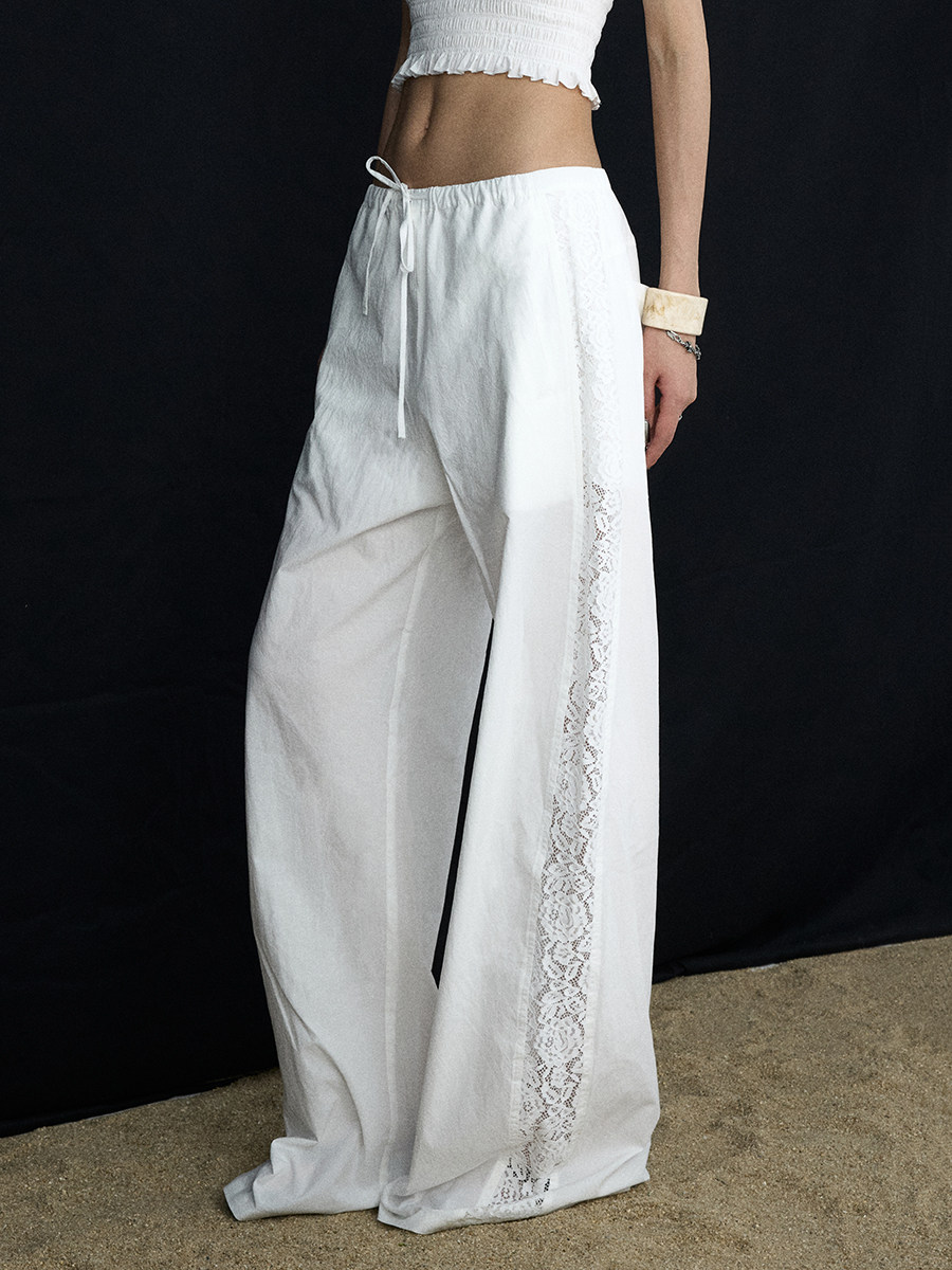 Lace Panel Wide-Leg Trousers White Summer Pants with Drawstring & Side Cut-Outs