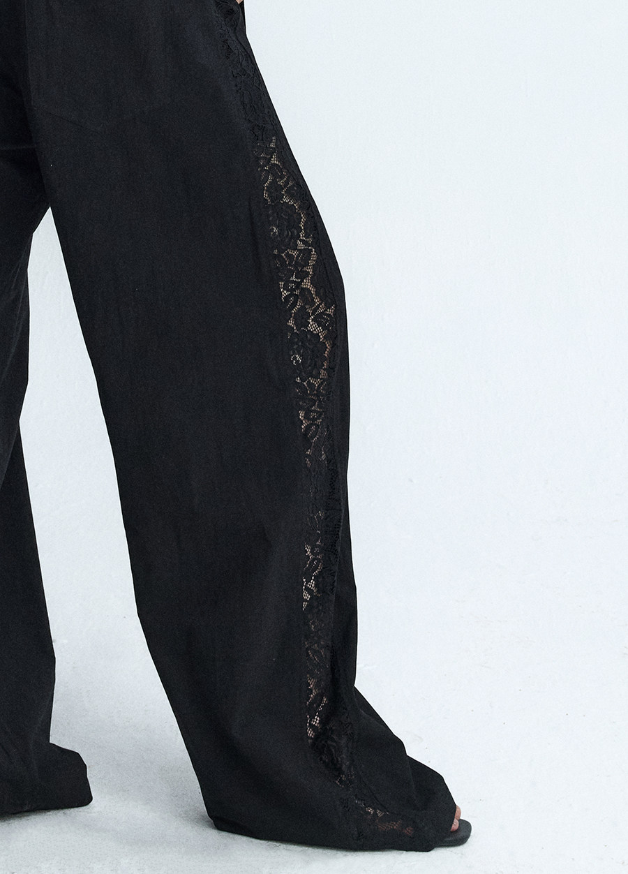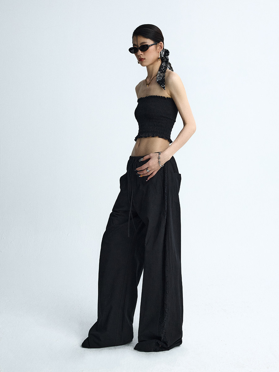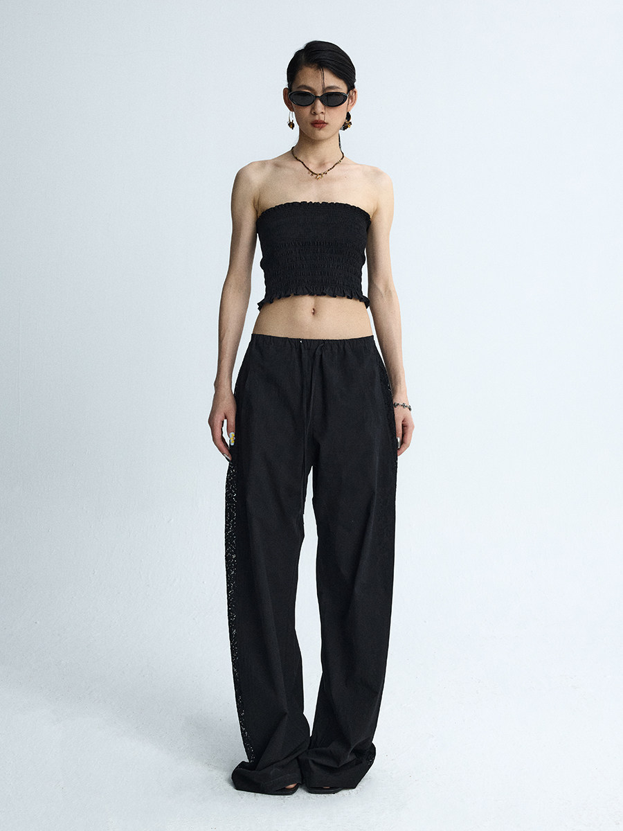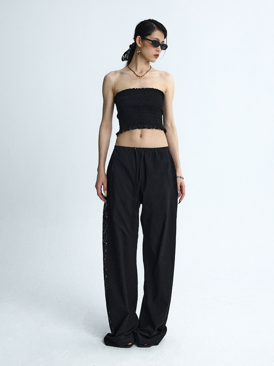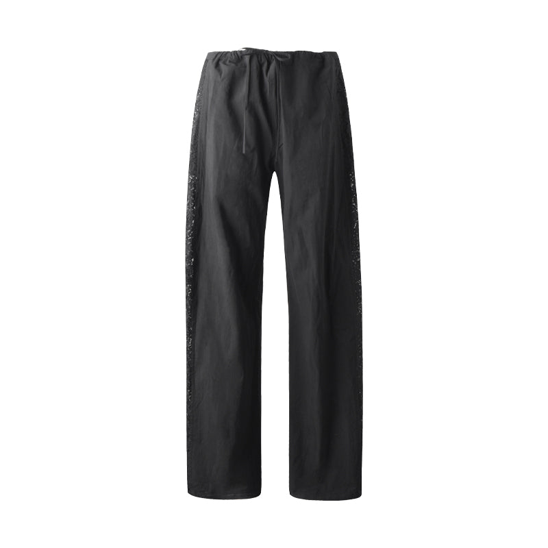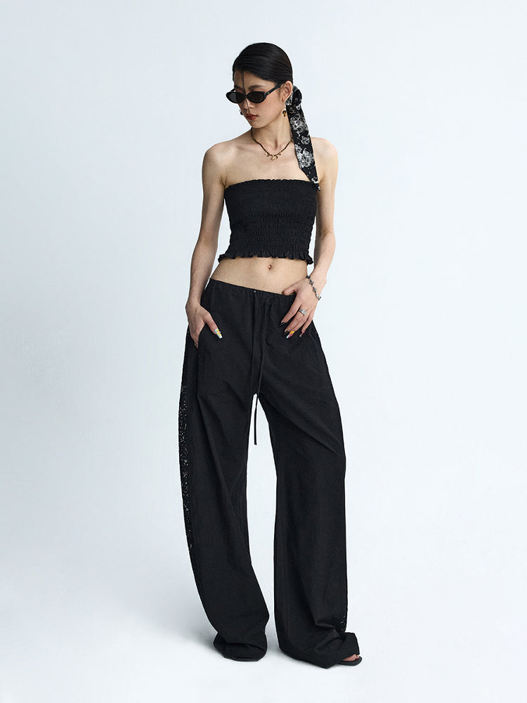 Lace Panel Wide-Leg Trousers White Summer Pants with Drawstring & Side Cut-Outs