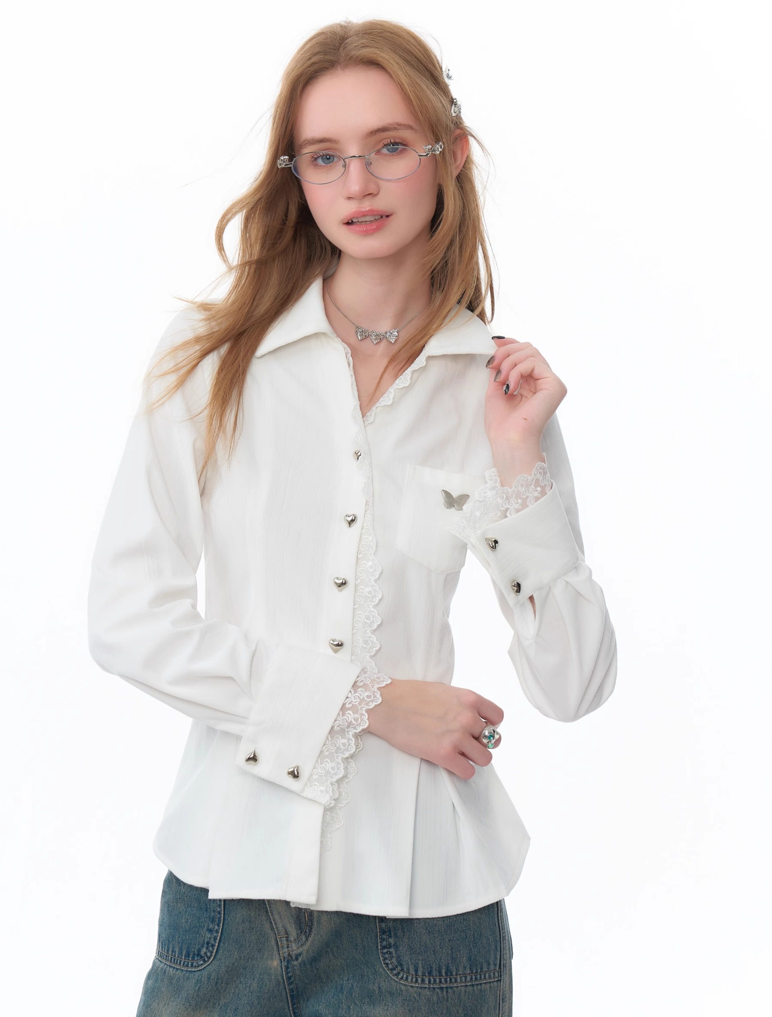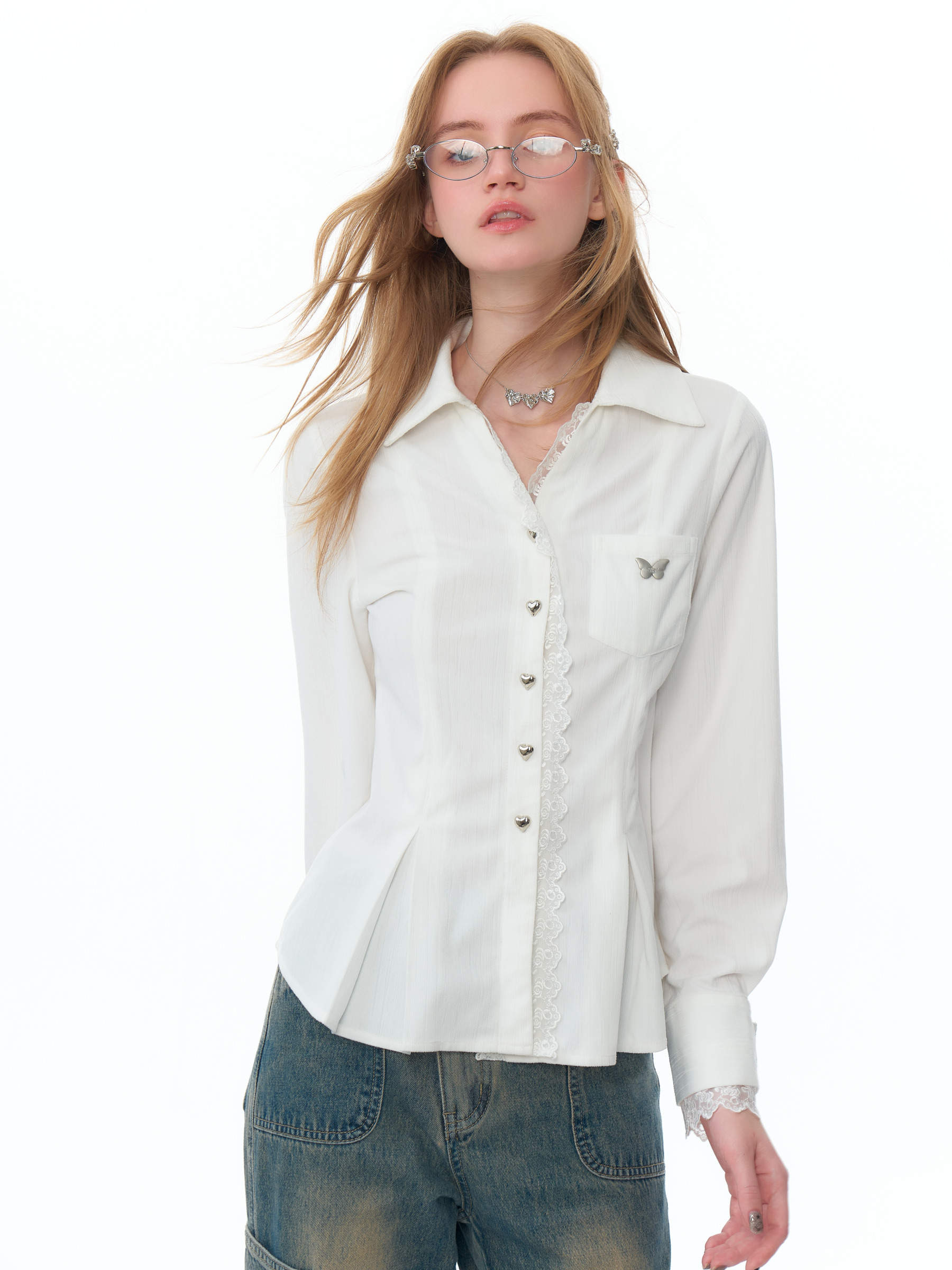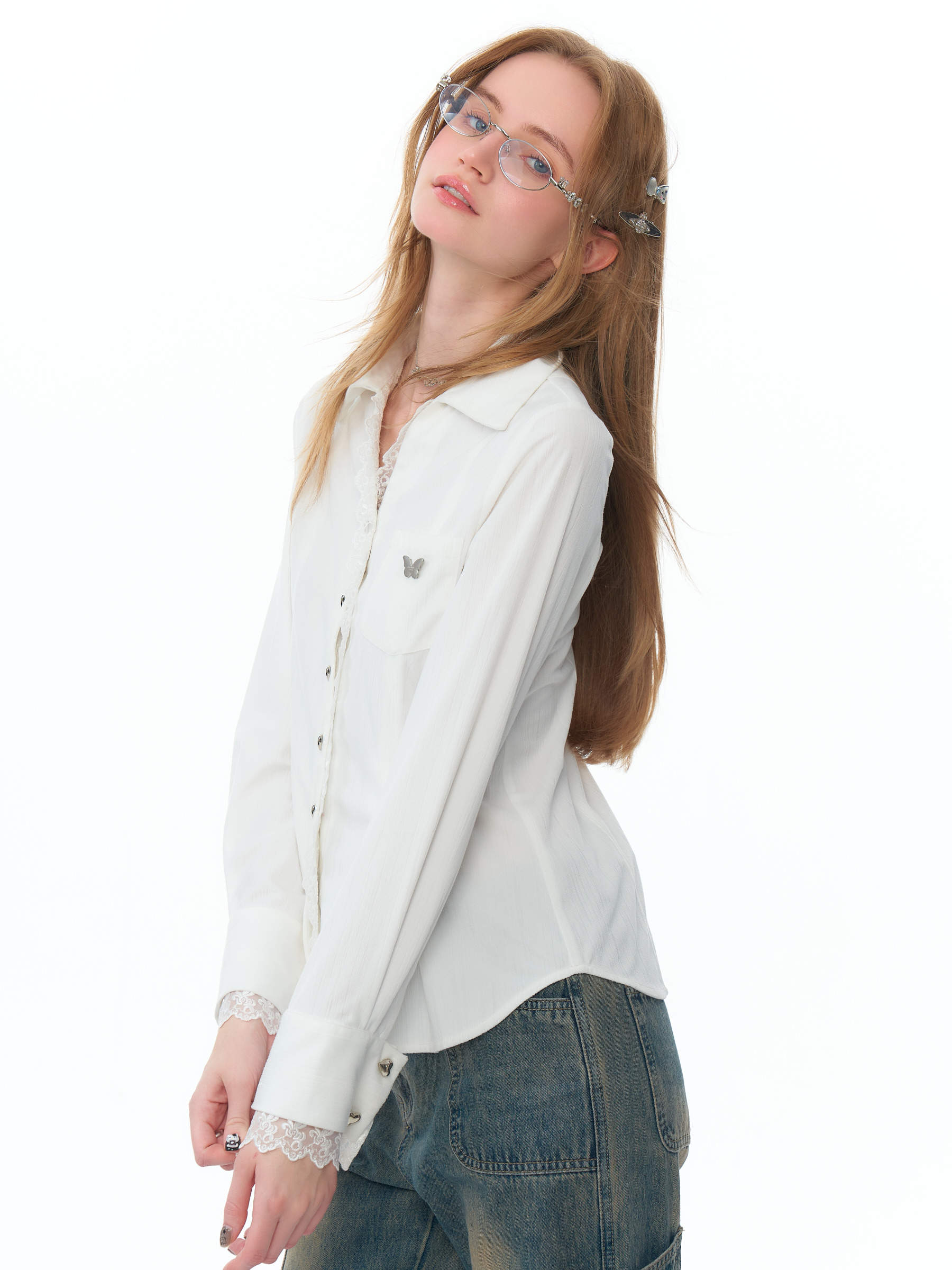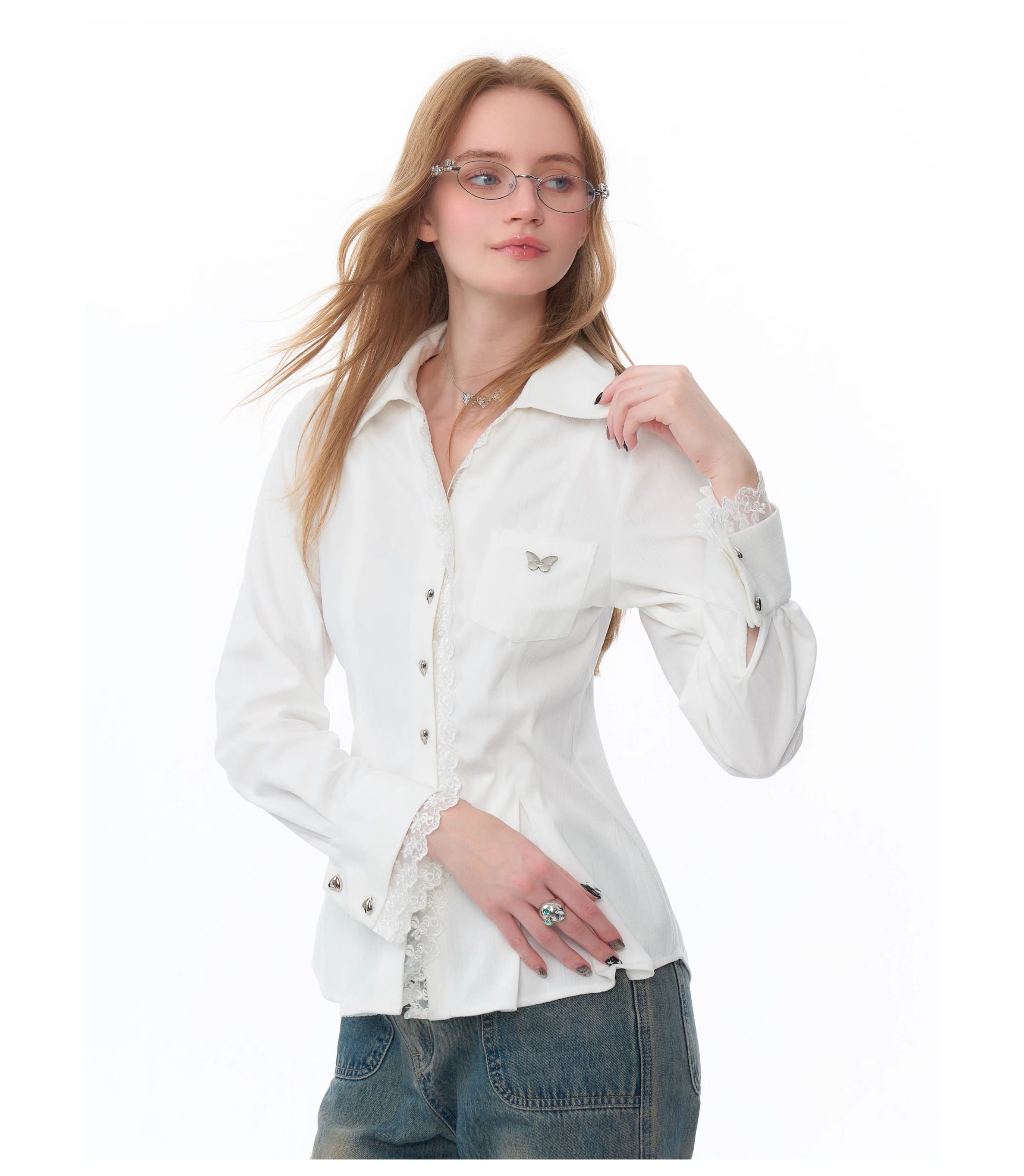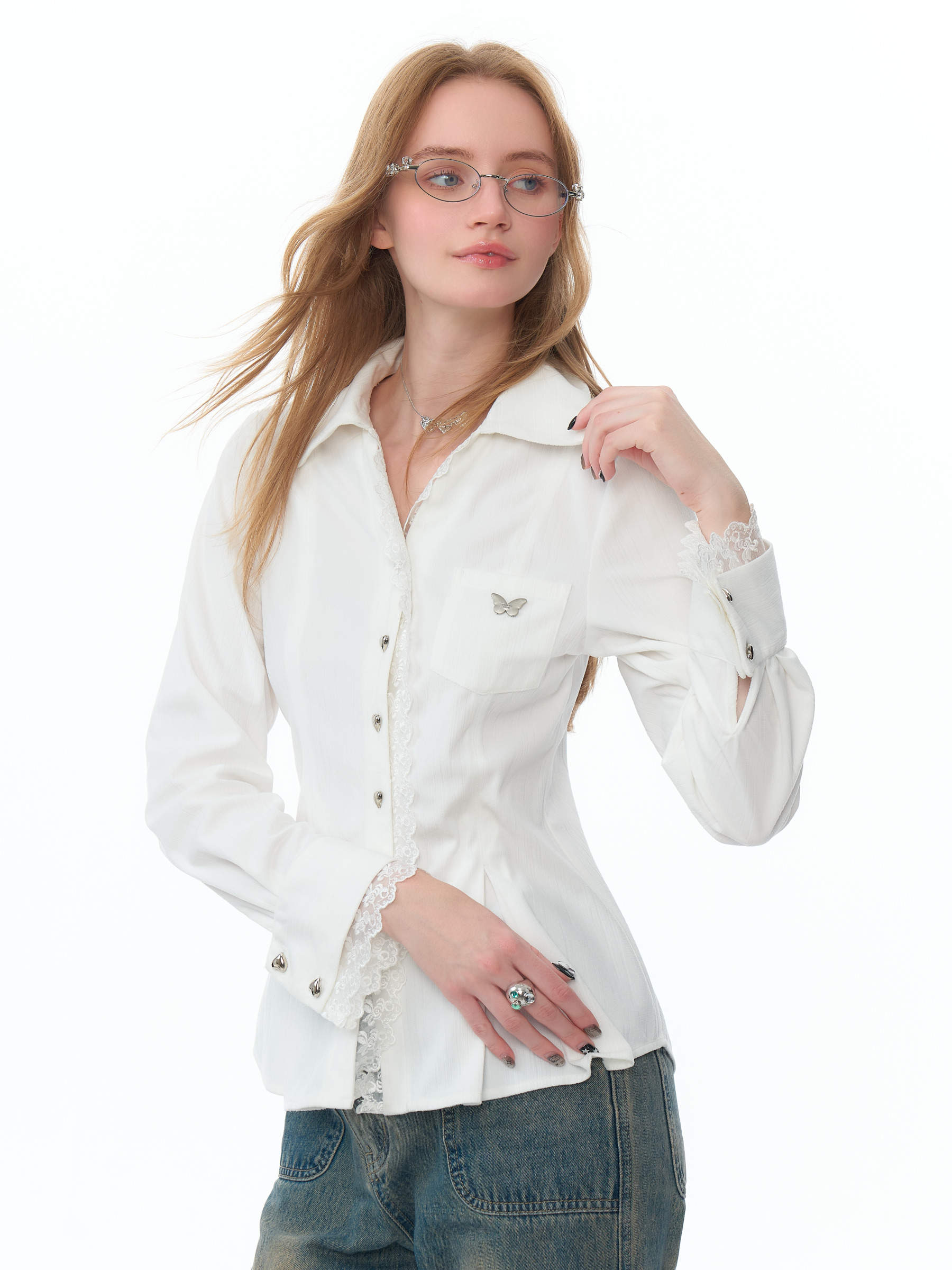 Lace Slim Fit White Long Sleeve Shirt Women's
