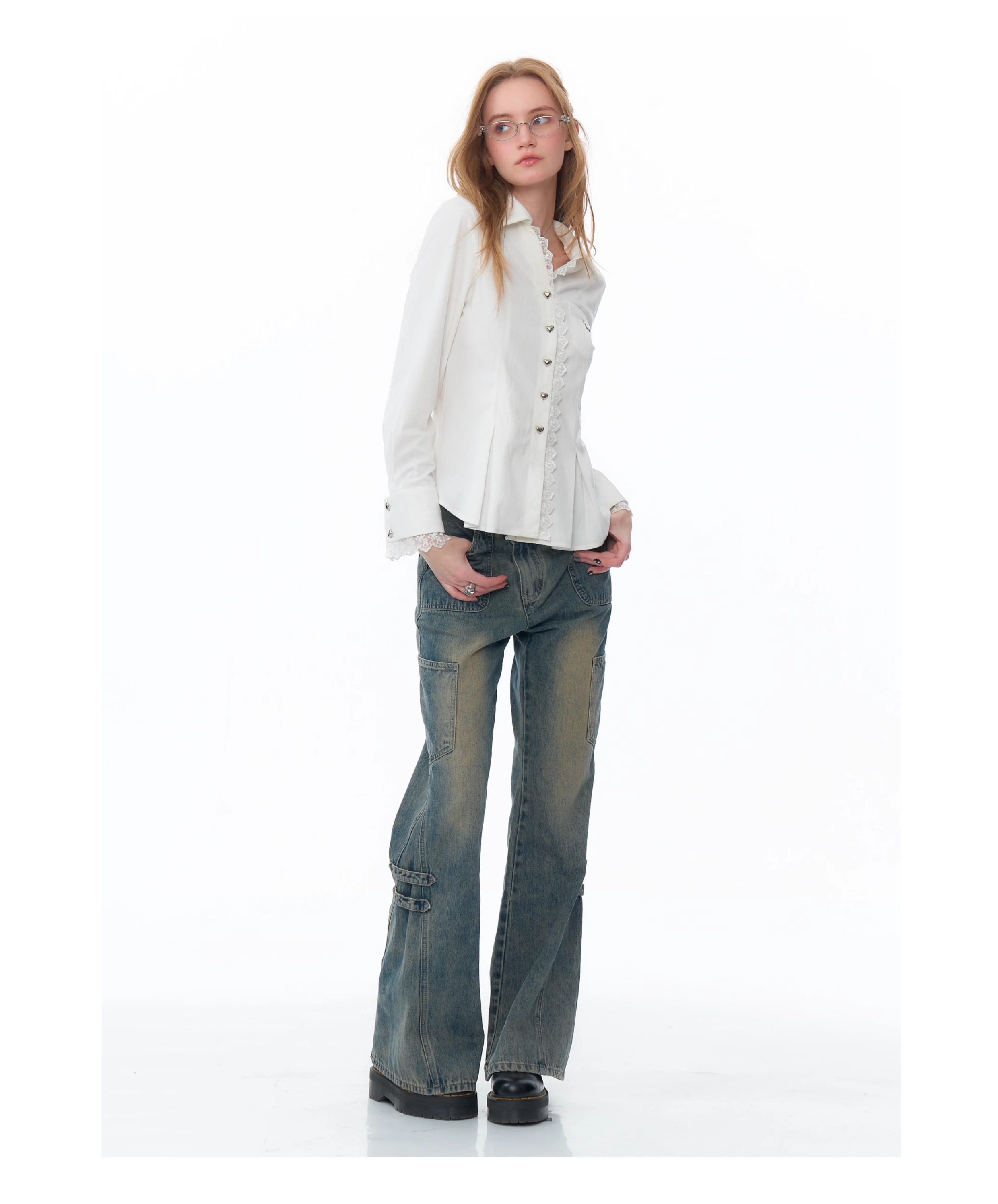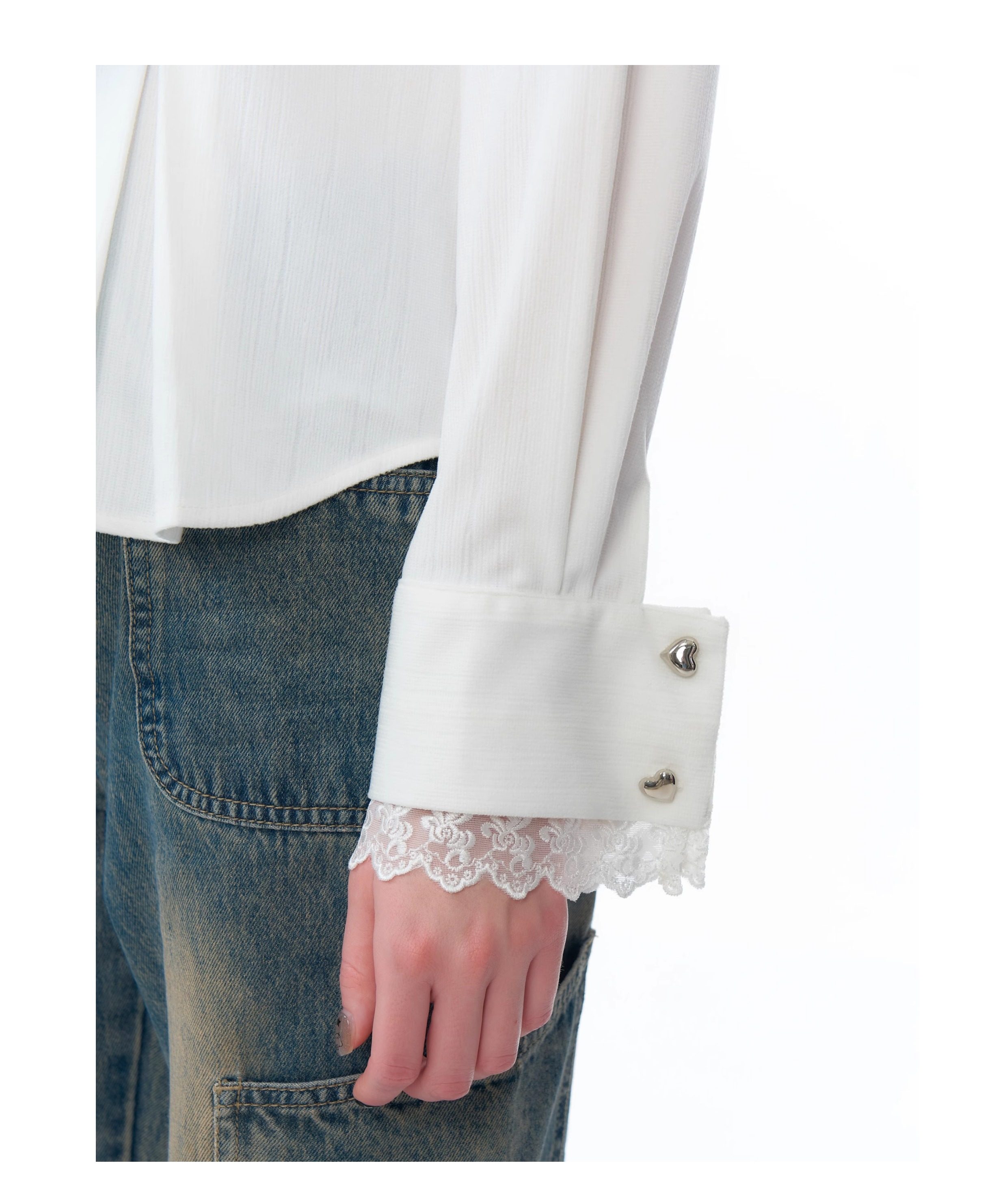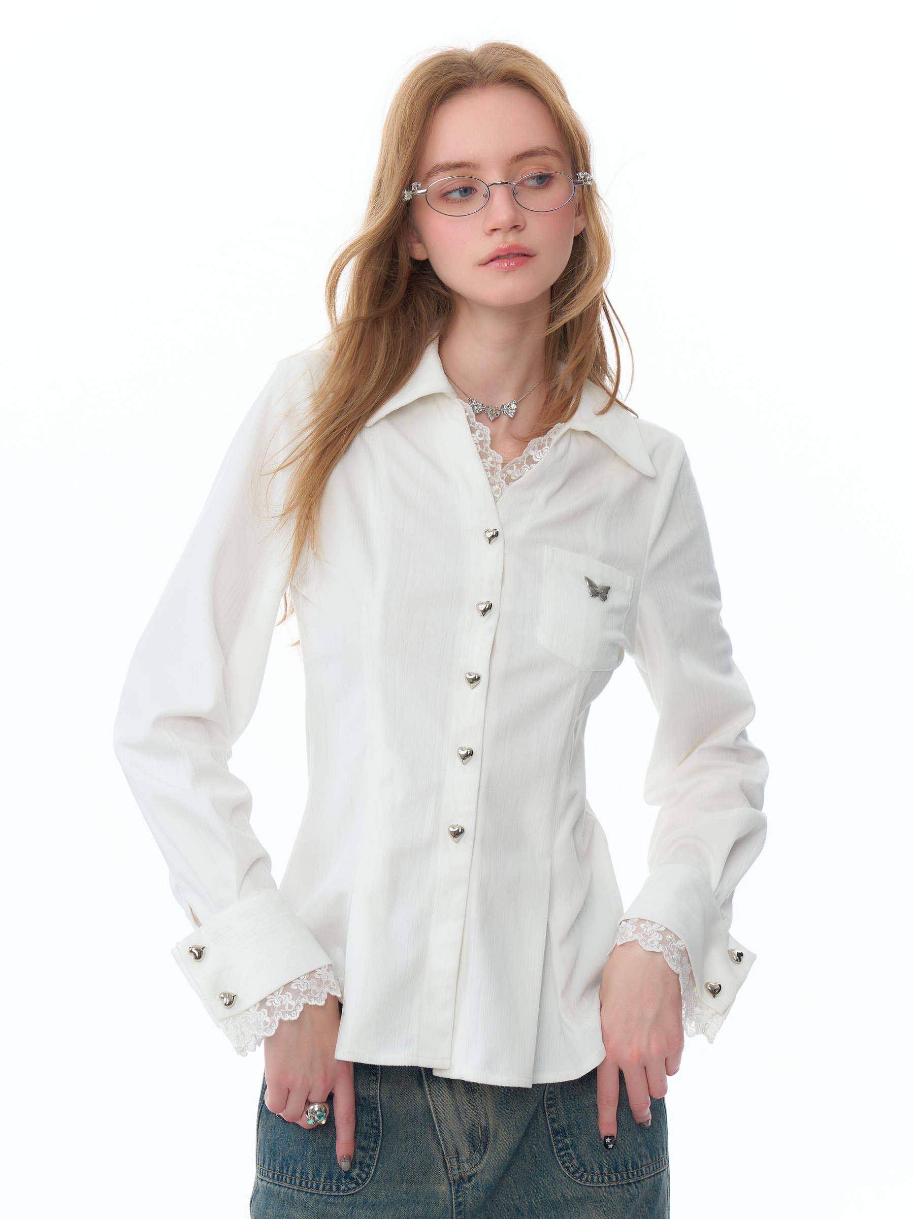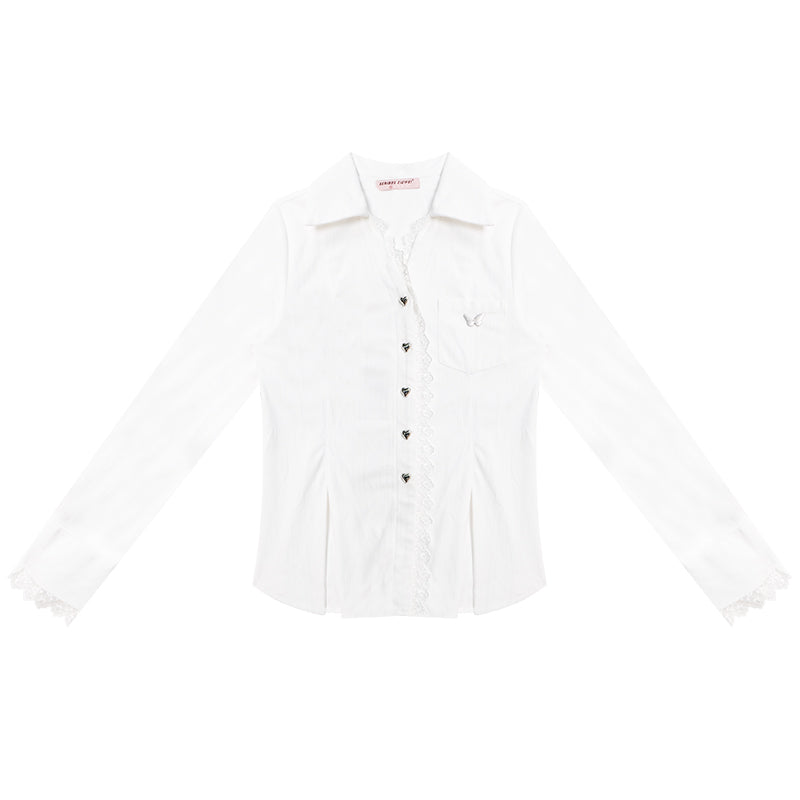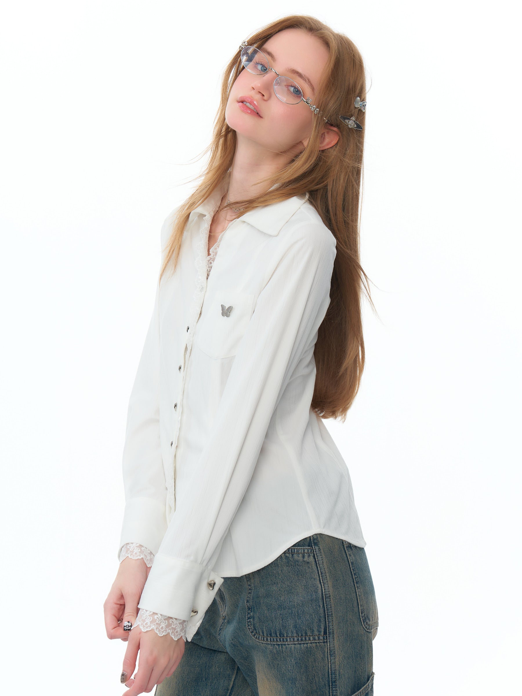 Lace Slim Fit White Long Sleeve Shirt Women's