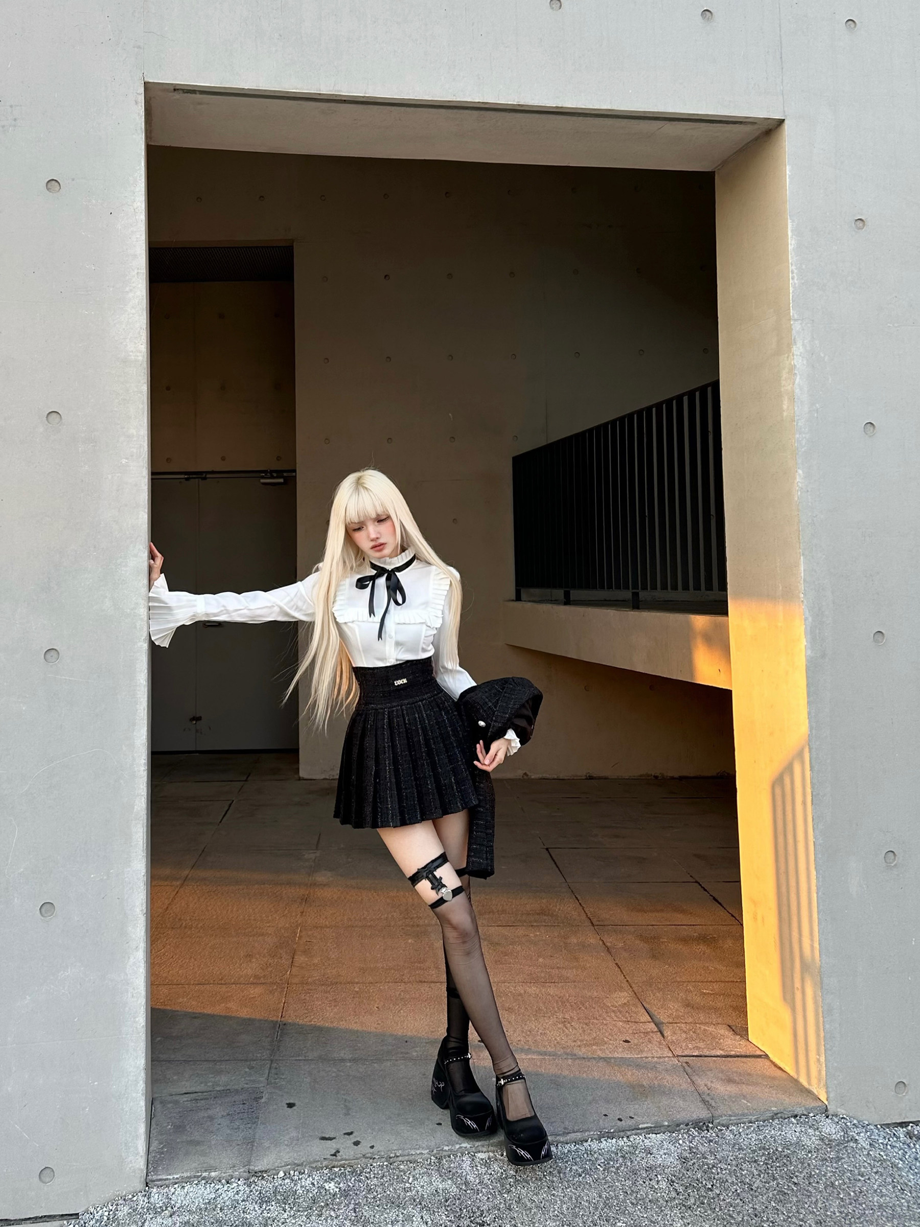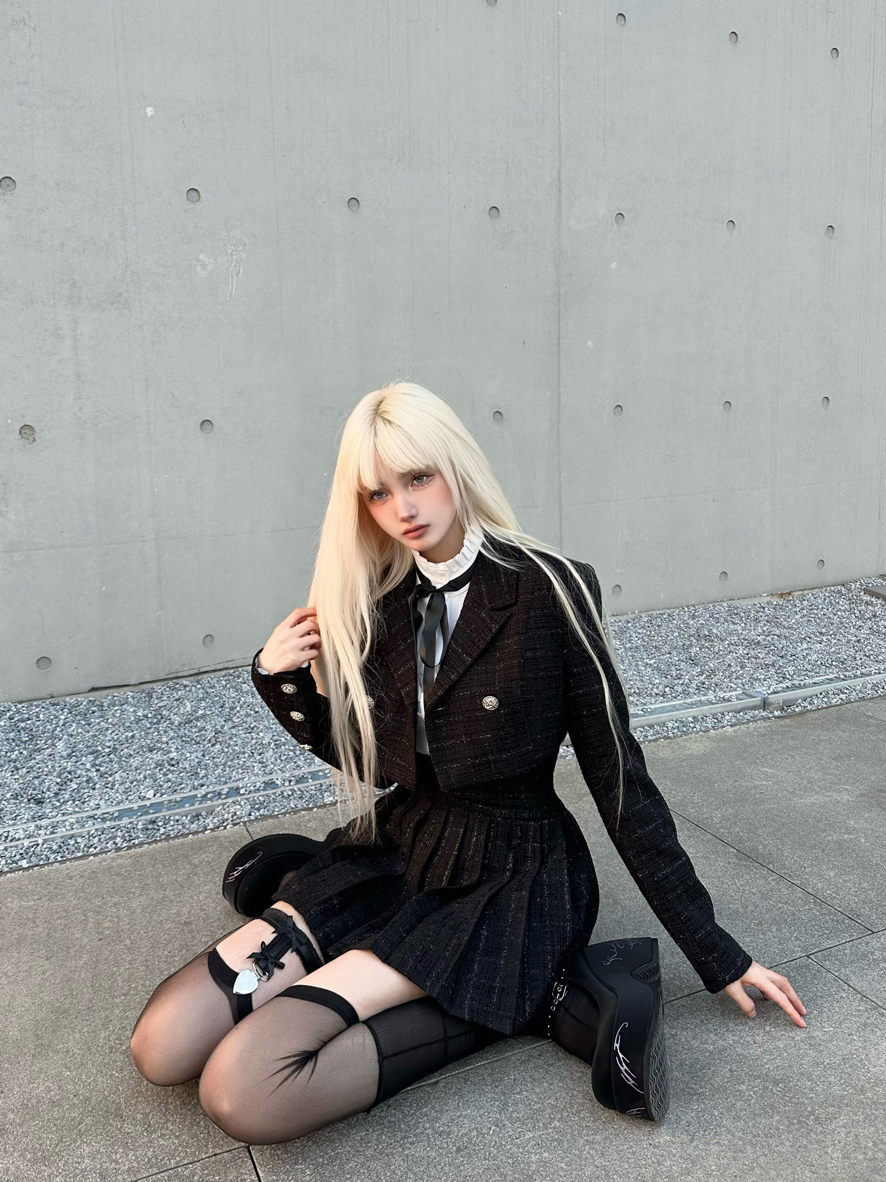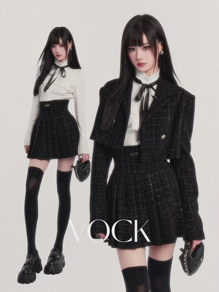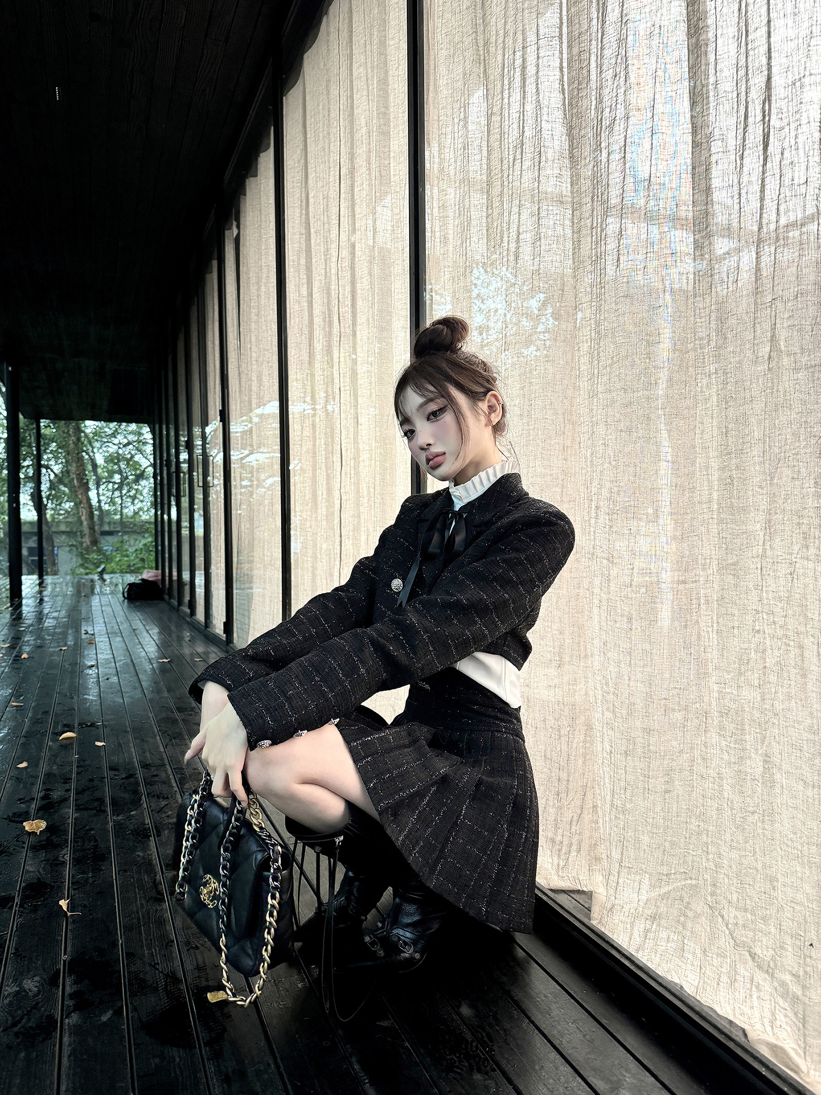 This Little Fragrance Suit includes a pleated skirt and jacket, perfect for the autumn season. The outfit is completed with a stylish white shirt to elevate your celebrity style. Stay on-trend and comfortable with this versatile suit.