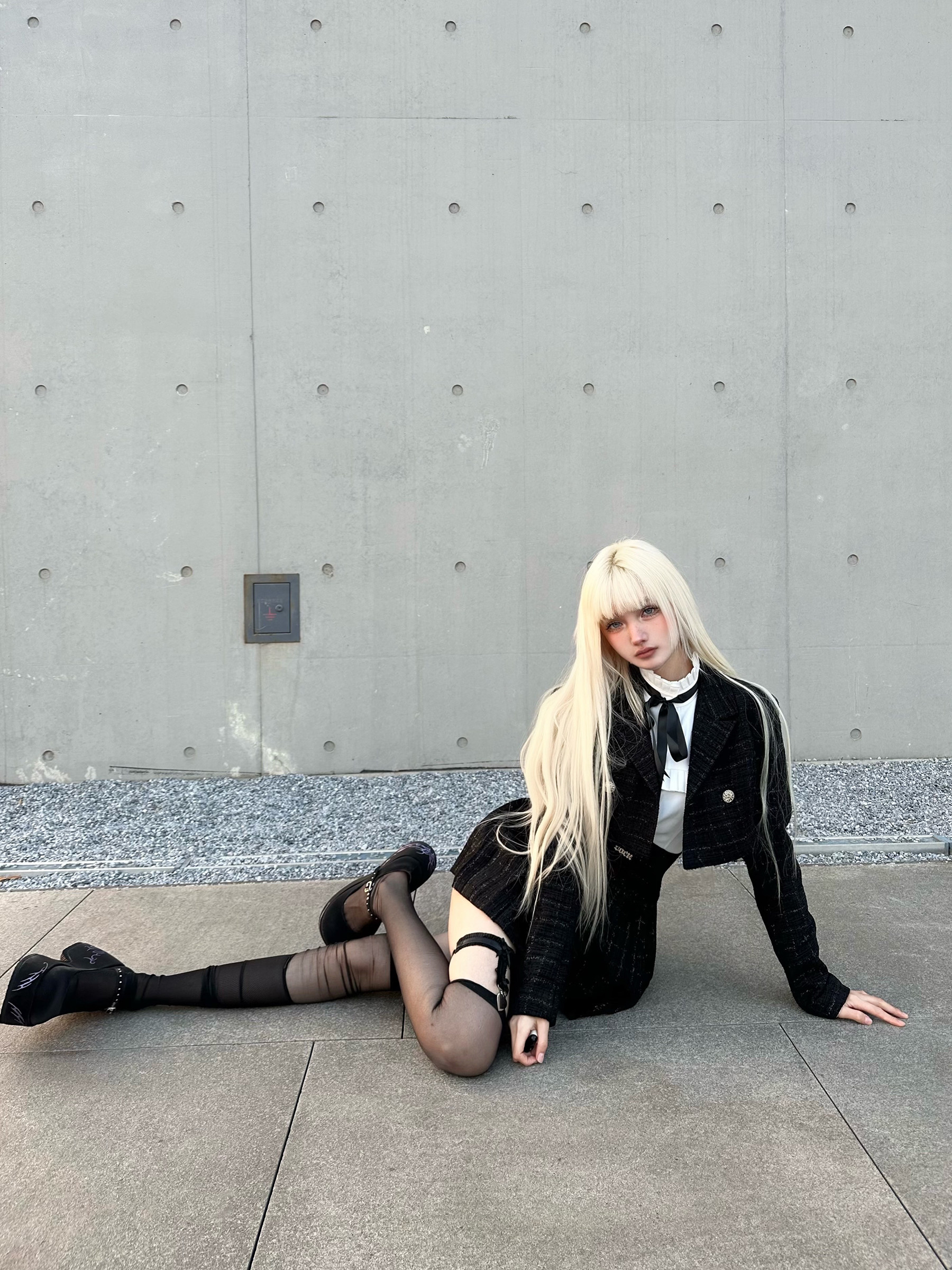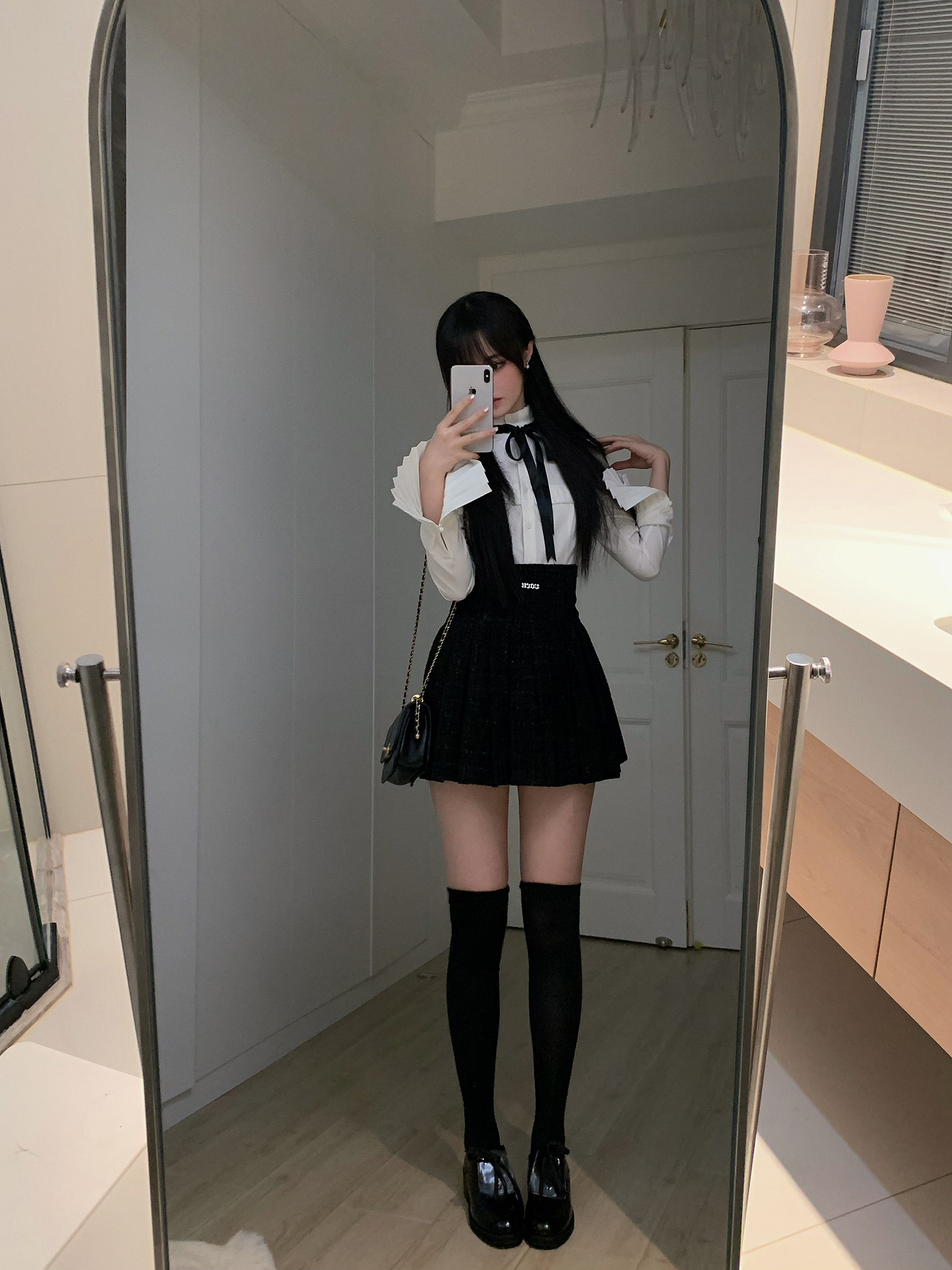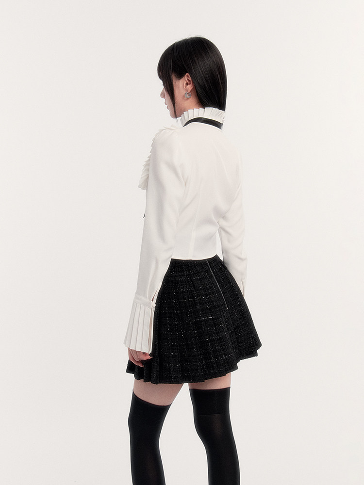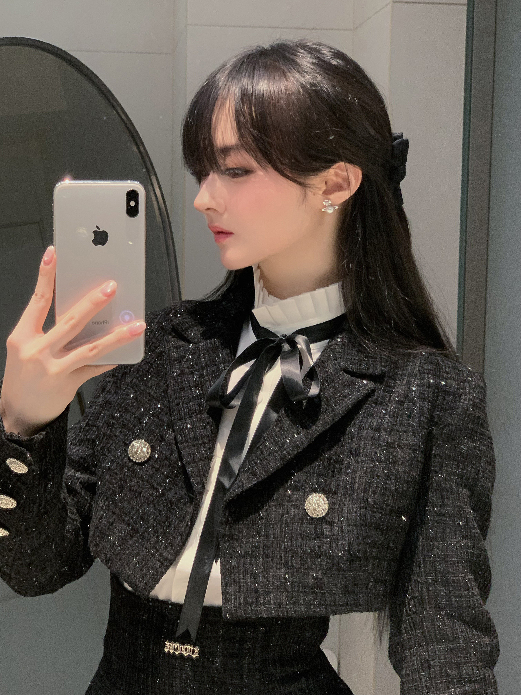 This Little Fragrance Suit includes a pleated skirt and jacket, perfect for the autumn season. The outfit is completed with a stylish white shirt to elevate your celebrity style. Stay on-trend and comfortable with this versatile suit.