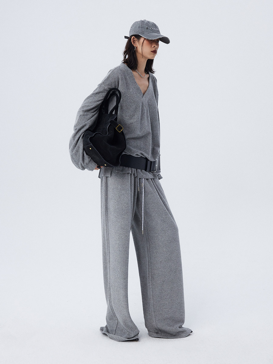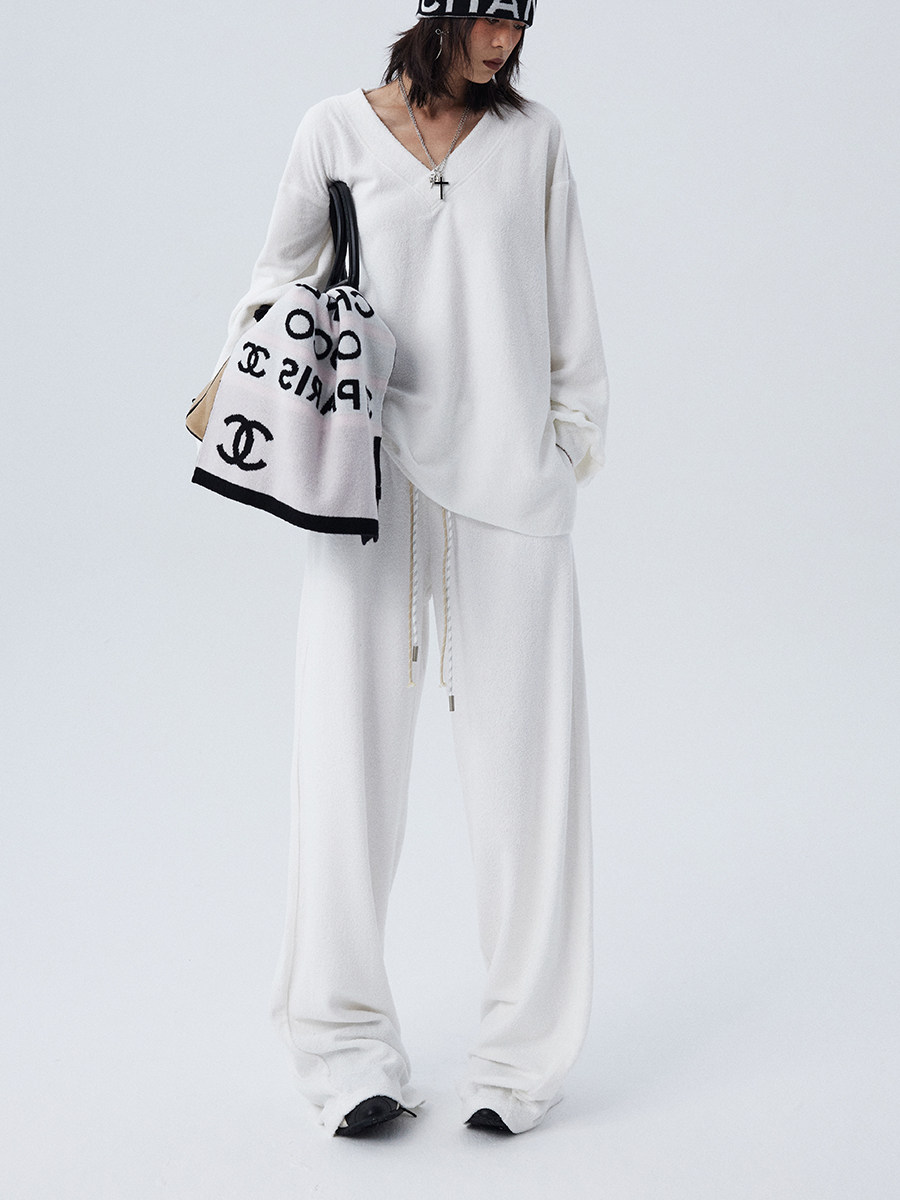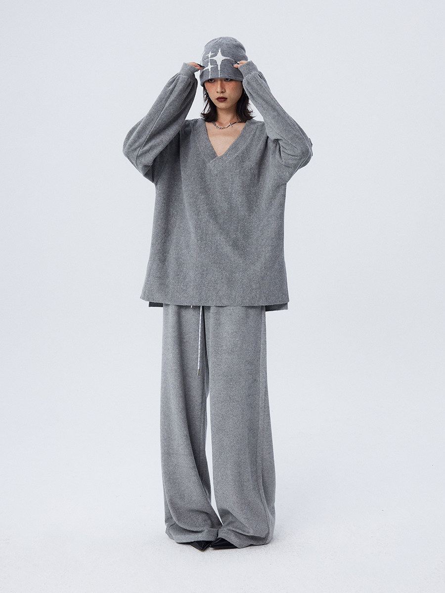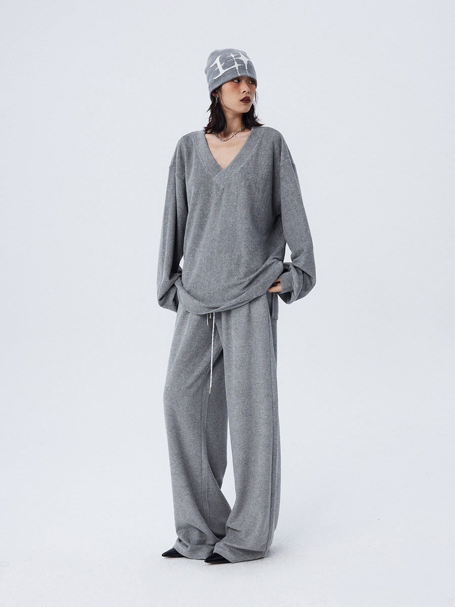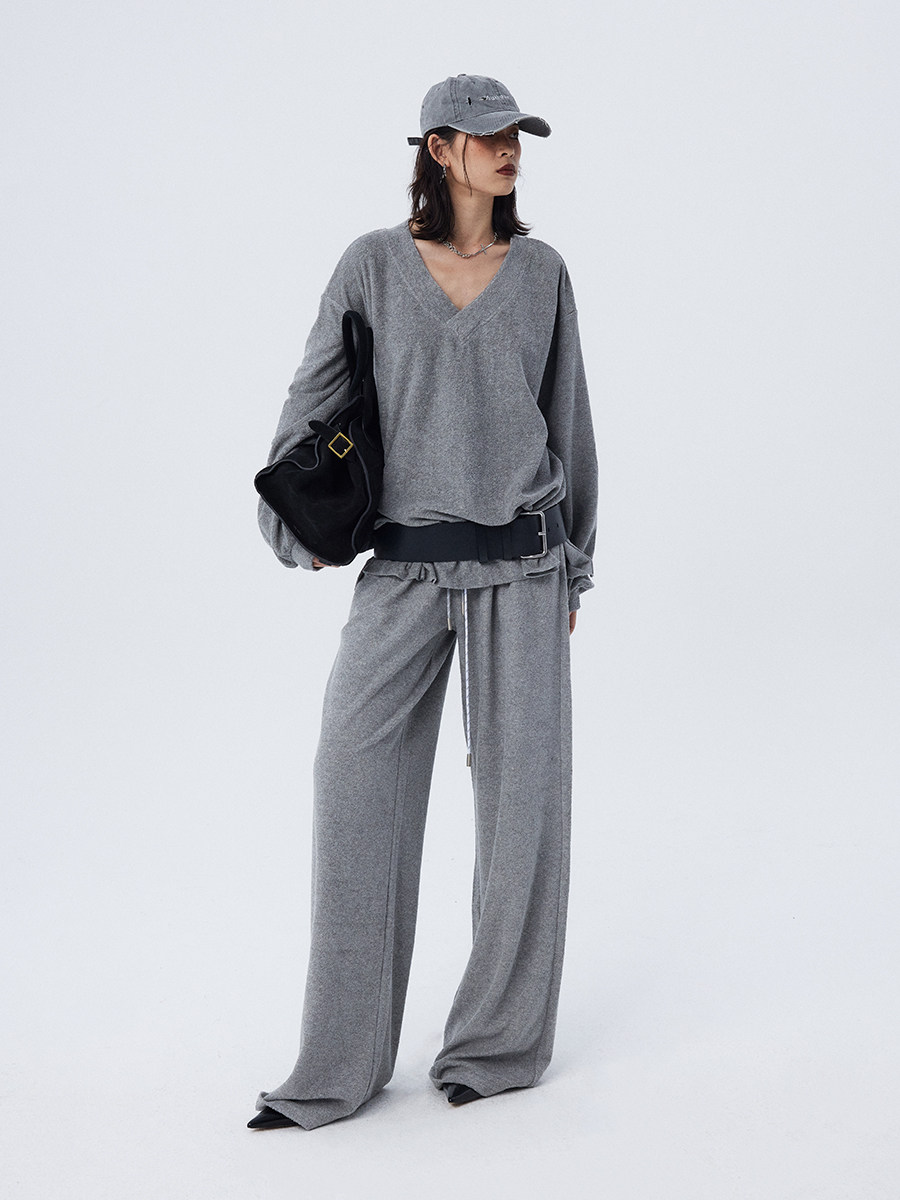 Stay stylish and cozy this winter with our loose and soft white gray V-neck terry cloth casual suit top and wide-leg trousers for women. Made with high-quality materials, this suit provides both comfort and style. Perfect for casual outings or relaxing at home.