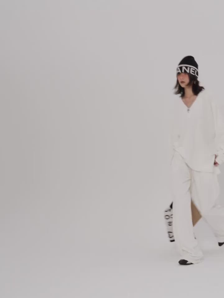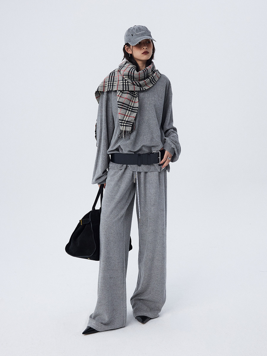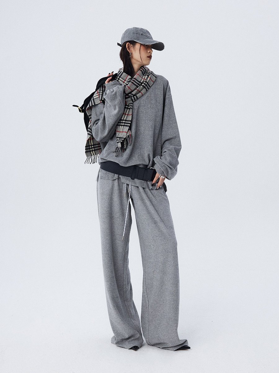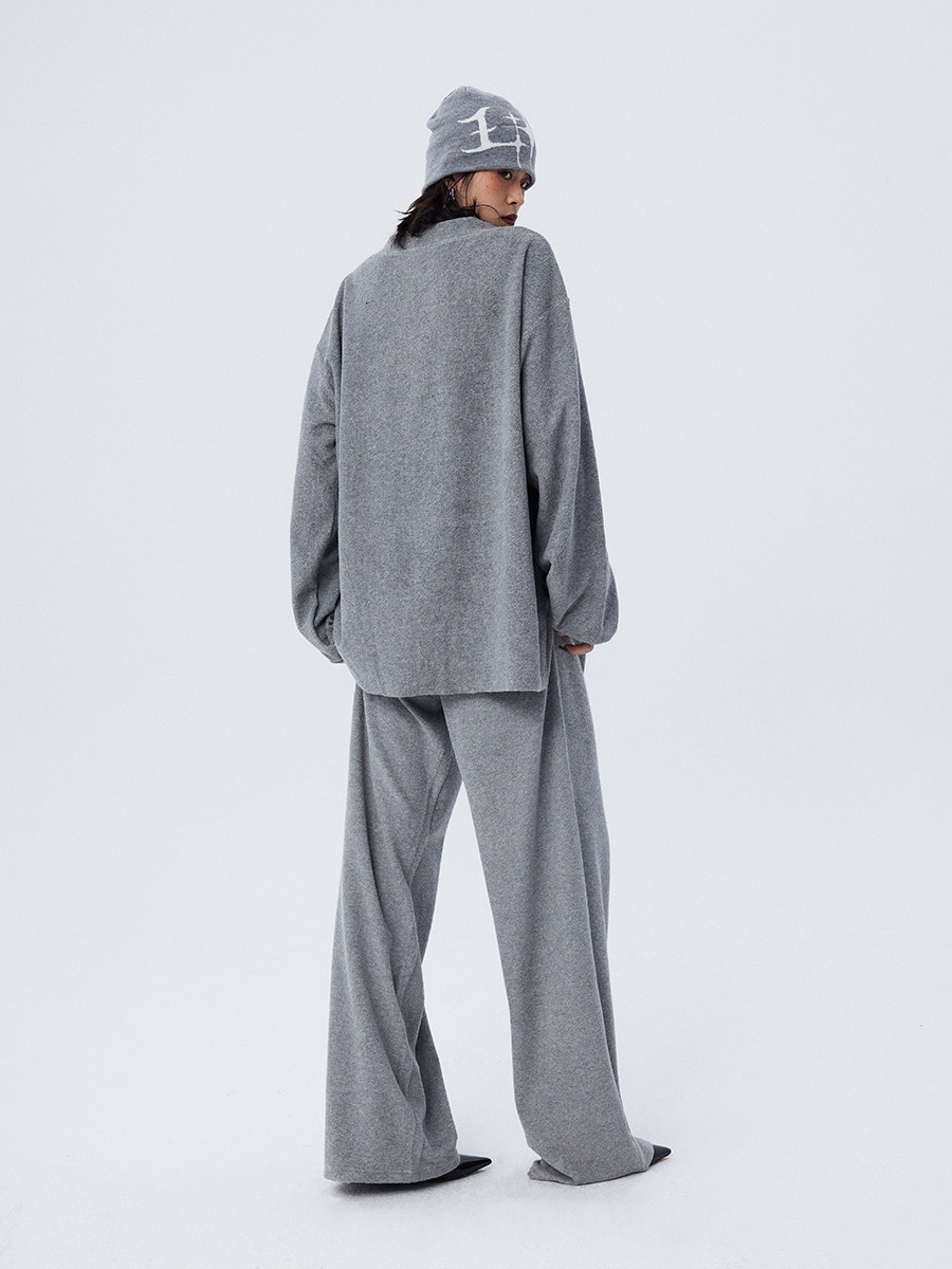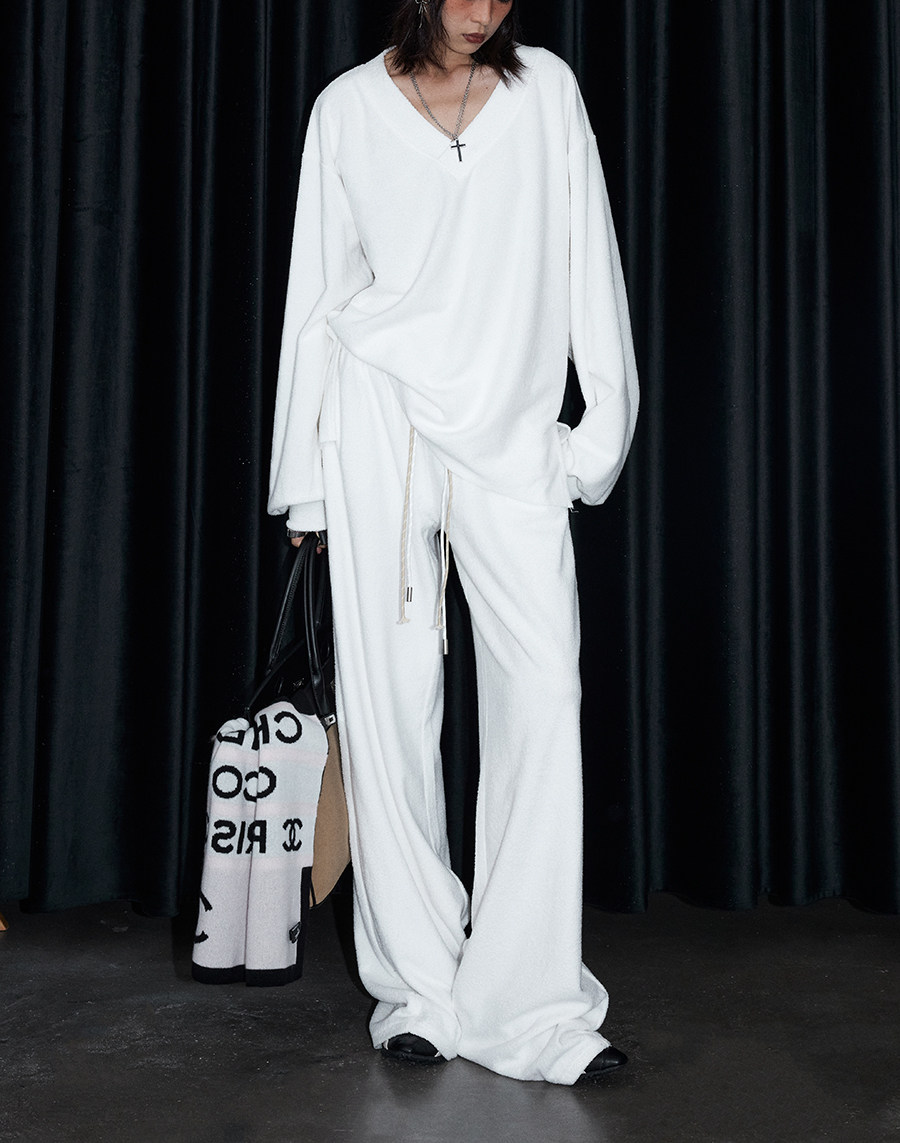Stay stylish and cozy this winter with our loose and soft white gray V-neck terry cloth casual suit top and wide-leg trousers for women. Made with high-quality materials, this suit provides both comfort and style. Perfect for casual outings or relaxing at home.