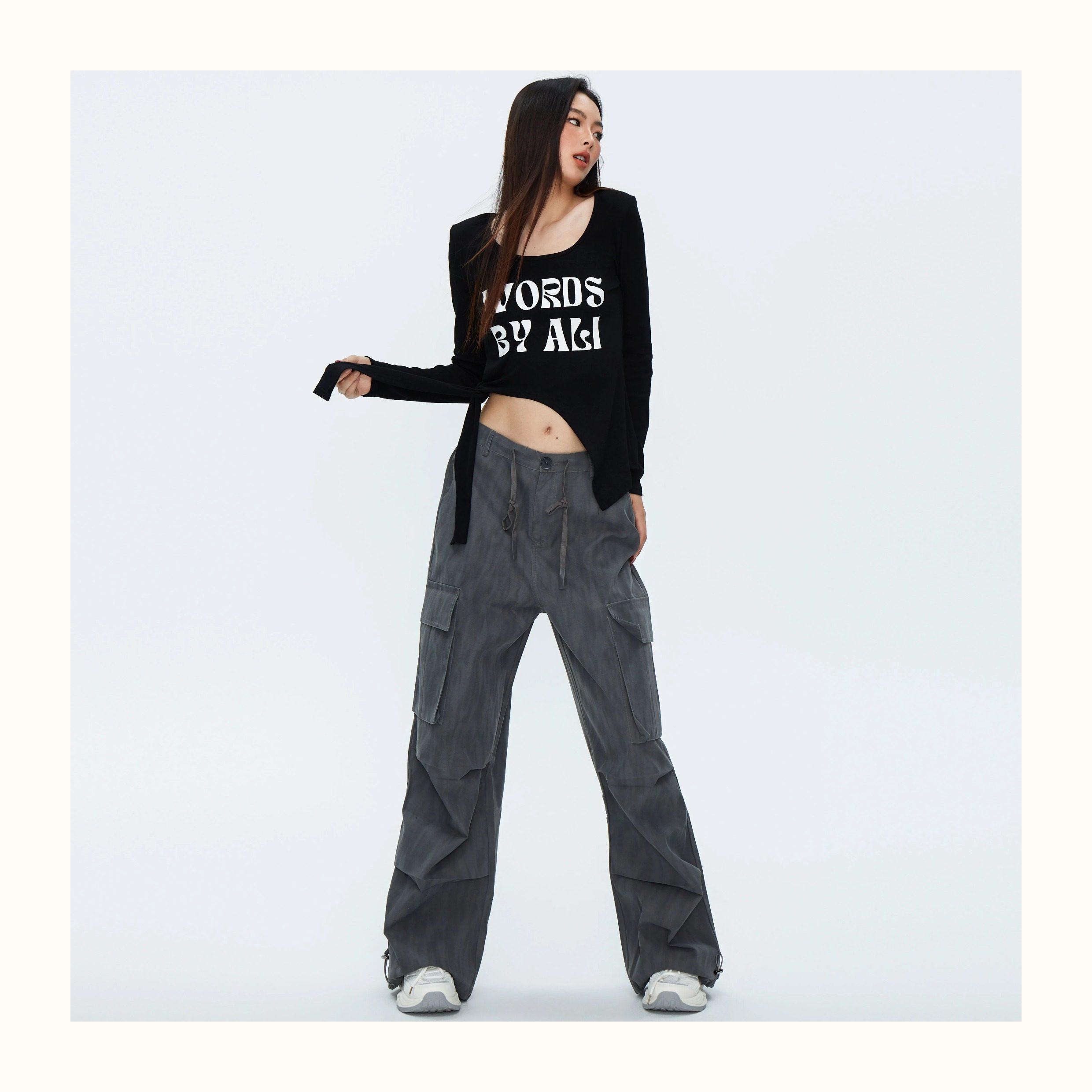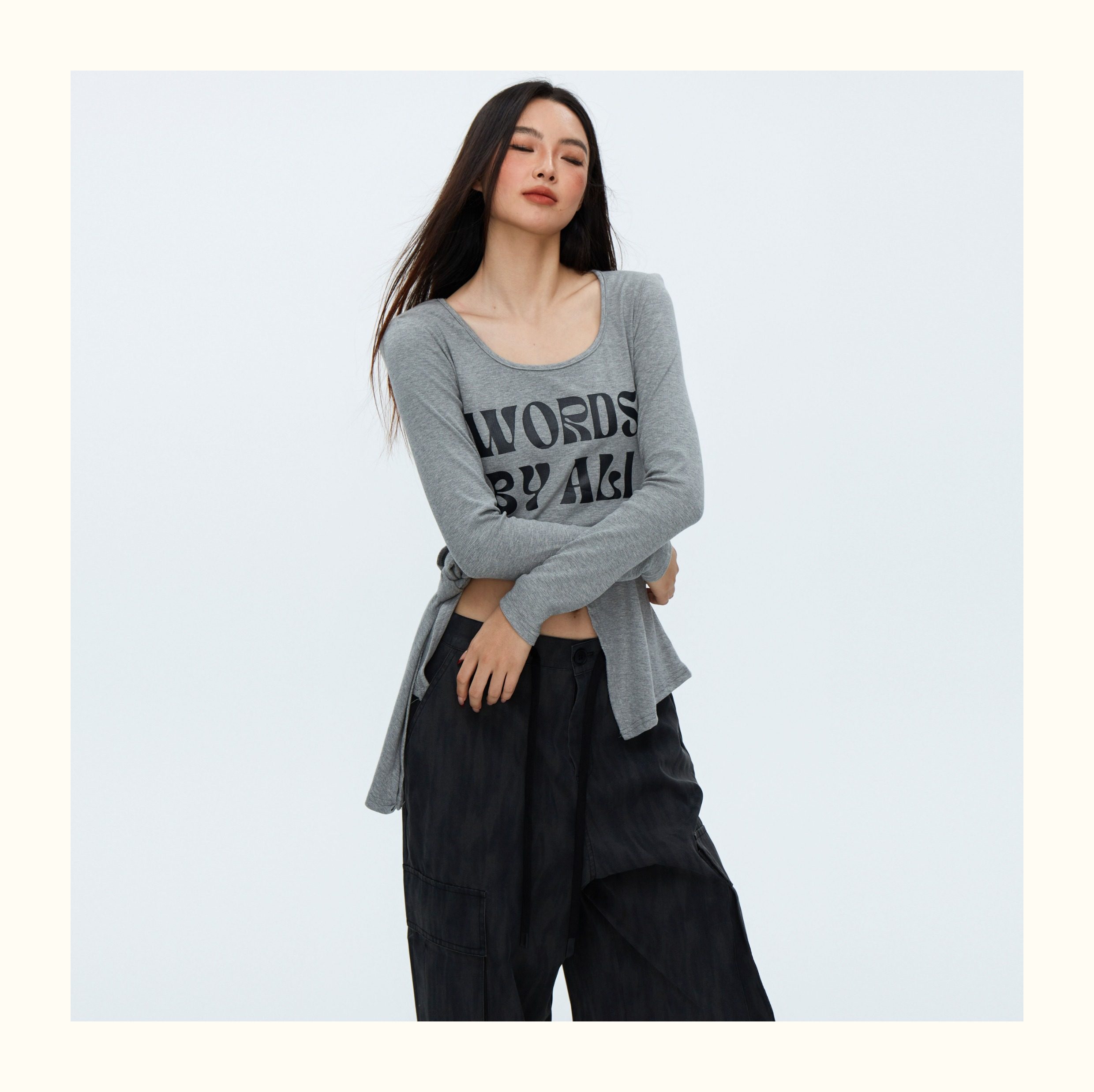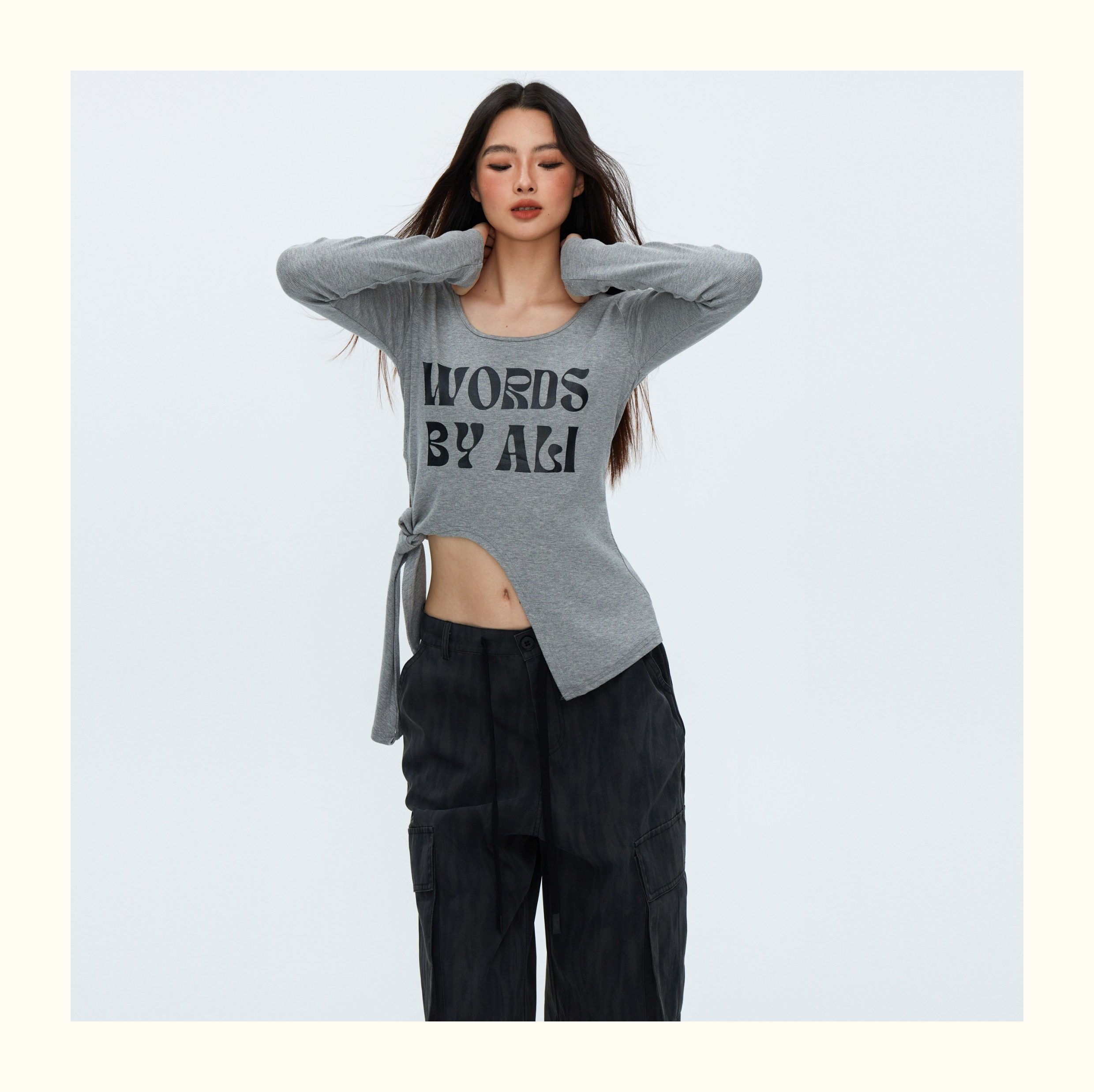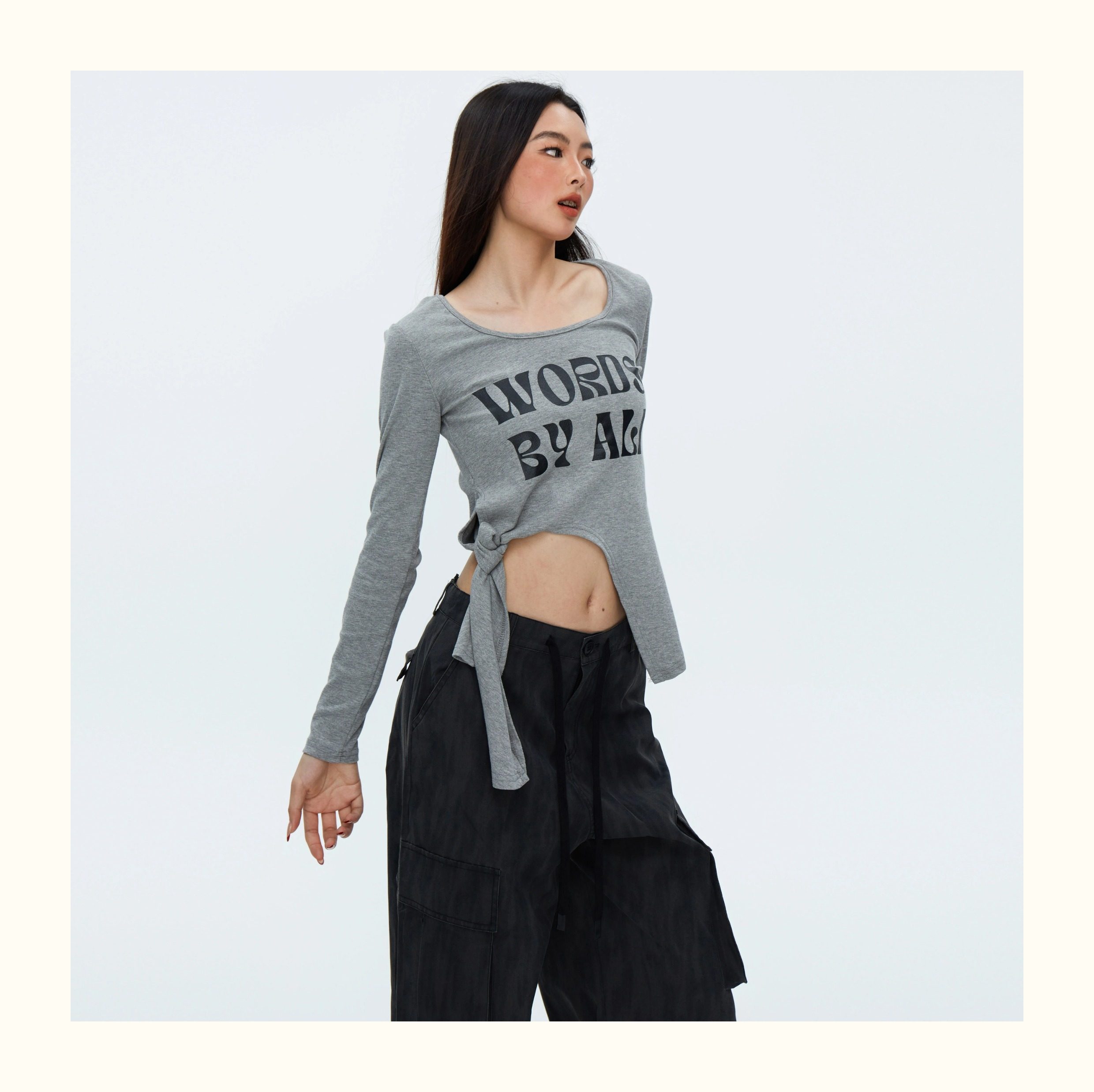 This ribbed top features an alphabet print, padded shoulders, and a slit tie detail. Crafted for comfort and style, this top elevates any look with its unique design and flattering fit. A must-have addition to any fashion-forward wardrobe.