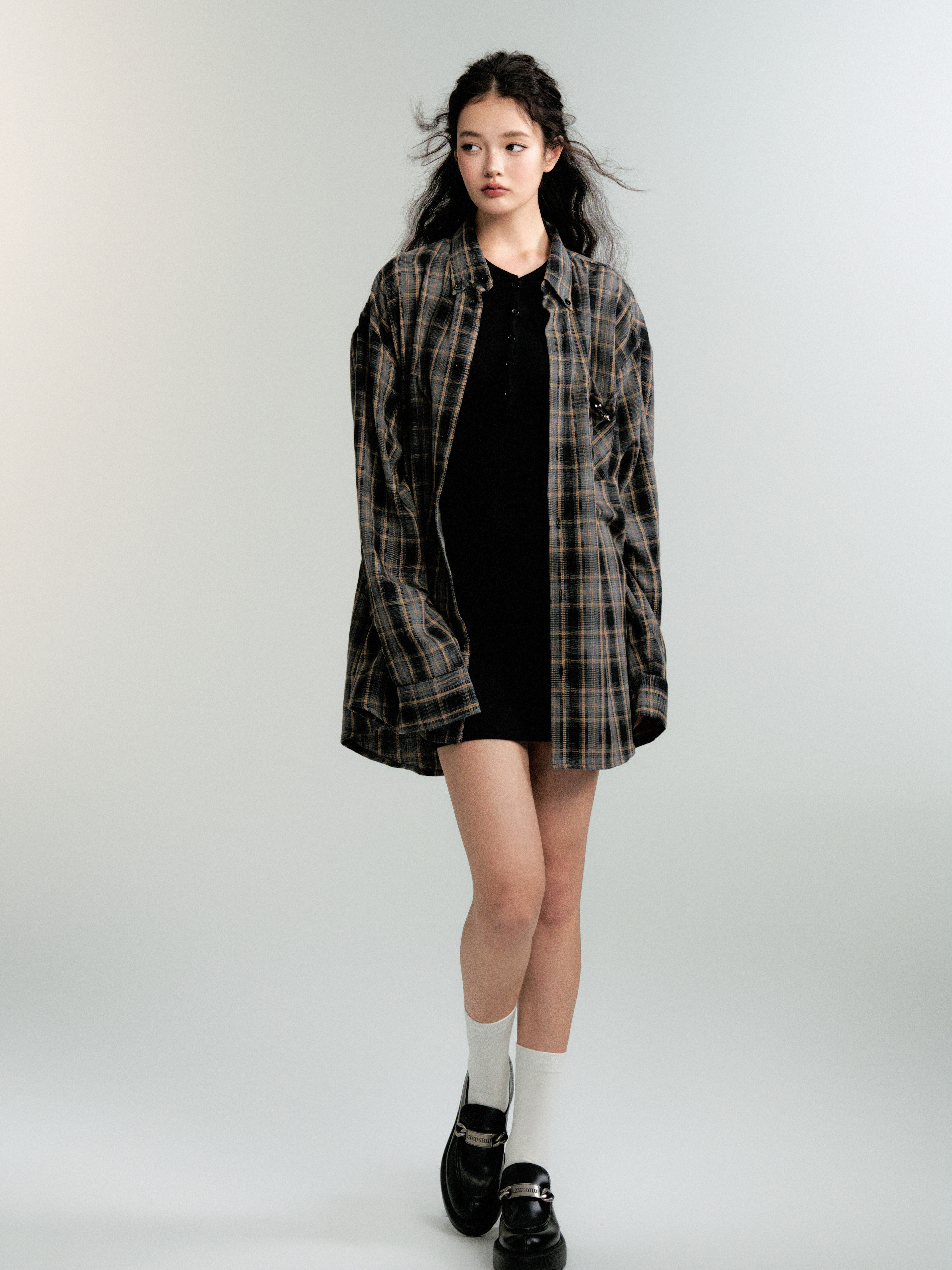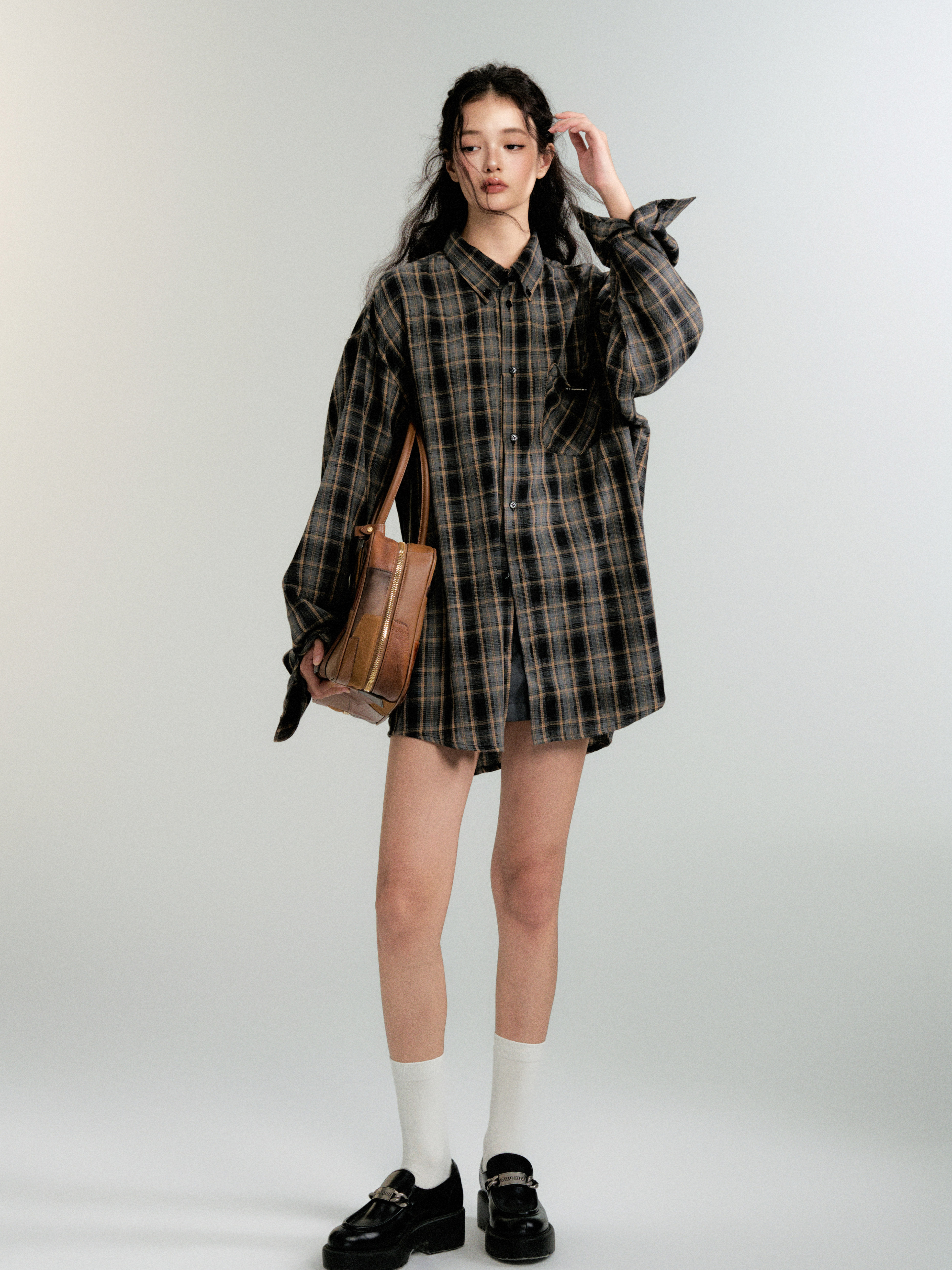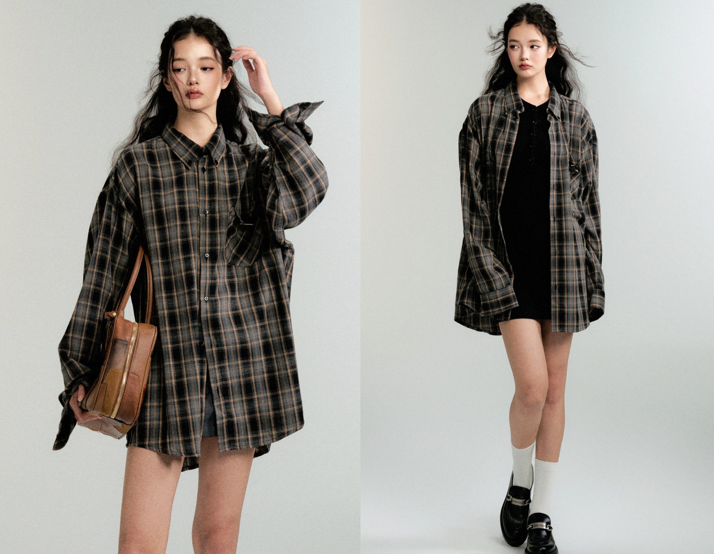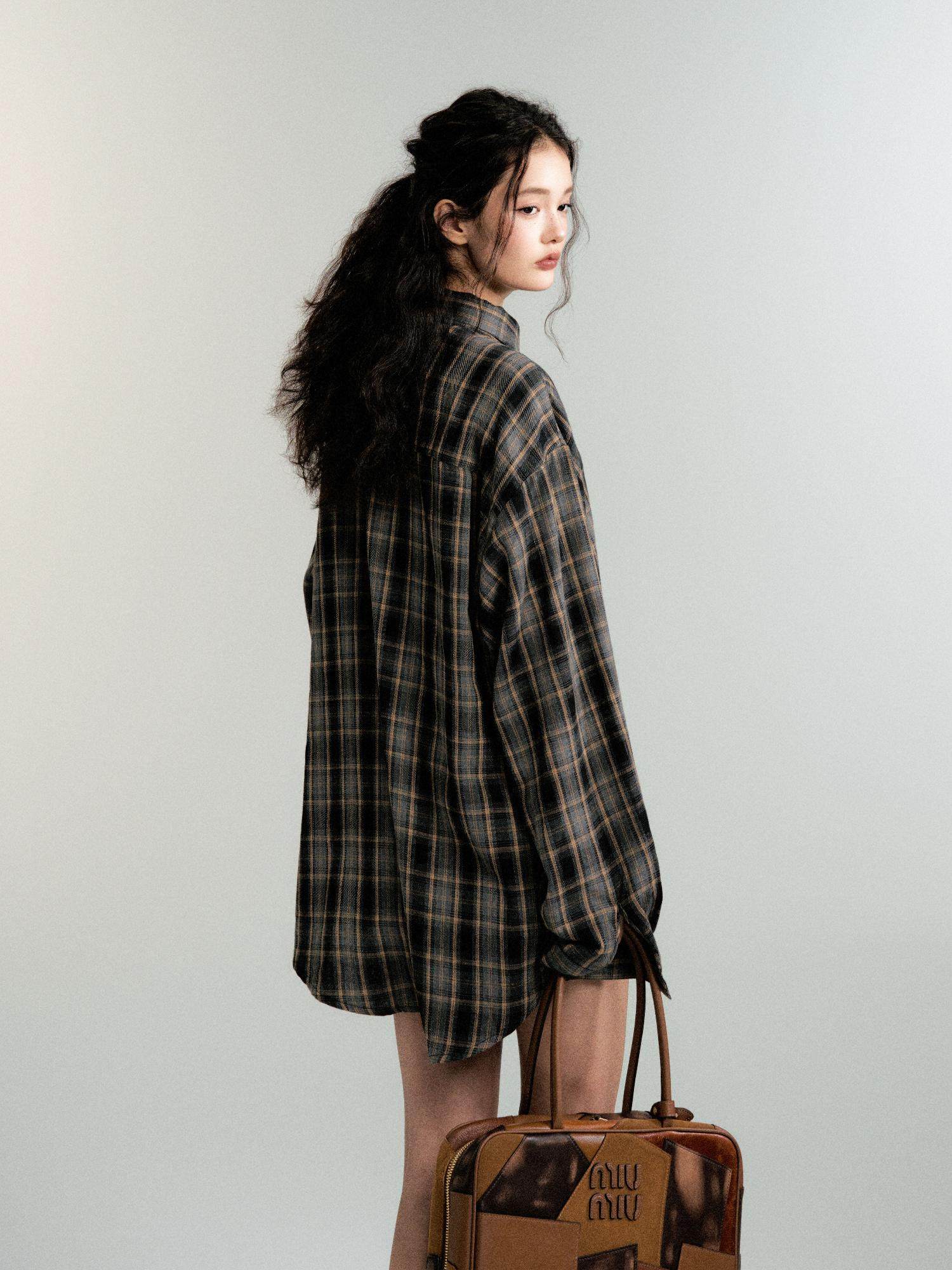 Women's Color-Block Check Retro Loose Long-Sleeved Shirt Jacket