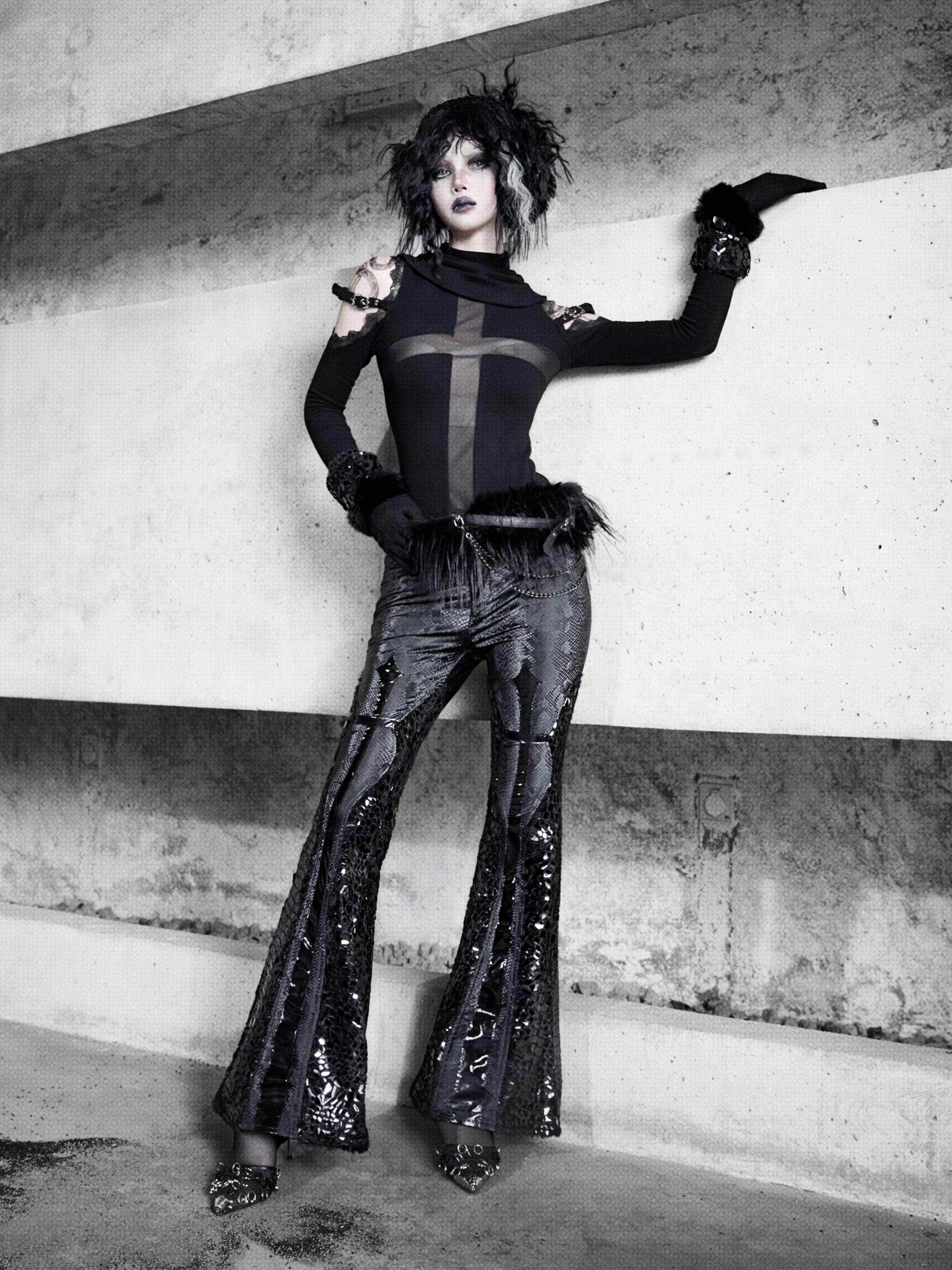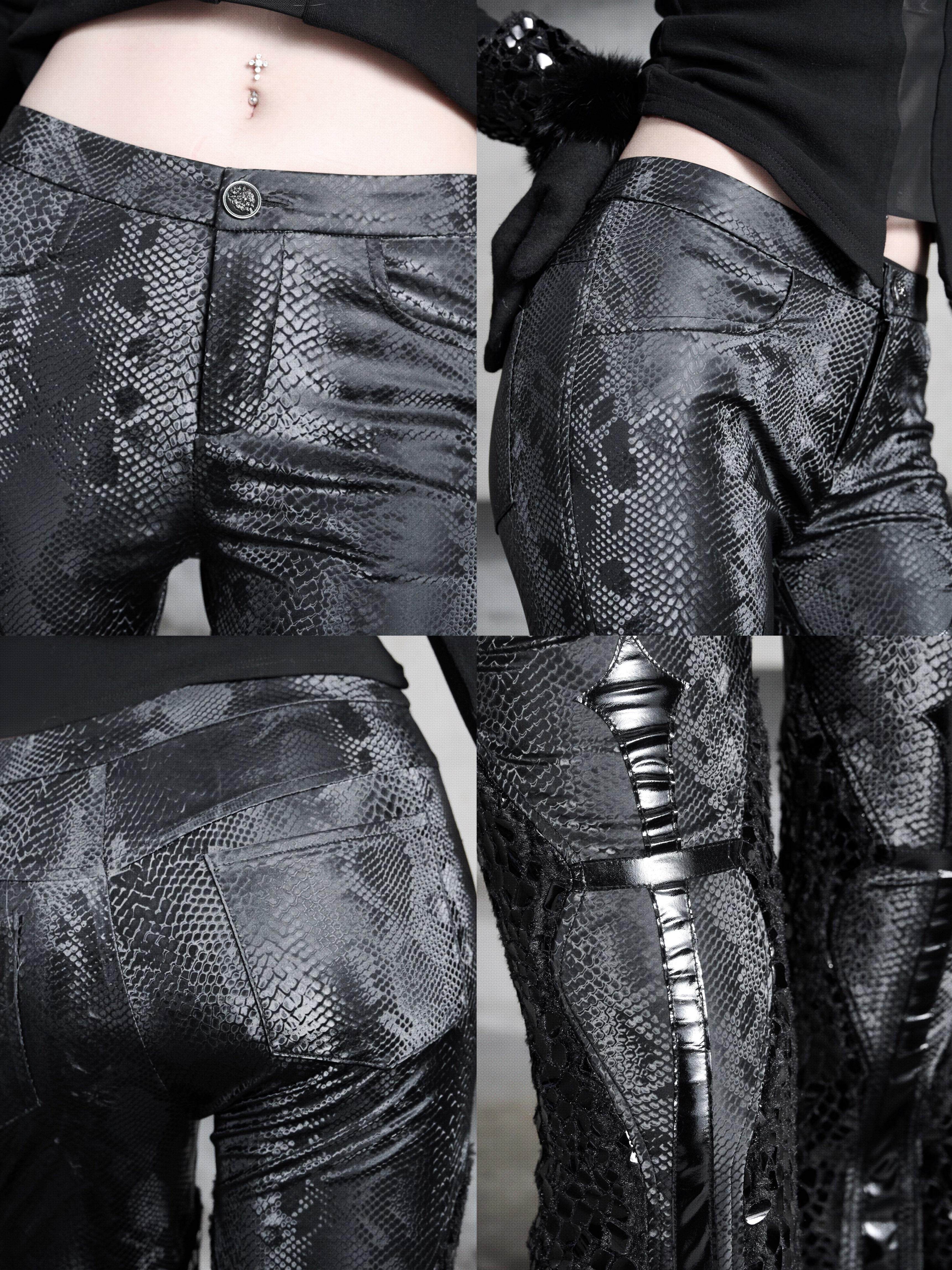 Expertly crafted for a flattering fit, these women's patent leather gothic trousers are a must-have for any fashion-forward wardrobe. With a slim and low-waisted design, these trousers hug your curves while the flared leg creates a bold and feminine silhouette. Perfect for adding a touch of edgy sophistication to any outfit.
