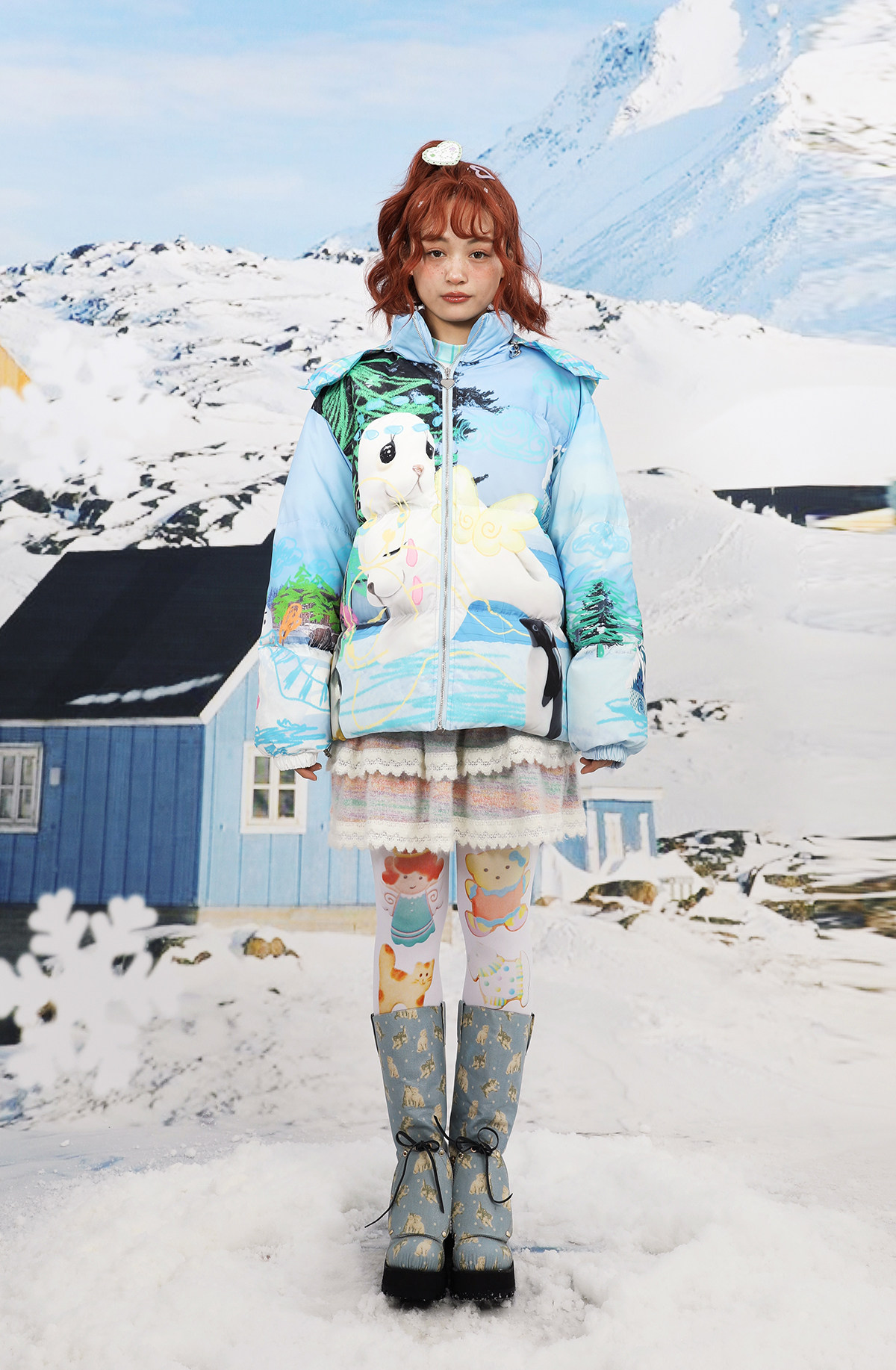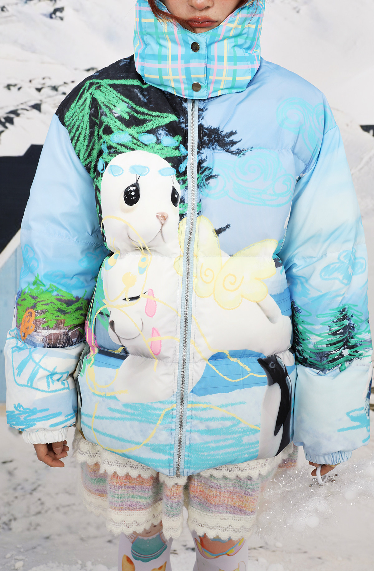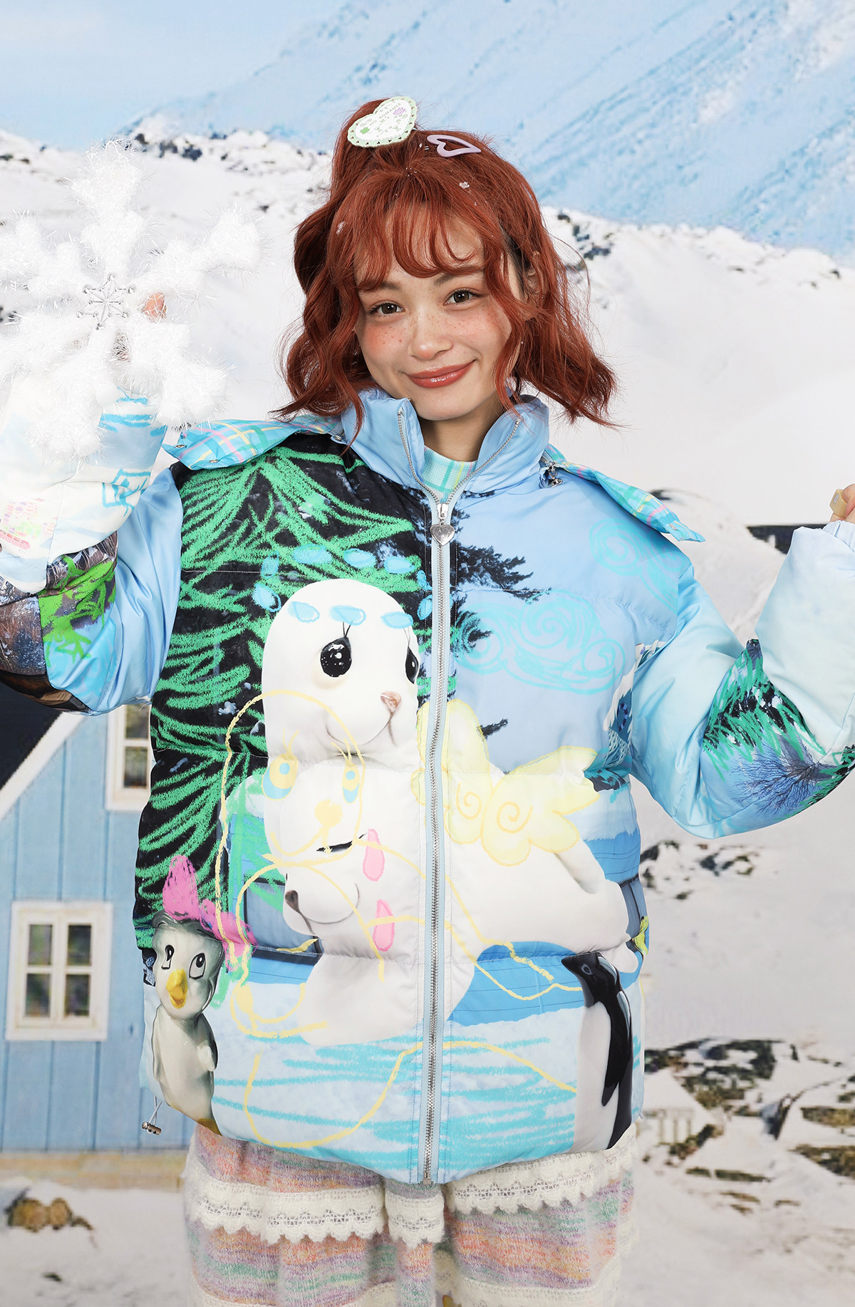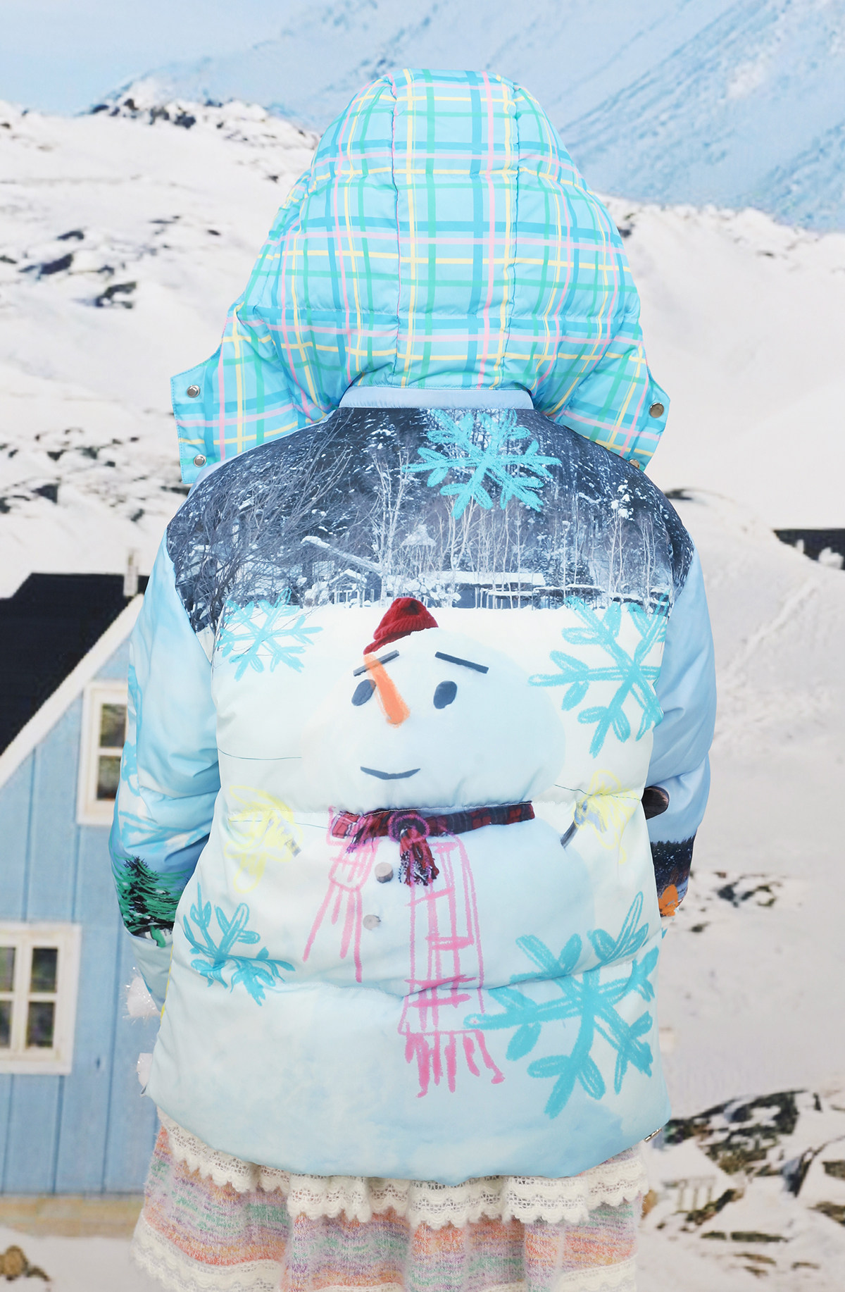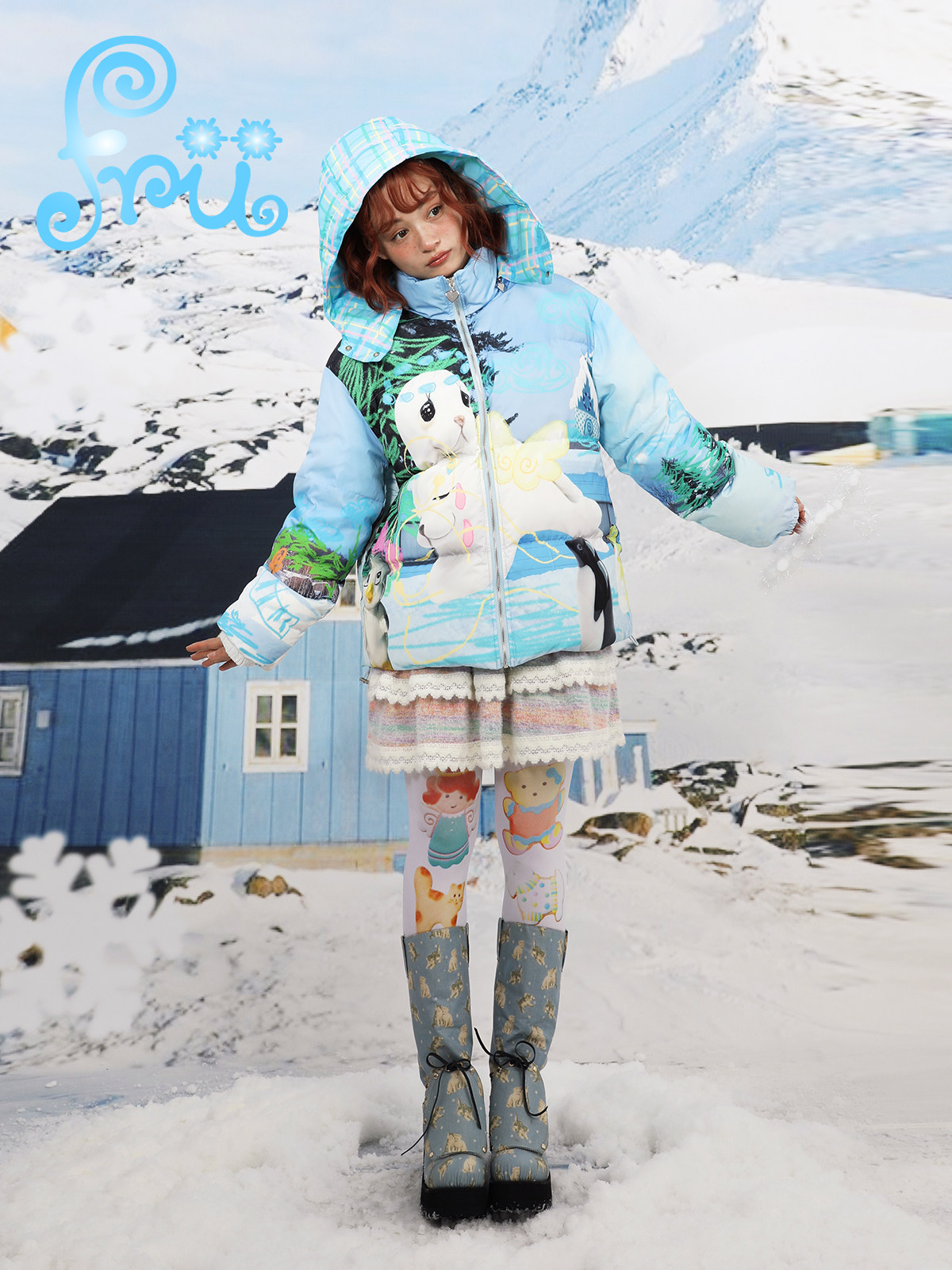 Women's Blue Snowman Print White Duck Down Warm Down Jacket