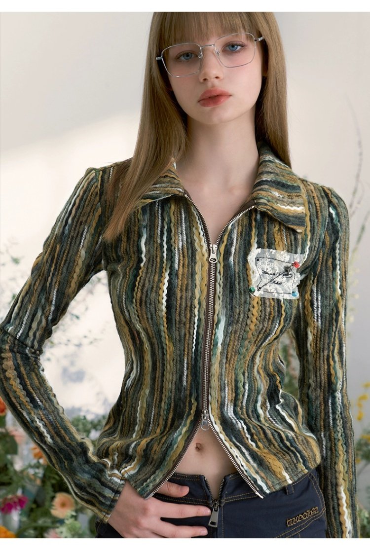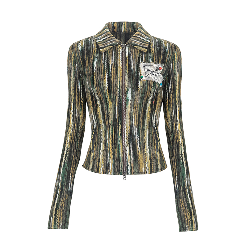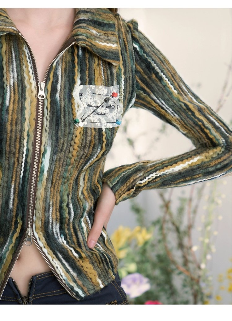 Women's Vintage Floral Print Zip Cable Knit Cardigan (Beige)