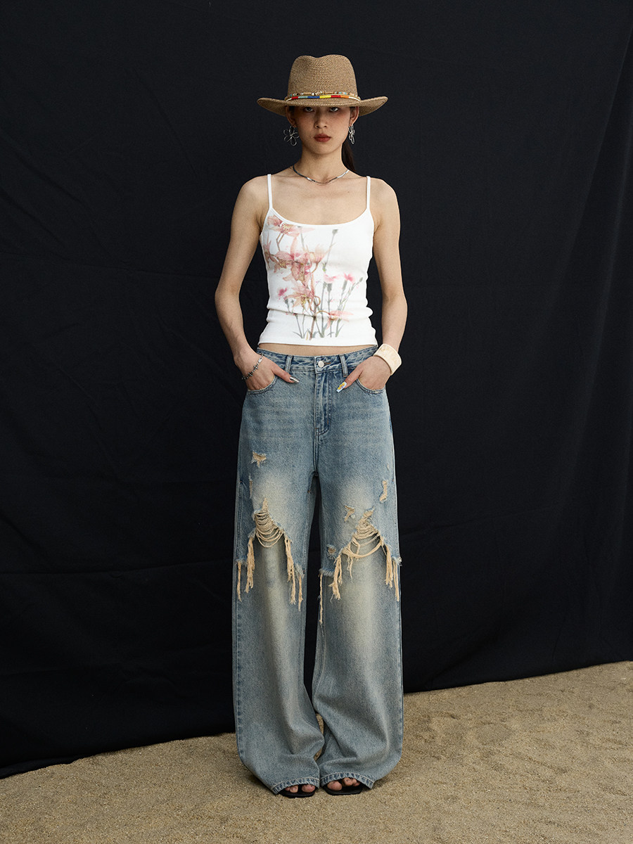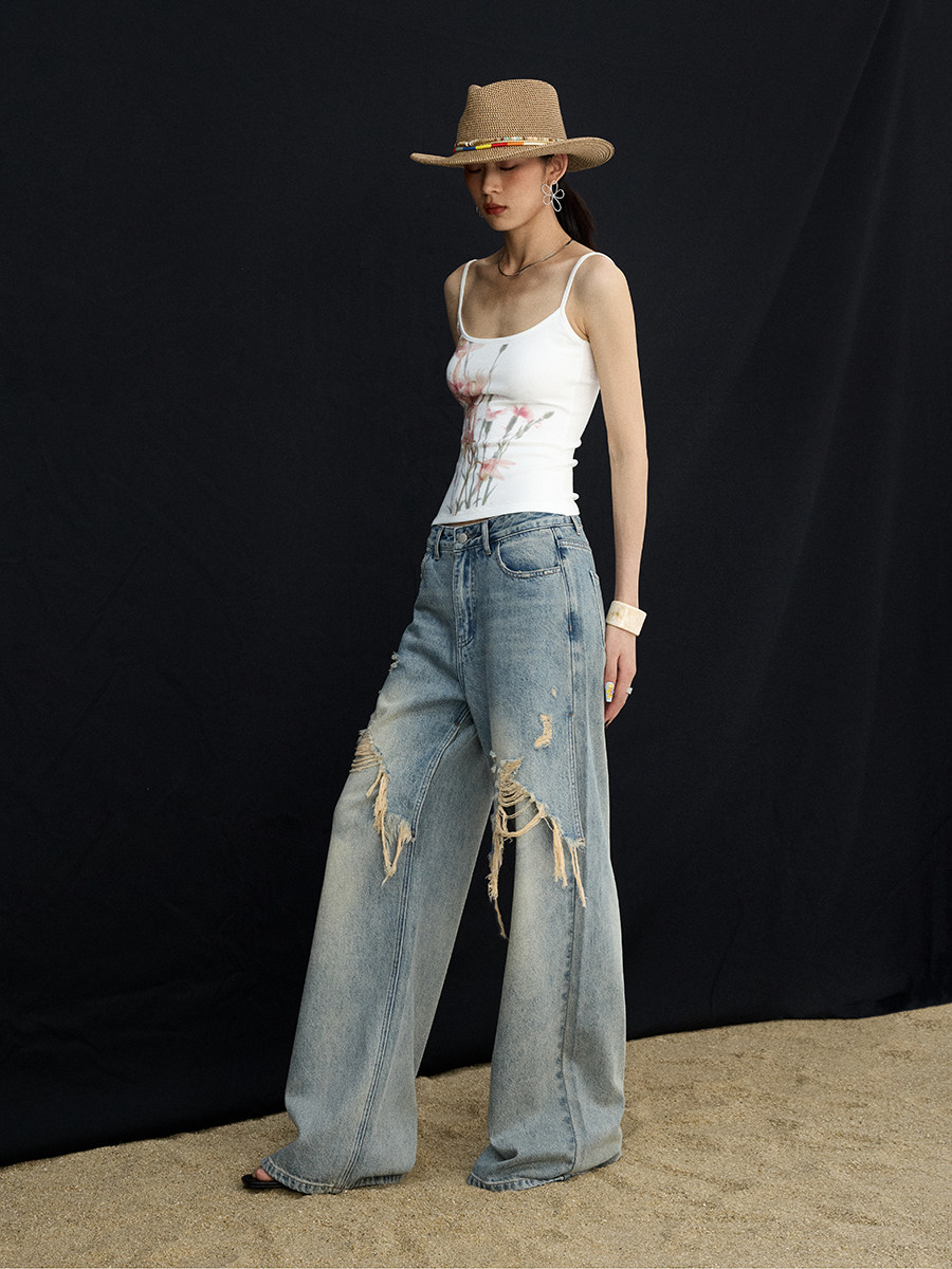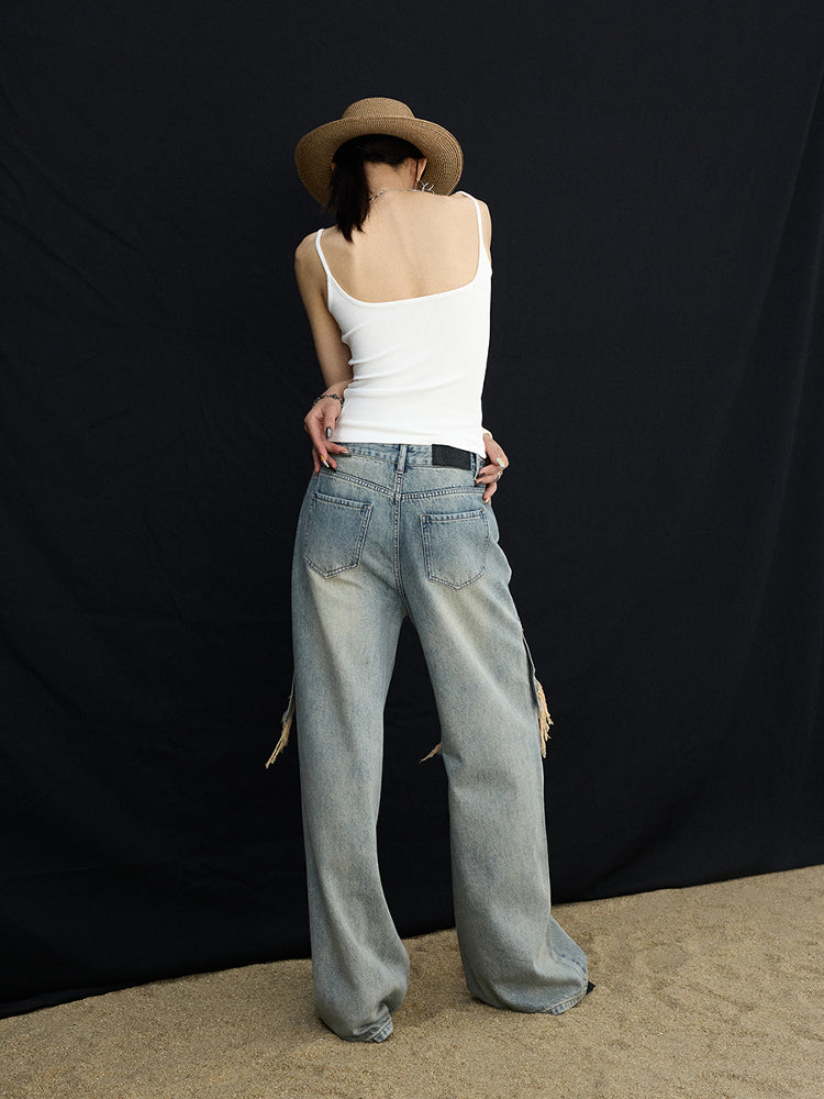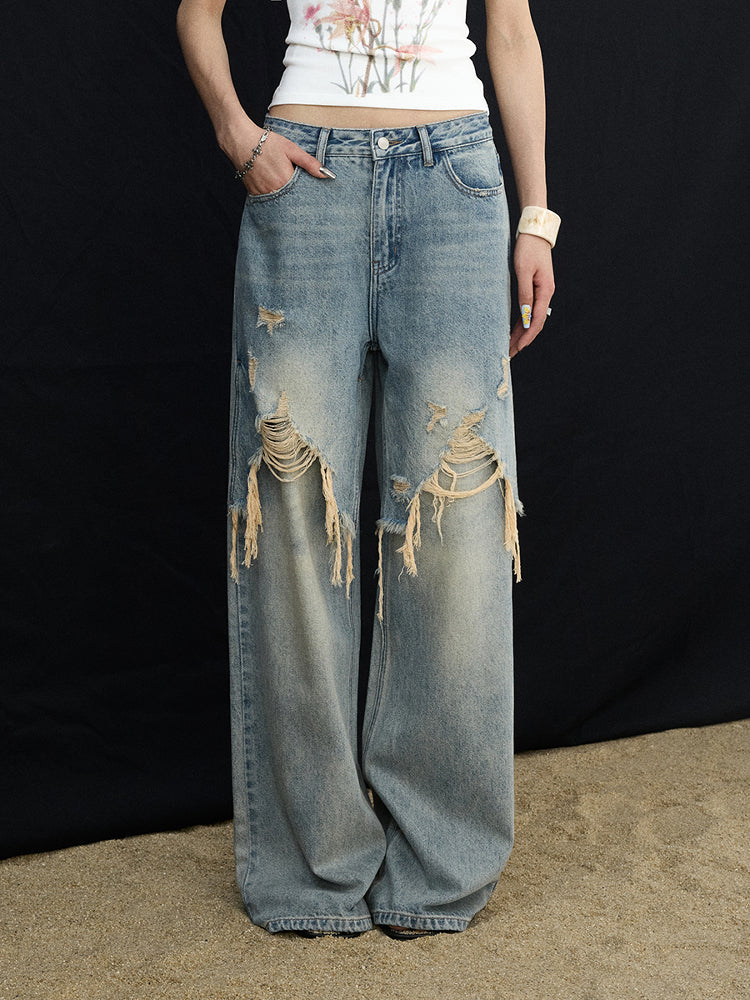 Washed Blue Wide-Leg Jeans Raw Hem & Layered Look