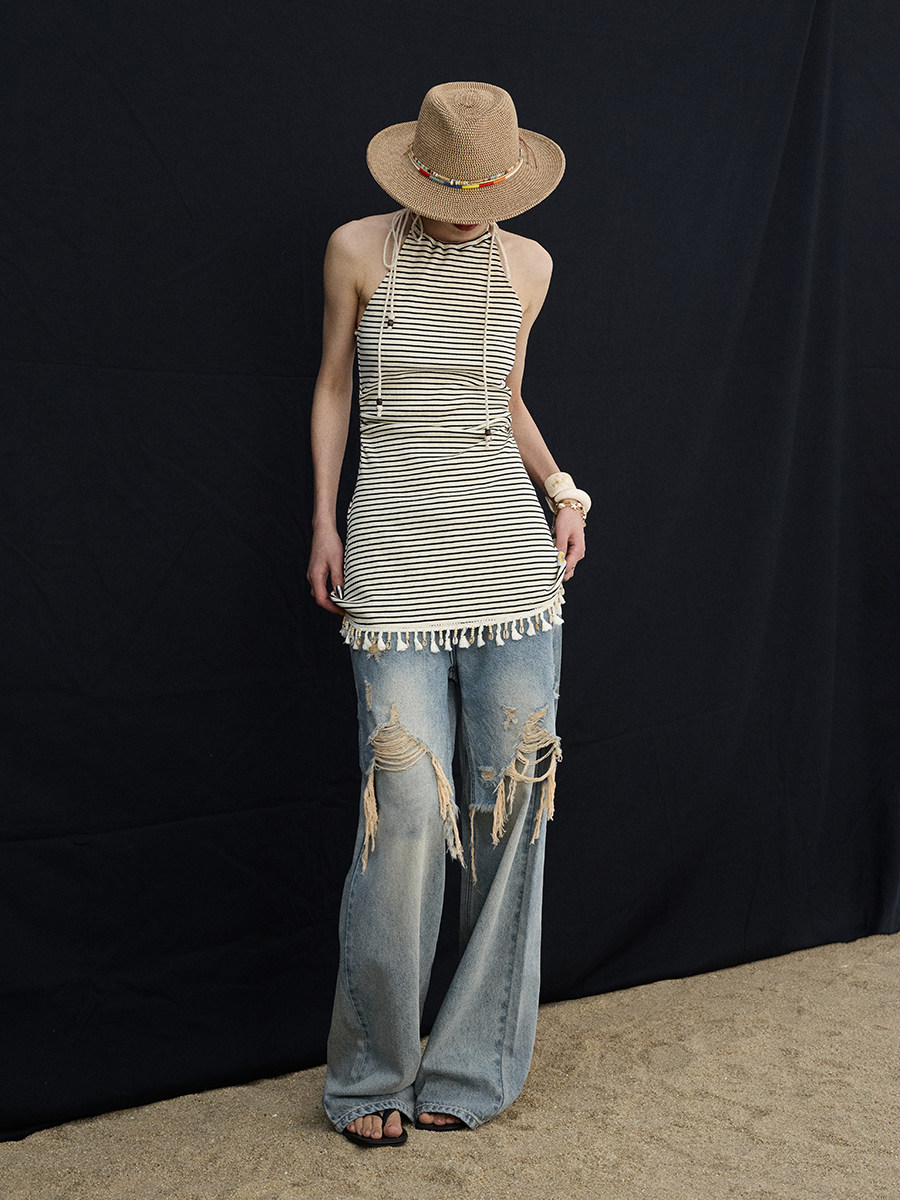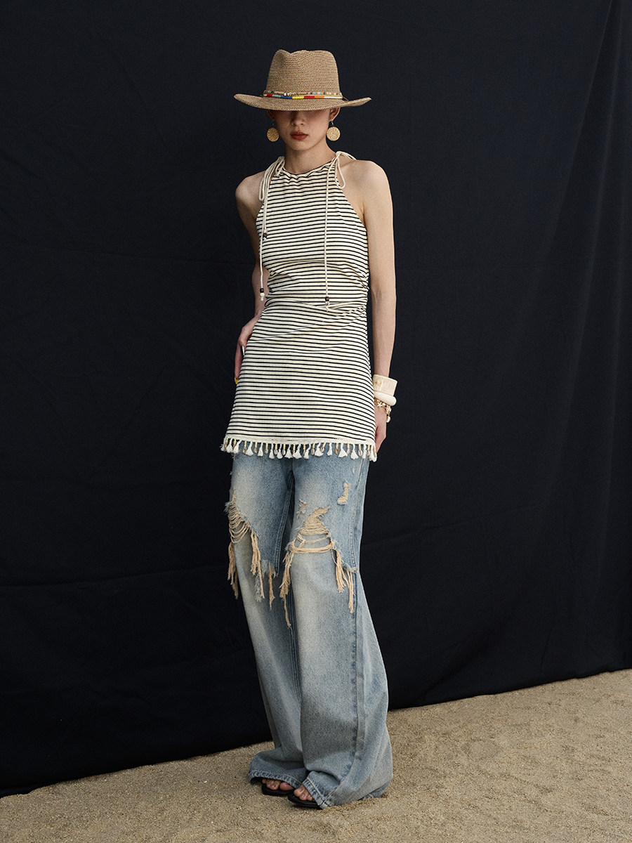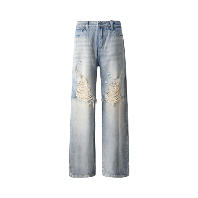 Washed Blue Wide-Leg Jeans Raw Hem & Layered Look