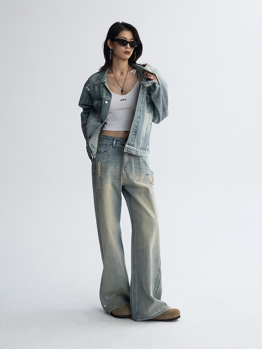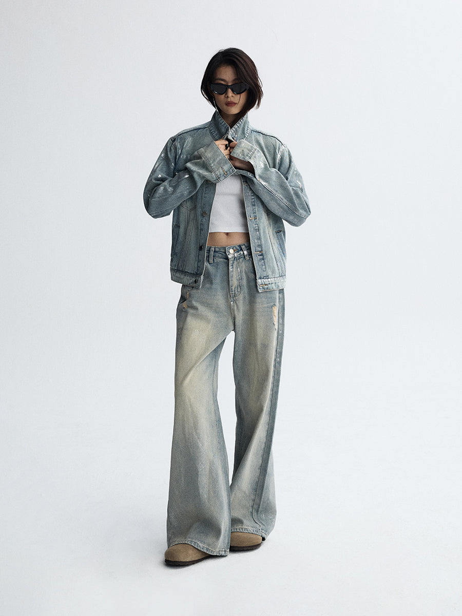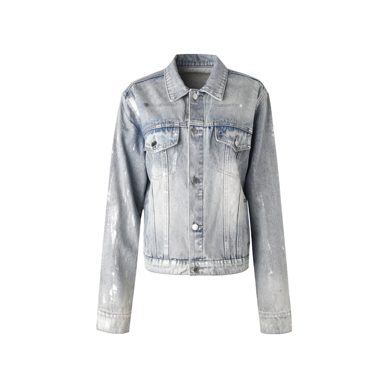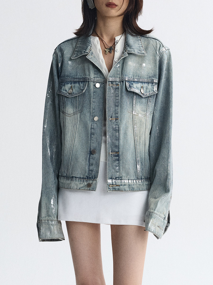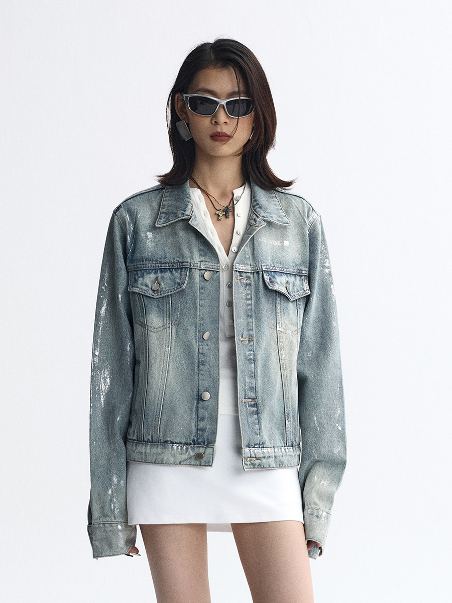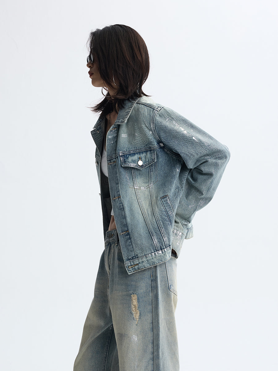 Women's Washed Blue Short Denim Jacket Hand-Stamped Silver Detail